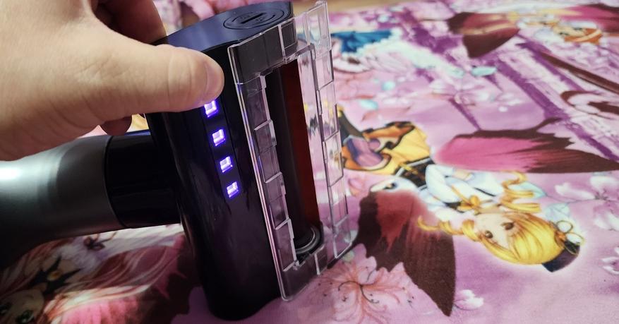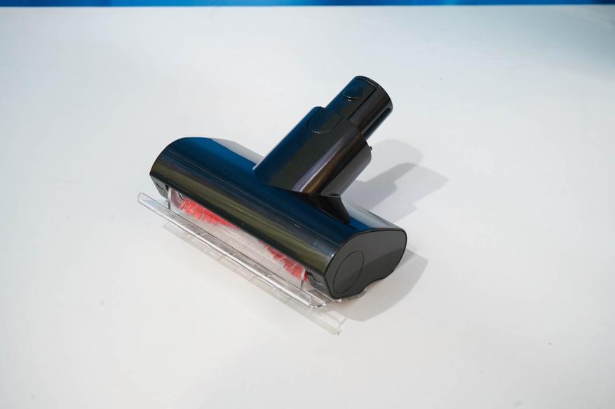 Дополнительная мини насад из комплекта позволяет обновить обивку мягкой мебели и пропылесосить матрасы. За счет уменьшенного размера рабочей части давление всасывания в ней чуть выше, чем в универсальной насадка, а плотное прилегание позволяет извлекать пыль, глубоко засевшую в обивке. Отмечу съемный ролик и УФ-подсветку в нижней части насадки.