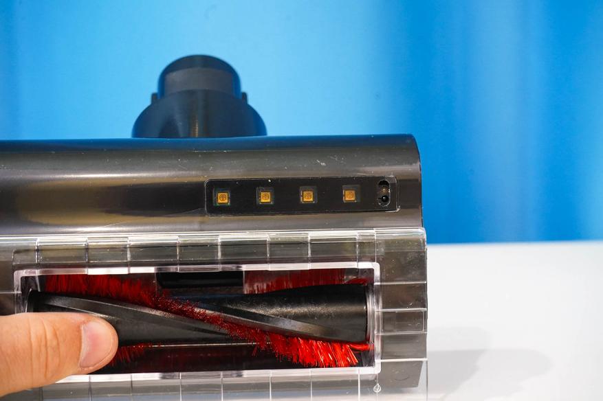 Обратил внимание на работу ультрафиолетовой подсветки в данной насадке. Что характерно — срабатывает на приближение к поверхности, на которой будет происходить уборка. В рядом с линейкой светодиодов установлен оптический датчик приближения, при перекрывании которого срабатывает УФ-излучение.