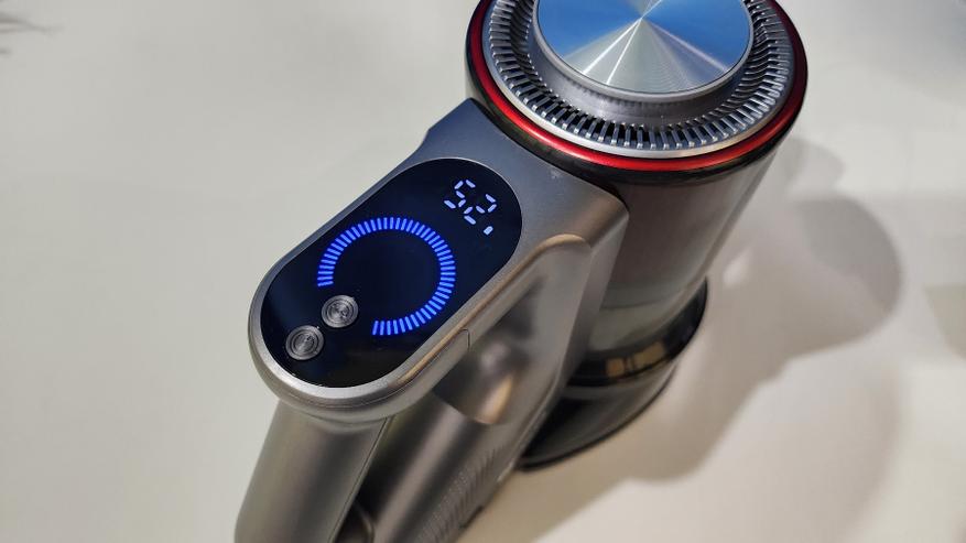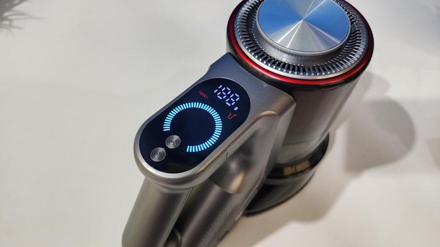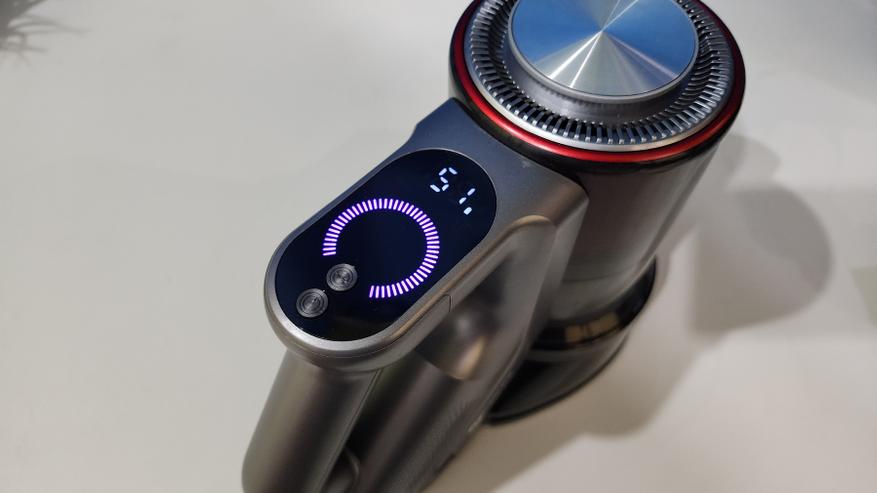 Достаточно интересно выполнена индикация и управление пылесосом Neatsvor G10. Включение и выбор режимов осуществляется двумя кнопкам расположенным таким образом, что можно управлять и нажимать одной рукой. В центре дисплея размещается цветной кольцевой индикатор, позволяющий оценить выбранный режим. Чуть выше кольцевого индикатора расположен сегментный дисплей, отображающий остаток заряда батарейного блока. Отмечу пару «значков», которые дают информацию пользователю о блокировке роликовой щетки или о застревании предметов в трубке.