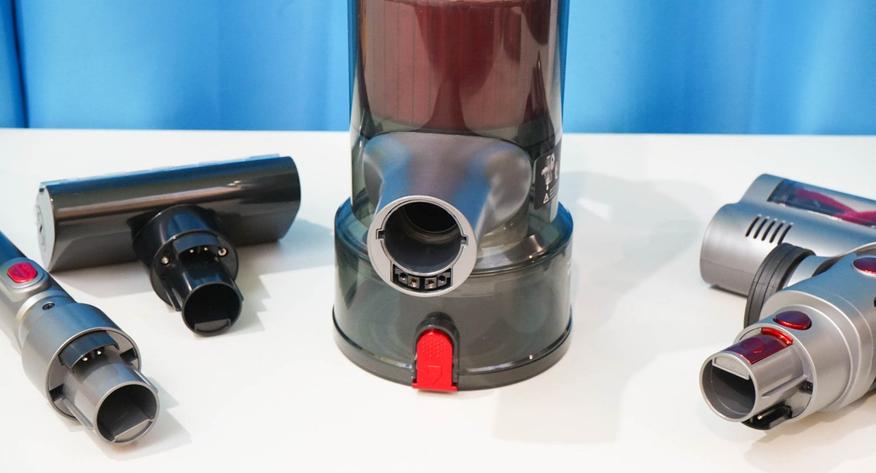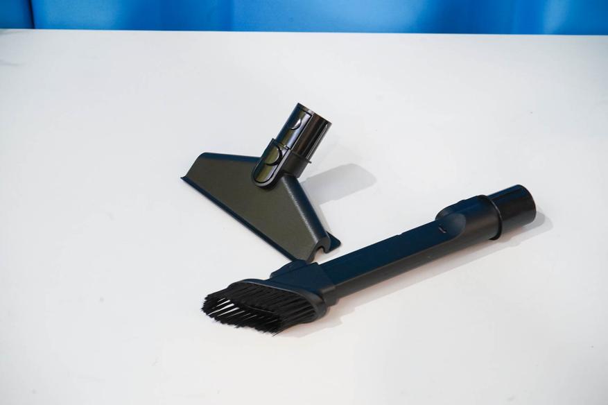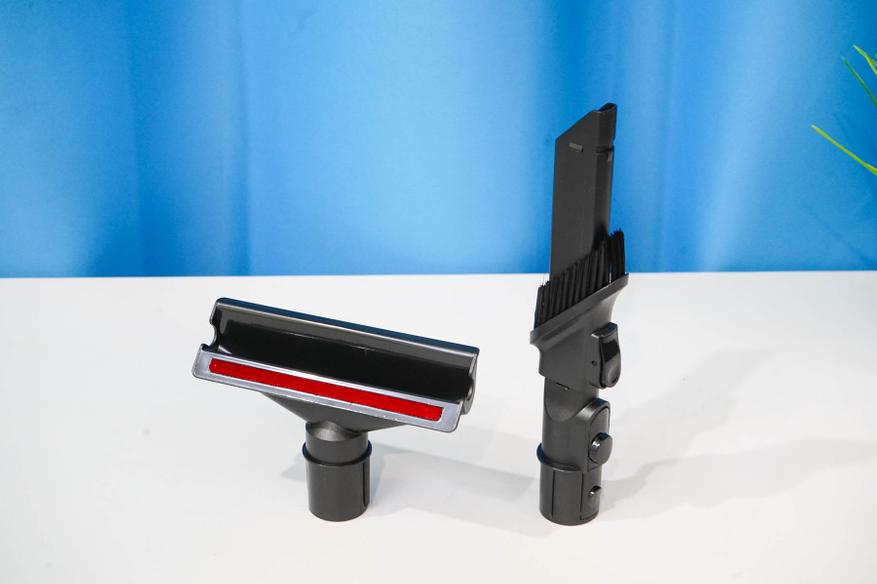 В комплекте с пылесосом поставляются две ручные насадки: узкая и широкая. Производитель позиционирует широкую насадку в качестве насадки для уборки мягкой мебели и матрасов. Благодаря красной тканевой вклейке эта насадка легко скользит по ткани. Узкая насадка представляет собой «носик» с подвижной щеточкой. Позволяет добираться до мусора в углах/за мебелью/в узких места.
