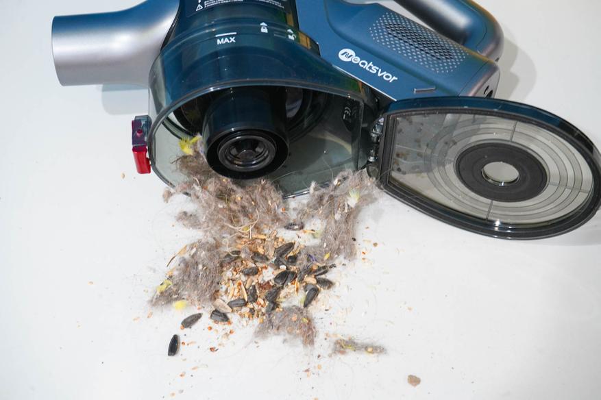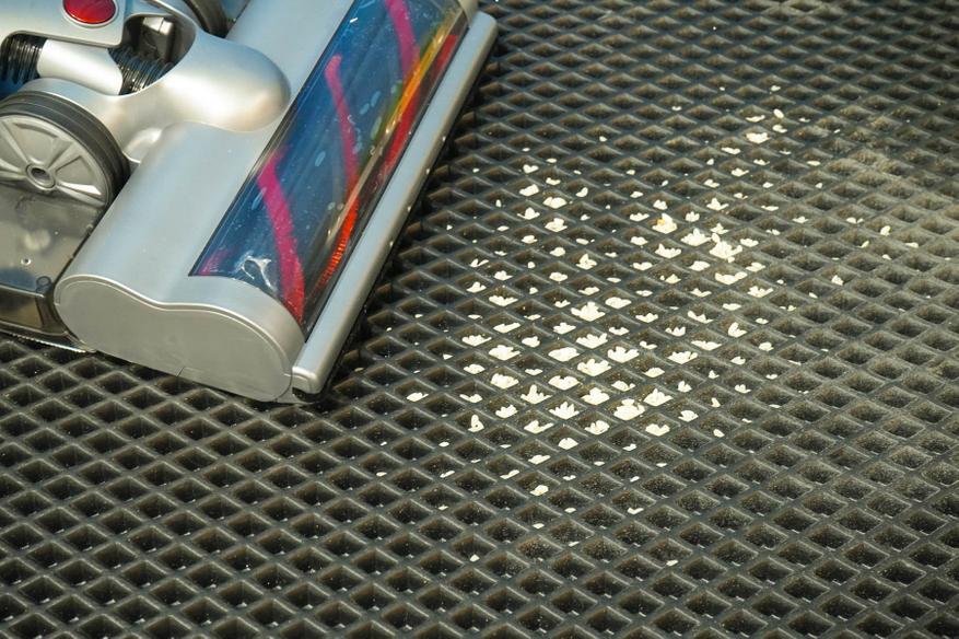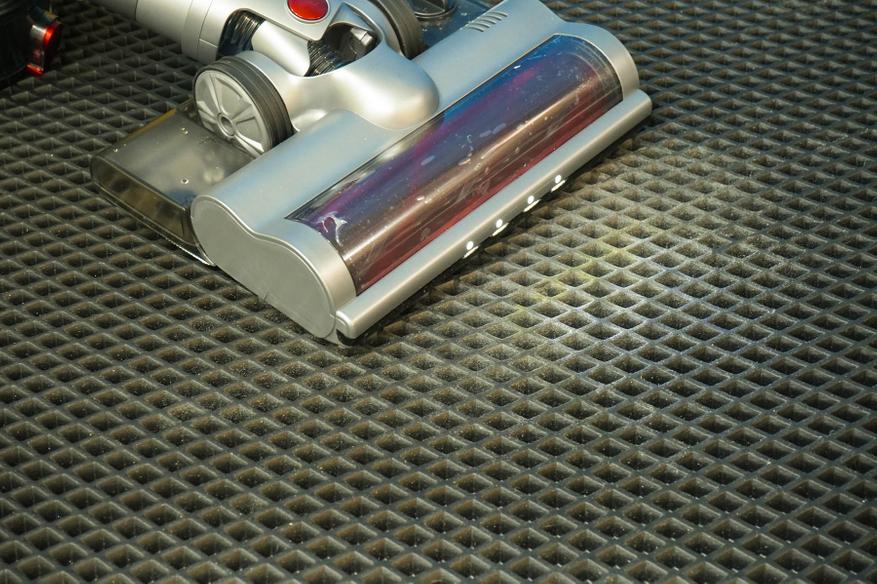 Первоначально сделал стандартный тест, чтобы посмотреть, как справляется пылесос на сложной рельефной поверхности с мелким мусором, размещенным в углублениях. На маленькой «скорости» сила всасывания недостаточная (остается мусор), а если прибавить мощности, то пылесос вполне справляется — собрал все без остатка.