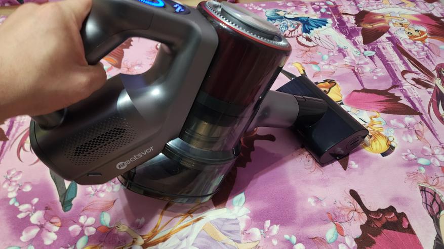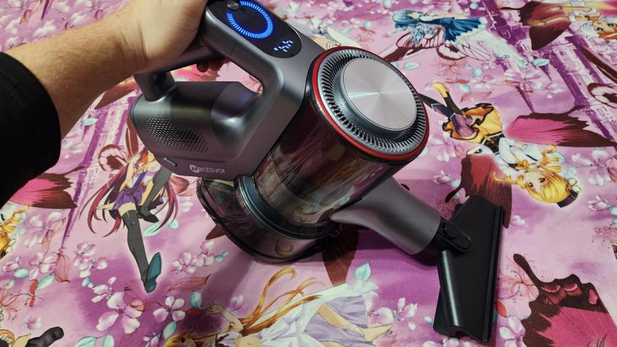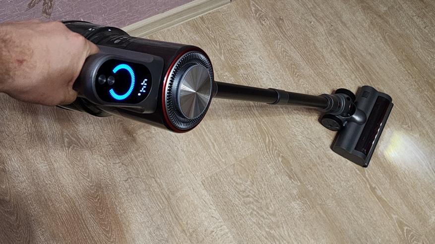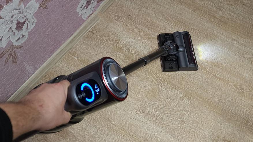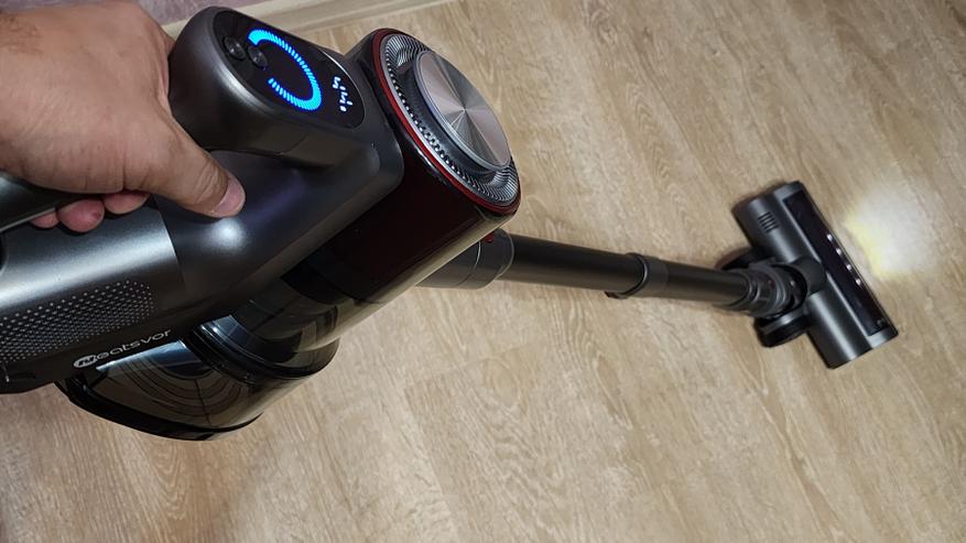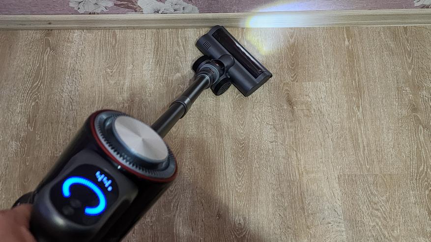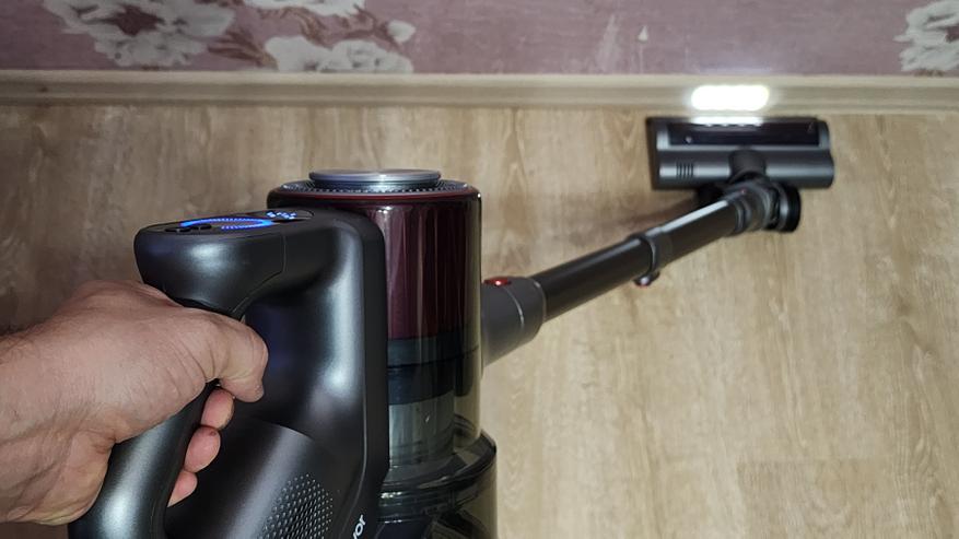 Пылесос Neatsvor G10 в меру лёгкий, довольно маневренный, управлять им удобно, слегка наклоняя в стороны при уборке. Подсветка помогает при уборке, например, под тумбочкой/столом или под кроватью.