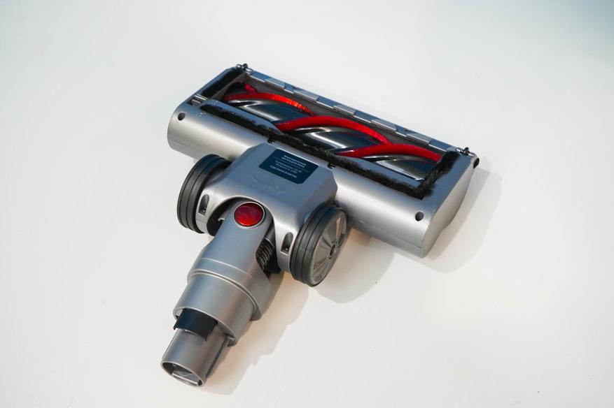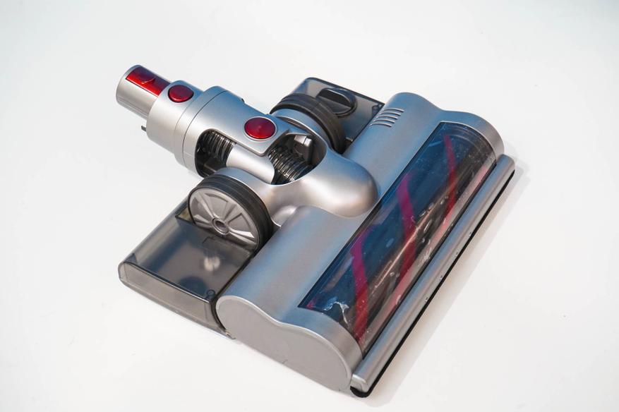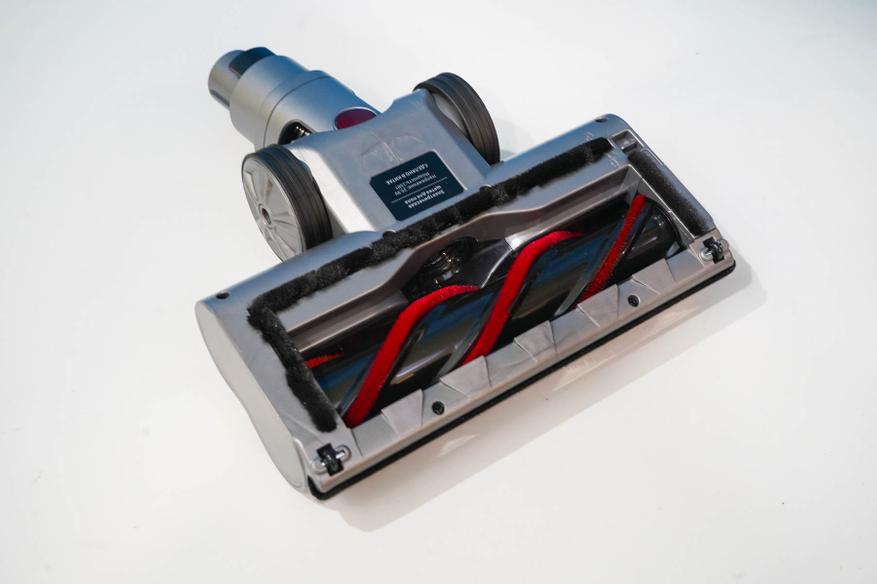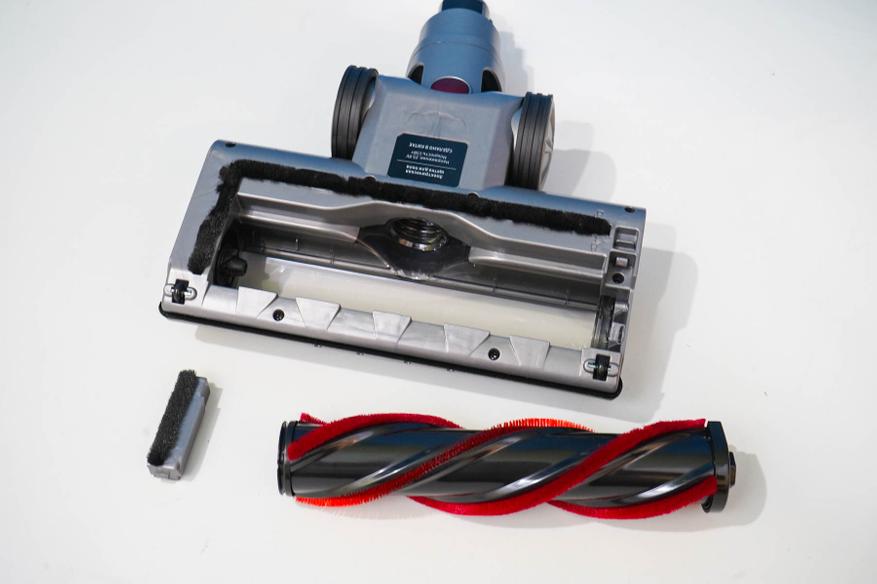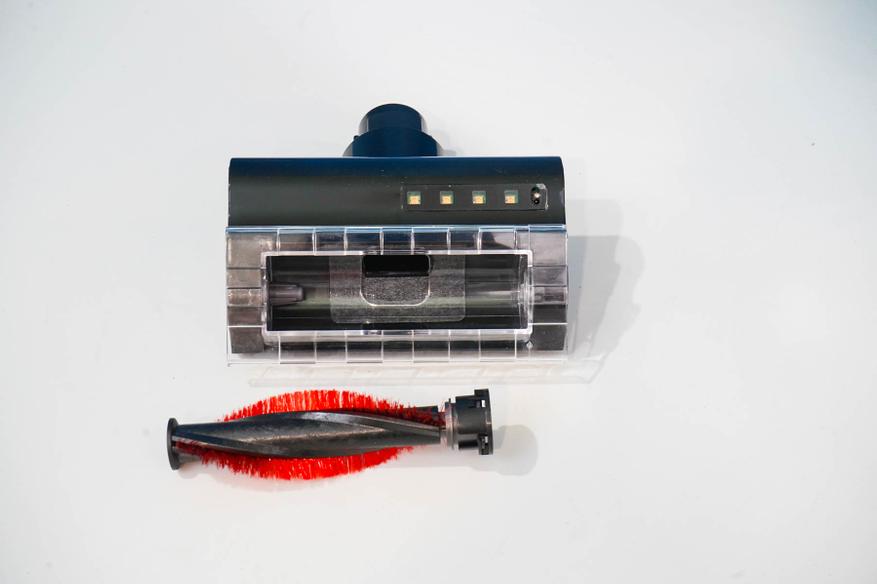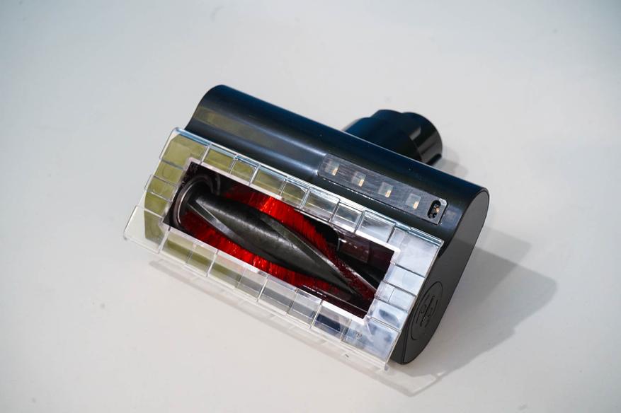 Основная насадка является универсальной и предназначена для уборки как твердых полов, так и для ковролина/для ковров. Профиль ролика напоминает резьбу винта и оснащается вставками с жесткими щетинками. Такое решение позволяет сметать волосы и шерстинки животных, например, с ковра. Конструкция разборная — ролик можно извлечь из корпуса насадки. Отмечу светодиодную подсветку, которая расположена в основании основной насадки. Что такое подсветка зоны уборки и зачем она нужна можно посмотреть в этой статье.