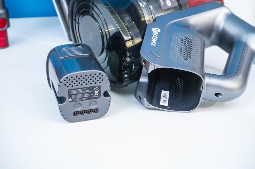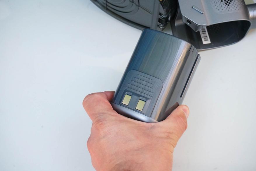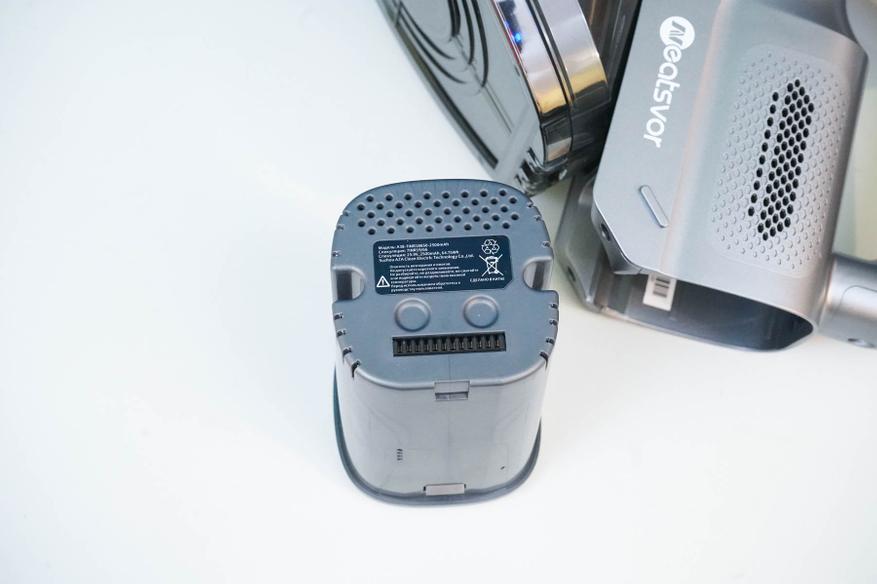 Как я уже сказал выше, пылесос Neatsvor G10 комплектуется съемным батарейным блоком. Это сборка с балансиром и контактами для настенной зарядки, с артикулом 7INR19/66 (7 элементов внутри INR18650 по 2500 мАч, рабочее напряжение 25.9 Вольт) и ёмкостью 64.75 Втч. Устанавливаю на штатное место перед началом тестов.