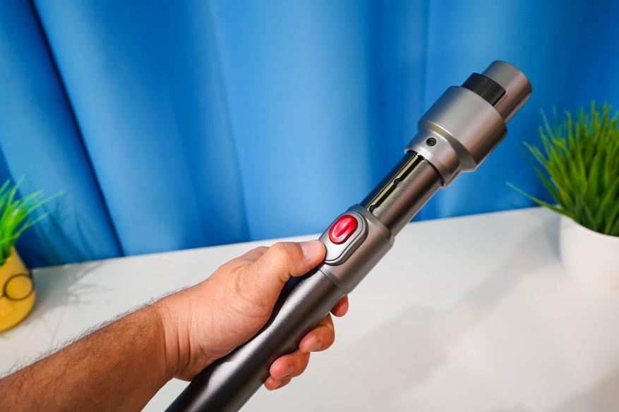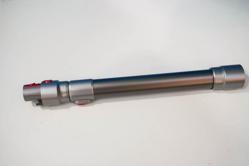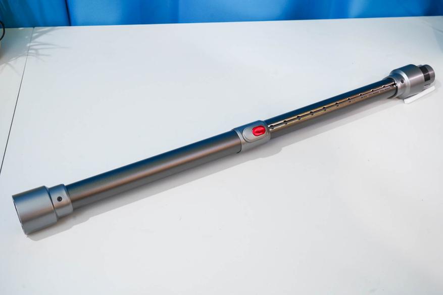 Достаточно удобный момент в том, что штатная трубка для удлинения насадок оснащается телескопическим механизмом. Это позволяет не только увеличить вылет насадки для того, чтобы достать удаленные уголки, например, пропылесосить глубоко под шкафом или на антресоли, но и подстроить высоту пылесоса под свой рост. Фиксируется в одном из положений с помощью небольшой кнопки.