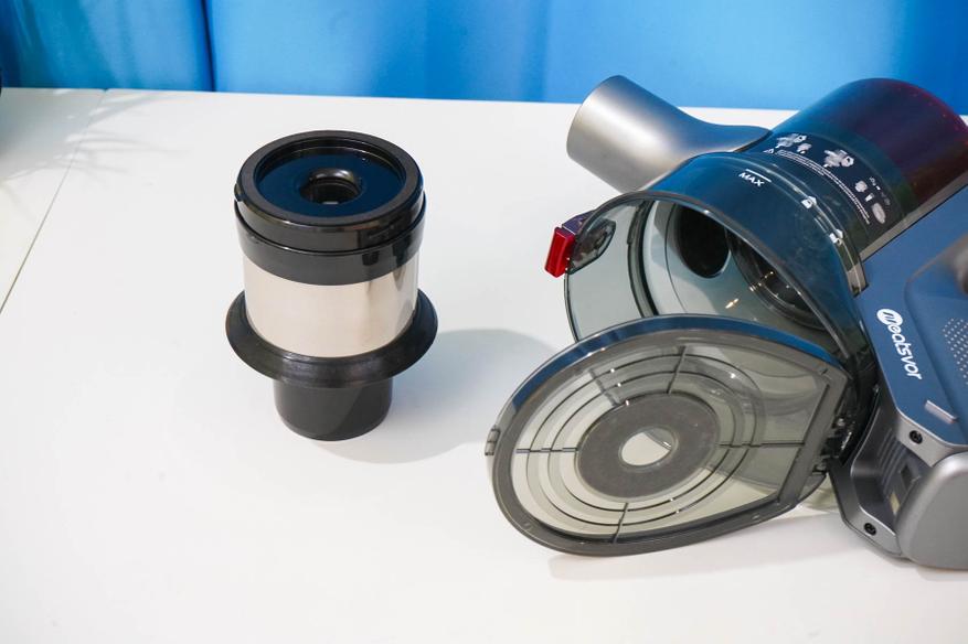 В основе системы очистки пылесоса лежит циклонный фильтр — колонна со стальной сеточкой, дополнительный внутренний фильтр. Конструкция разборная, саму колонну и фильтр можно извлечь, например, для прочистки.