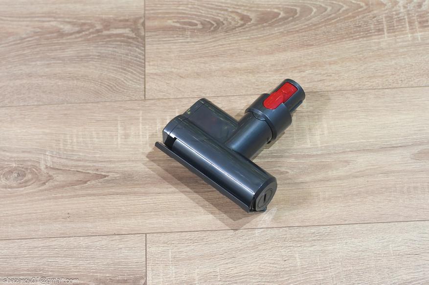 Вторая насадка — 2-в-1, представляет собой универсальный инструмент, который сочетает в себе функции двух разных насадок, обычной щетки для пола/ковров и щелевой насадки. В стандартном положении — это широкое и узкое сопло для точечного сбора мусора с поверхностей. При нажатии на кнопку, часть корпуса со щетинистой панелью сдвигается, оставляя под ней узкую щелевую насадку, если требуется очистка узких пространств: зазоры между мебелью и стеной, плинтусы, углы; чистка радиаторов отопления и решеток вентиляции; сбор рассыпанного мусора в труднодоступных местах и деликатная уборка.