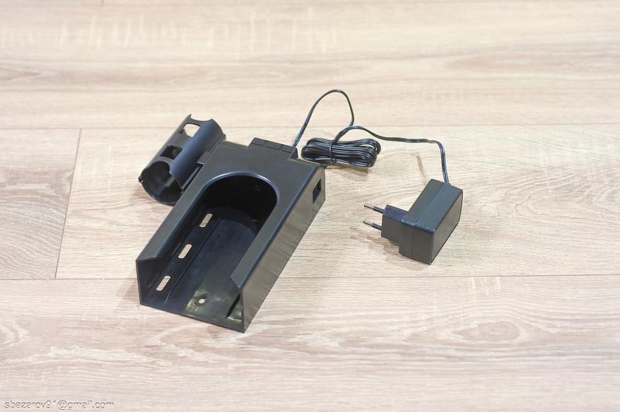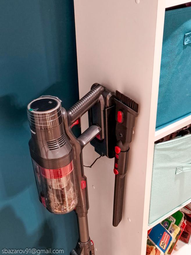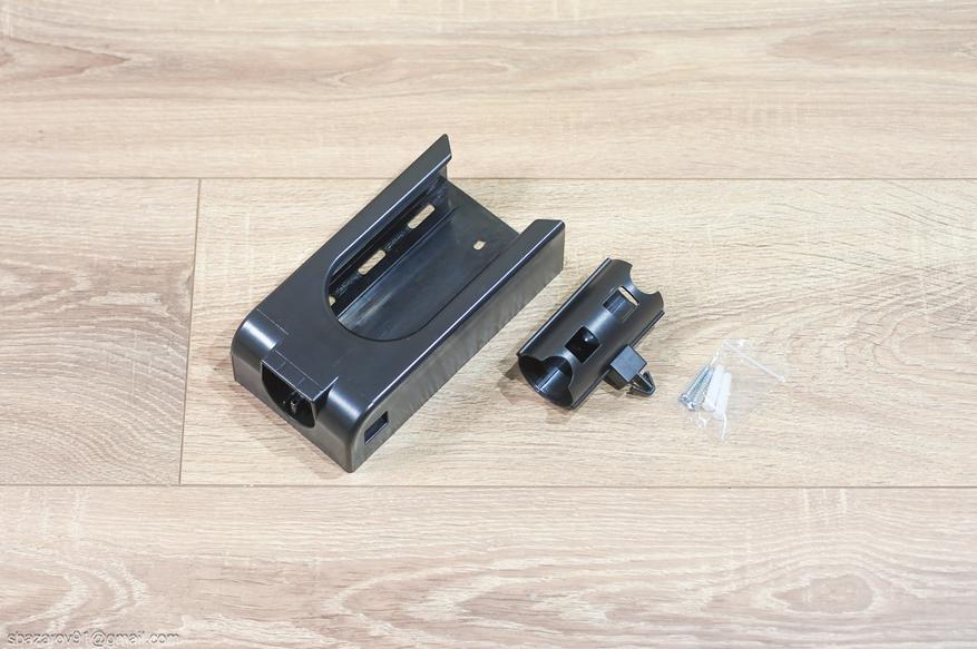 Для хранения пылесоса предусмотрено настенное крепление и комплект дюбель-шурупов для установки. Само крепление также позволяет хранить две дополнительные насадки за счет быстросъемного механизма (его можно установить как слева, так и справа). Для насадки по мебели не предусмотрено место на базе — мелочь, но штатное место добавило бы удобства.