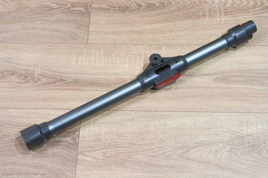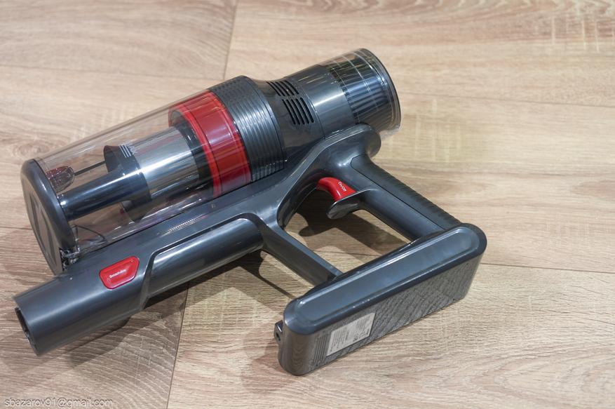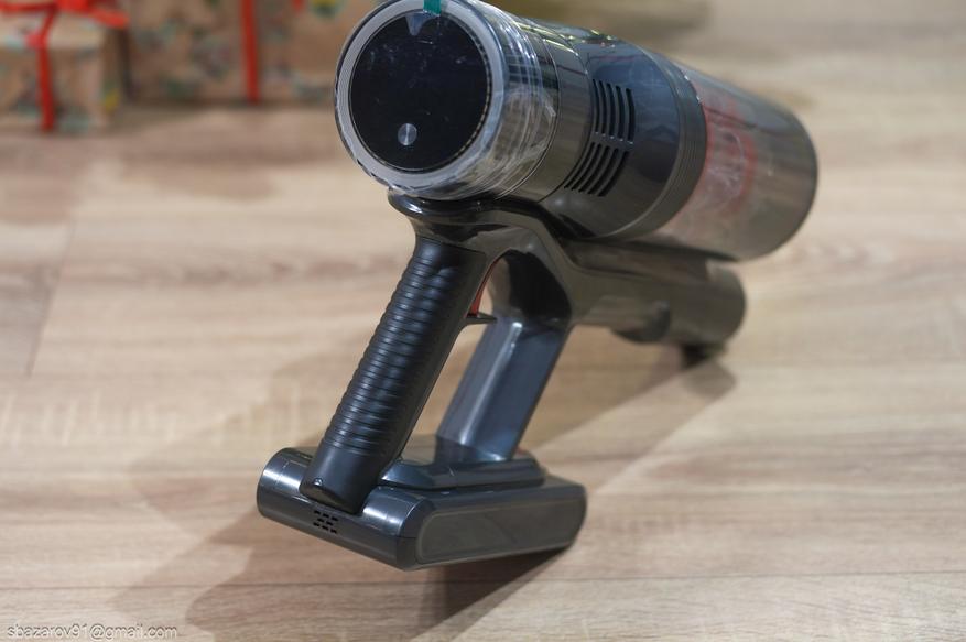 Пуск пылесоса происходит путем нажатия на спусковой крючок, а следом уже регулировка мощности всасывания. Ниже рукоятки можно увидеть вентиляционные отверстия для отвода тепла с аккумулятора.