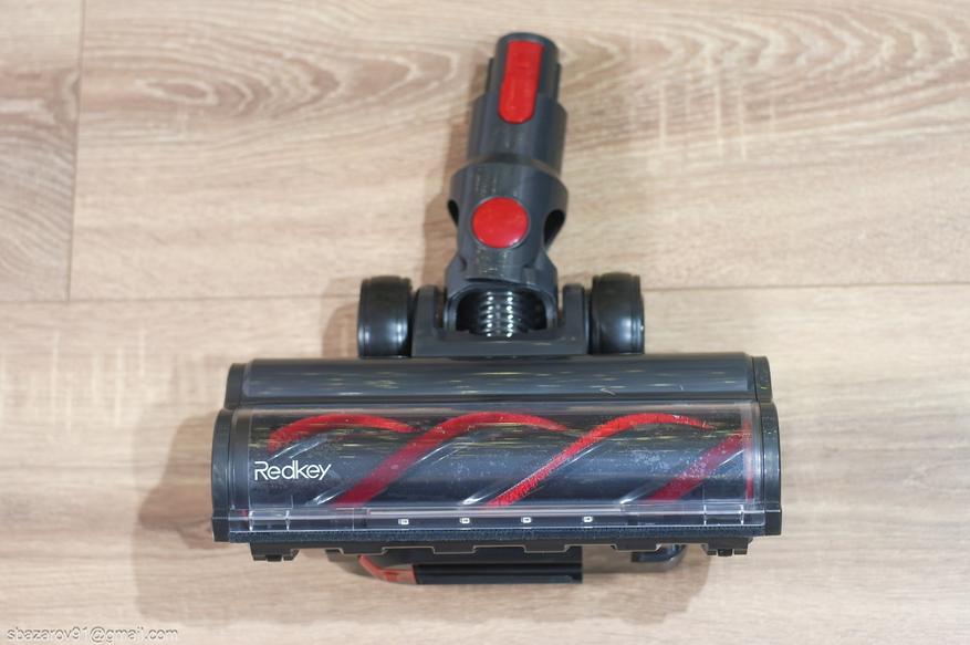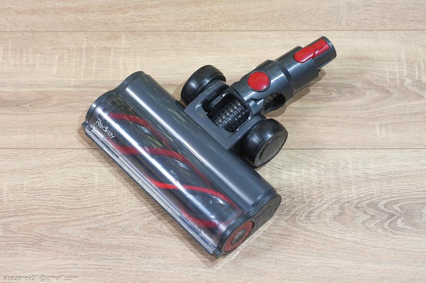Сердцем Redkey F11 выступает высокооборотистый электродвигатель, потребляющий до 500 Ватт на максимальной мощности всасывания в 36 кПа. Цифровой дисплей встроен в заднюю часть корпуса электродвигателя и отображает текущий заряд в процентах (шаг в единицу), а также текущий уровень мощности (3 на выбор + автоматический режим). Под дисплеем кнопка смены мощности, которая их чередует. Дисплей с сенсорным управлением, клавиши — и + позволяют регулировать силу всасывания. Также вокруг дисплея происходит забор воздуха через встроенный HEPA-фильтр.