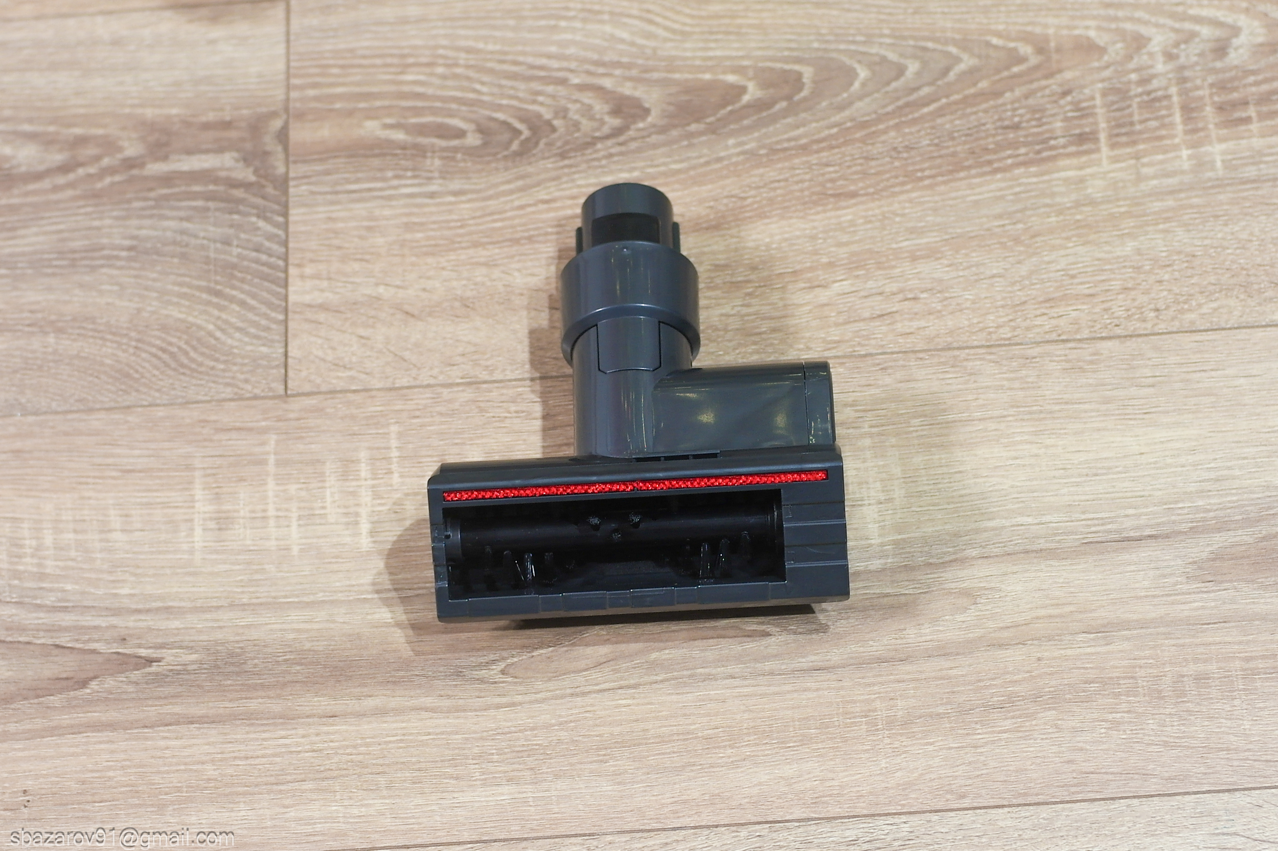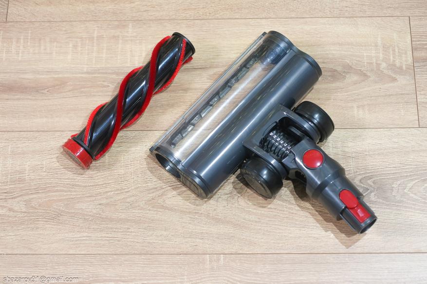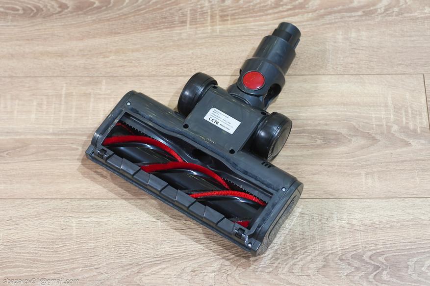 Основная щетка классической компоновки: 2 крупных колеса сзади, 2 мелких колеса спереди, вращающийся валик и встроенная подсветка. Валик универсальный и позволяет собирать мусор как с гладких напольных покрытий, так и с ворсовых ковров. Обслуживается он элементарно, достаточно нажать на фиксатор на левой стороне и промыть его под струей воды.