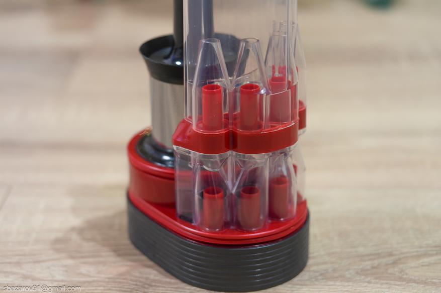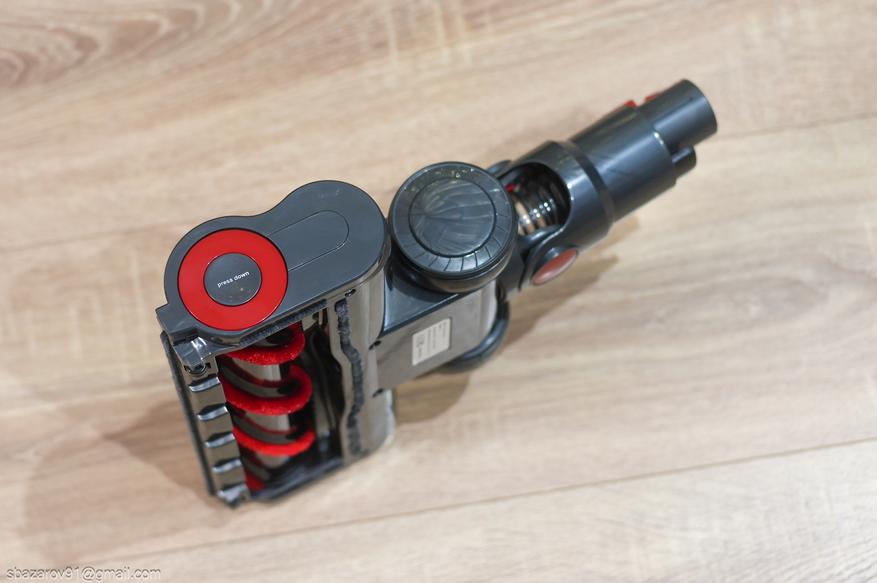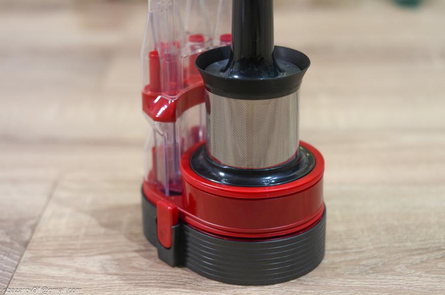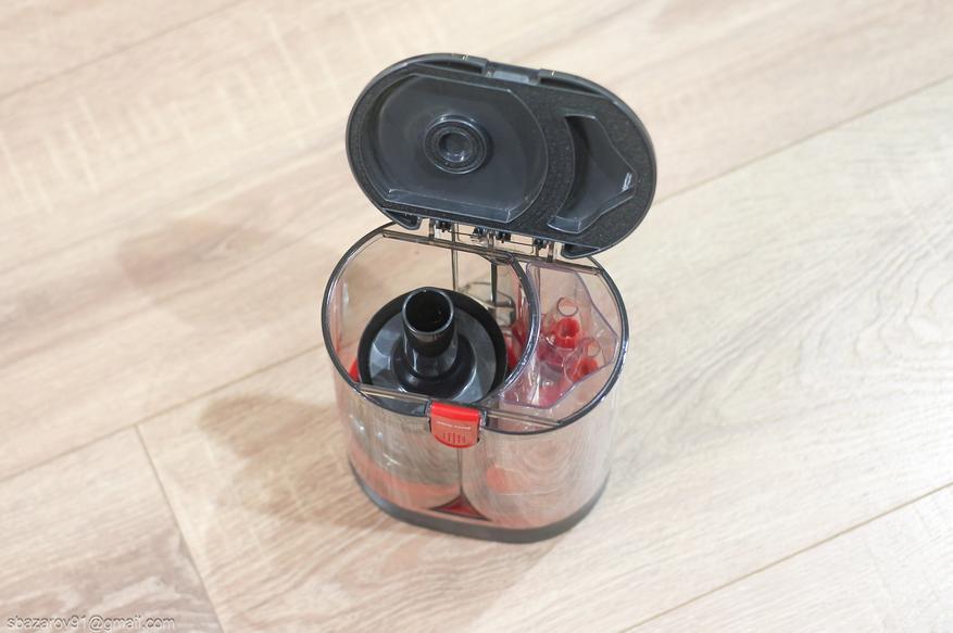 Перед электромотором расположен корпус системы фильтрации и циклонный фильтр. Последний легко извлекается и промывается, а в работе циклон отсеивает крупные частицы, оставляя их на дне резервуара. Для съема пылесборника имеется крупная красная кнопка на левой стороне корпуса. А сама очистка происходит еще проще, достаточно не снимать резервуар, а просто нажать на соответствующую кнопку.