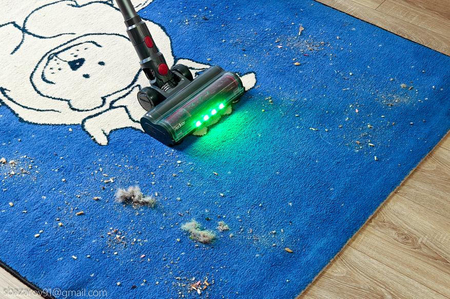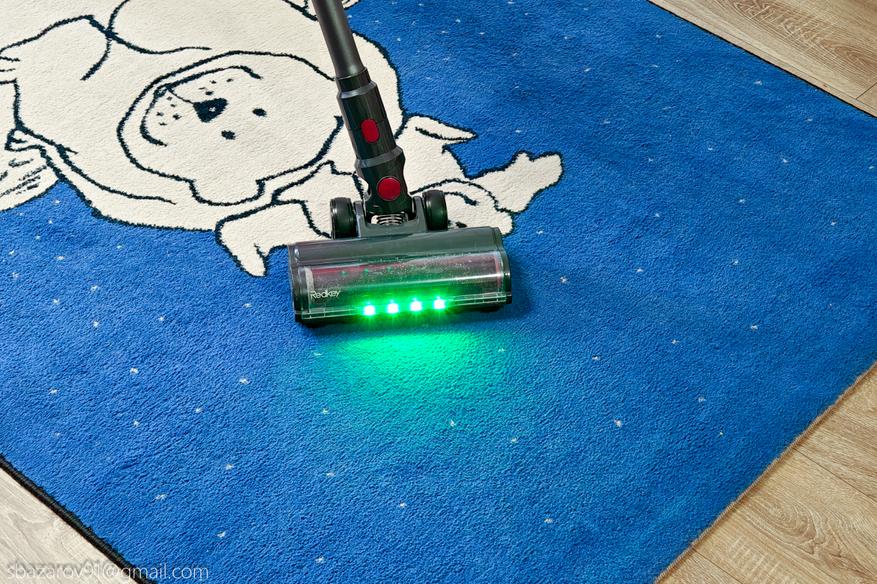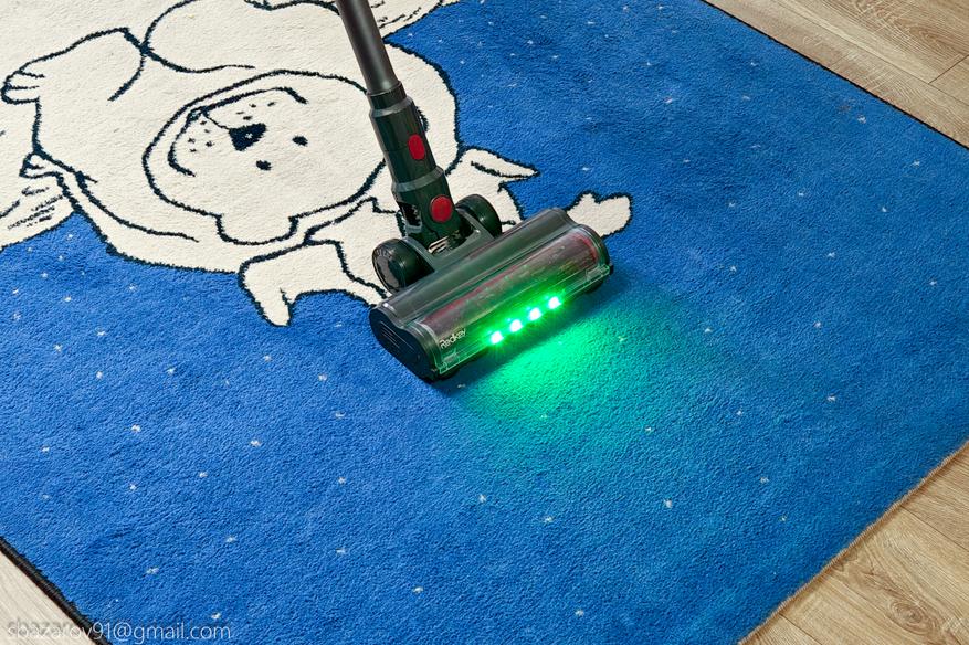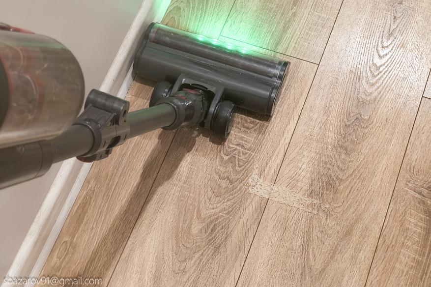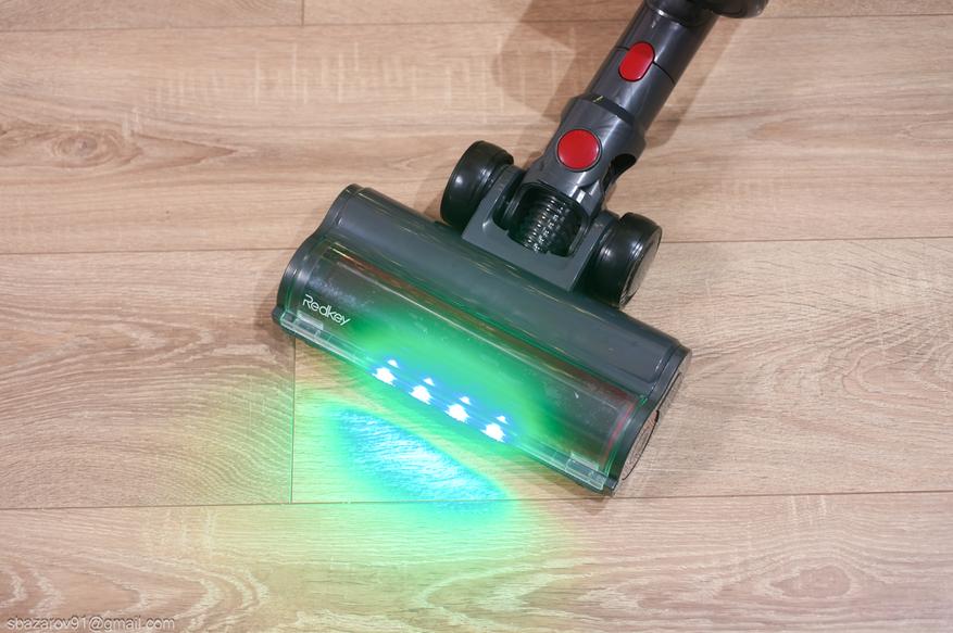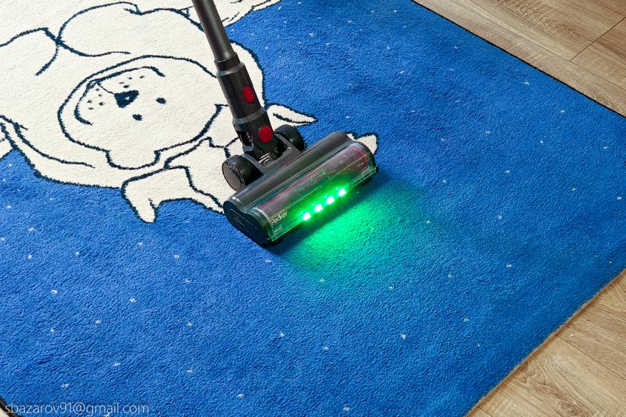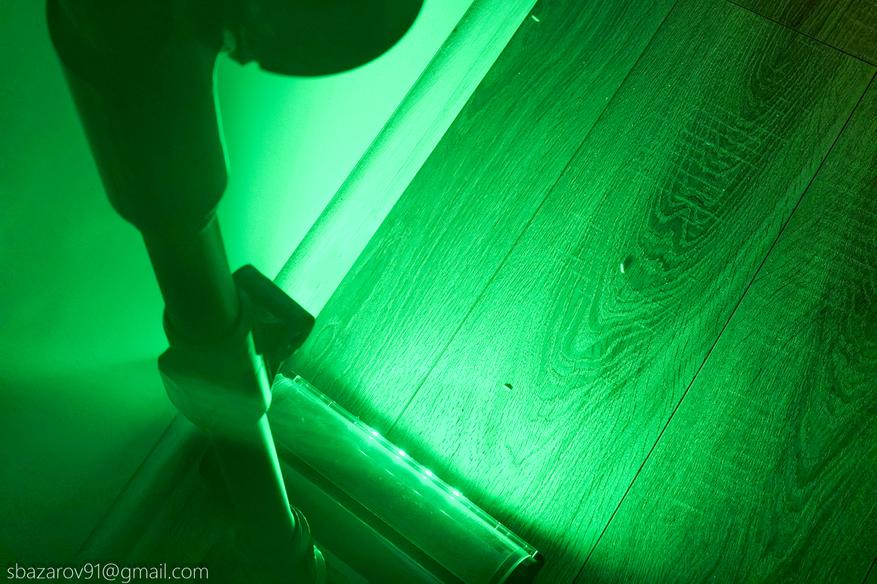 Для удобства передняя часть напольной щетки оснащена зелеными светодиодами, которые отлично подсвечивают всю пыль на своем пути. А для большей автоматизации имеется даже инфракрасный датчик пыли, улавливающий её в воздухе и дающий команду на увеличение силы всасывания (при первом включении пылесос активирует сначала автоматический режим, а потом уже можно сделать выбор самостоятельно).