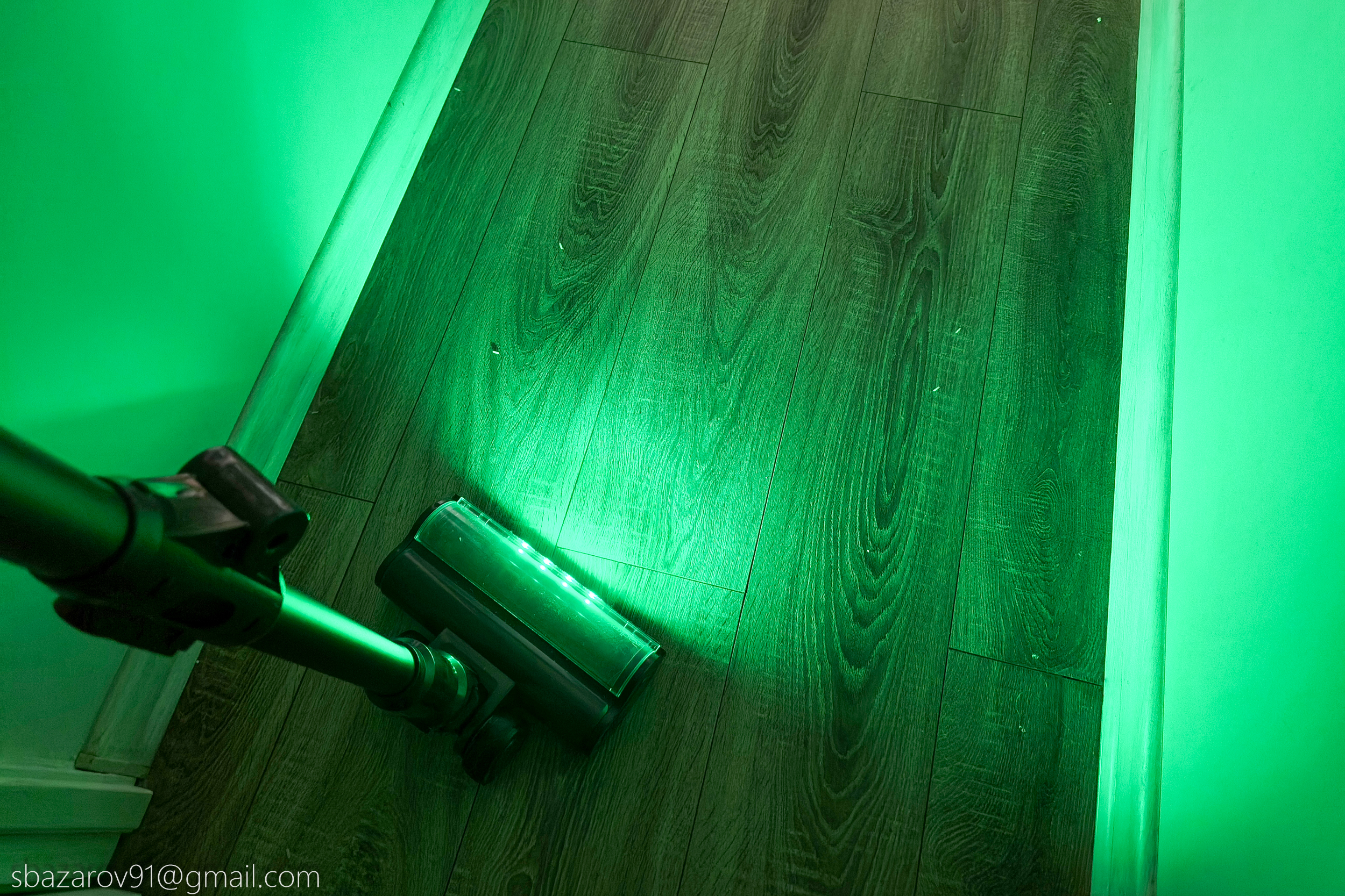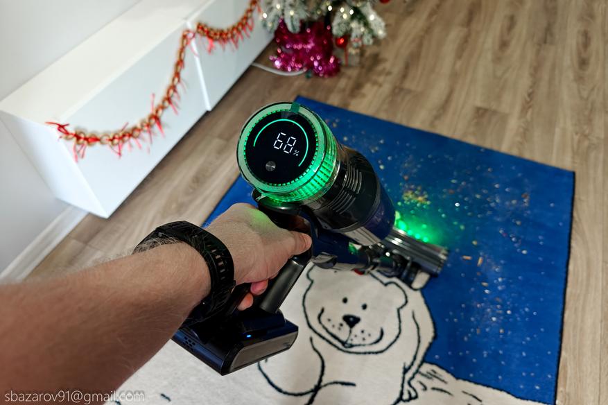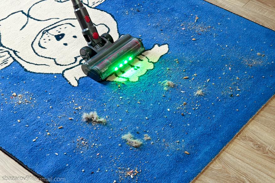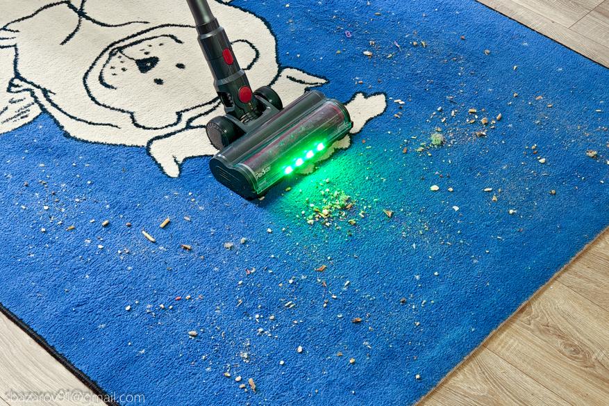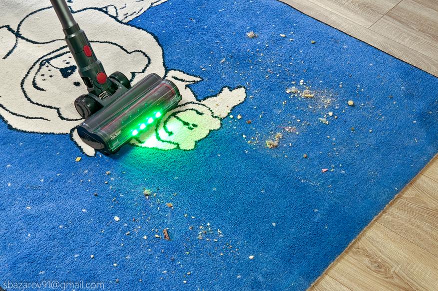 Для удобства передняя часть напольной щетки оснащена зелеными светодиодами, которые отлично подсвечивают всю пыль на своем пути. А для большей автоматизации имеется даже инфракрасный датчик пыли, улавливающий её в воздухе и дающий команду на увеличение силы всасывания (при первом включении пылесос активирует сначала автоматический режим, а потом уже можно сделать выбор самостоятельно).