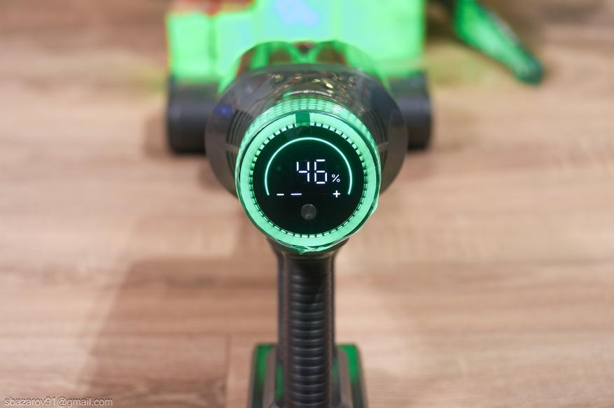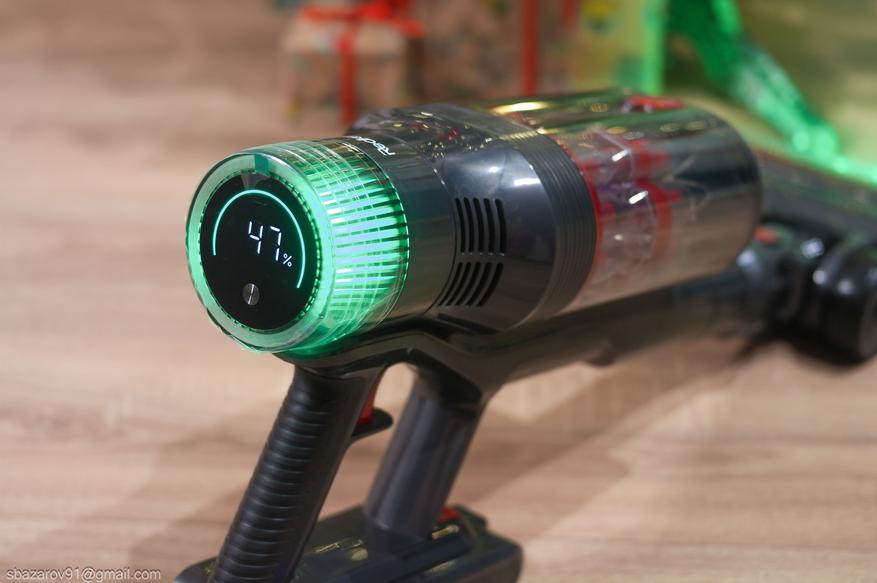 Время на зарядку аккумулятора пылесоса достигает 5 часов 25 минут. Сам аккумулятор съемный и позволяет заряжать его даже отдельно от базы. При постановке на зарядку на пылесосе загорается сегментный индикатор и RGB подсветка, а при зарядке вне пылесоса предусмотрен светодиодный индикатор на корпусе аккумулятора.