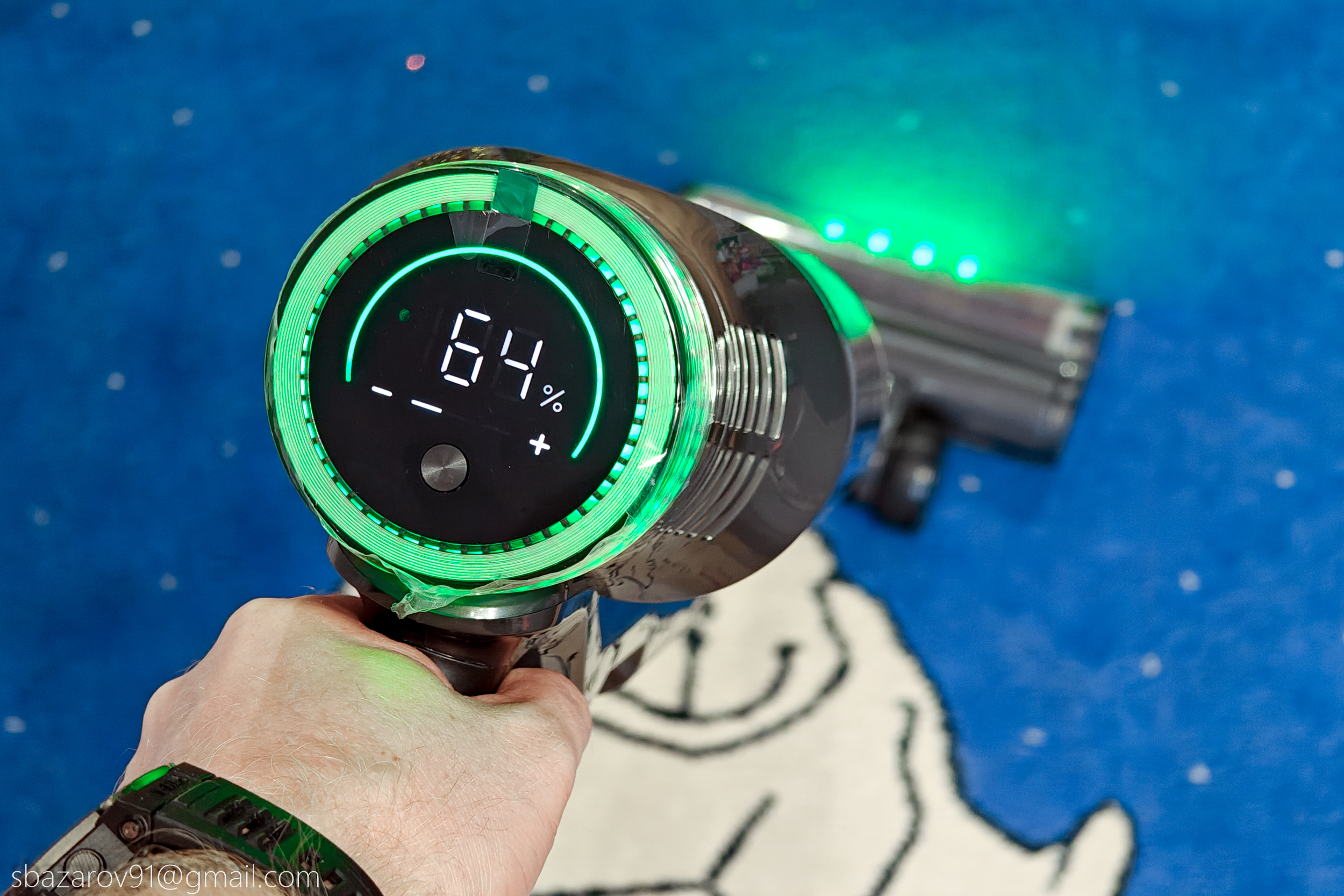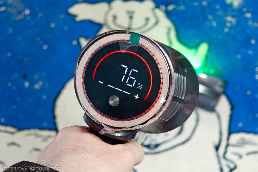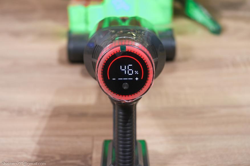Несомненным преимуществом Redkey F11 является его длительная работа, обеспеченная аккумулятором на 2500 мА*ч. Заявленное время работы — до 73 минут на минимальном режиме, время работы на максимальной мощности я не нашел. Проверим время работы на каждом из режимов с установленной насадкой для пола.