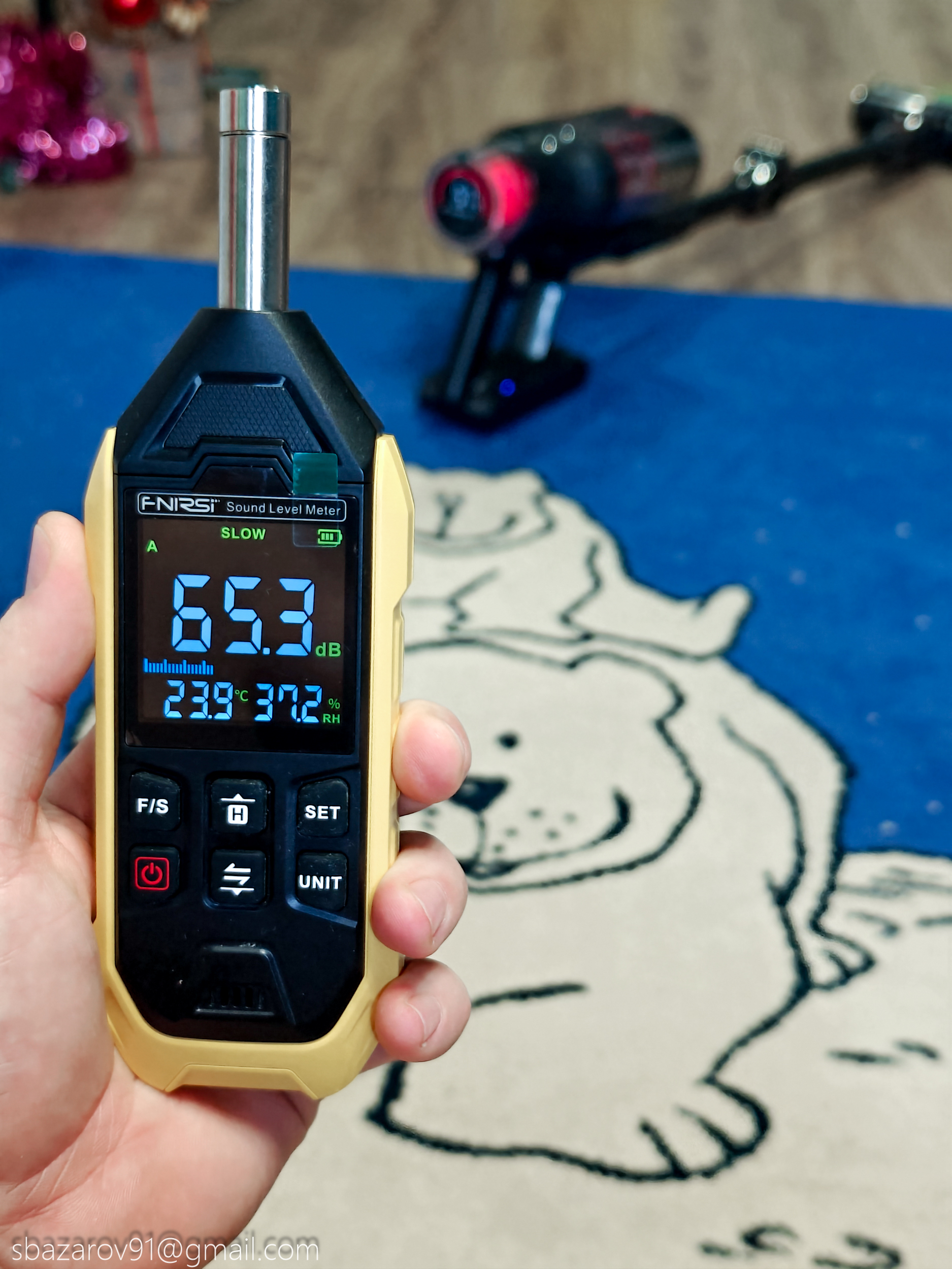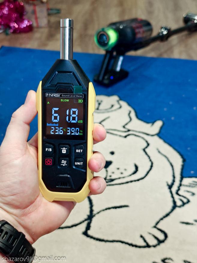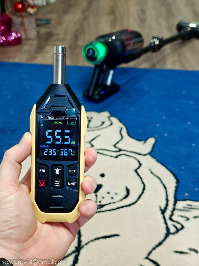Немаловажным является создаваемый уровень шума, потому что аккумуляторный пылесос позволяет работать на малой мощности, не создавая лишнего шума, что особенно важно, если в доме есть маленькие дети, которые могут спать днем. Измерять уровень шума будем с расстояния в 1 метр на каждом из режимов. Итоговый результат: на минимальном режиме 55.5 дБ — это довольно тихо, на среднем 61.8 дБ — умеренно, на максимальном 65.3 дБ — немного громче, но все равно в пределах комфортного для кратковременного использования.