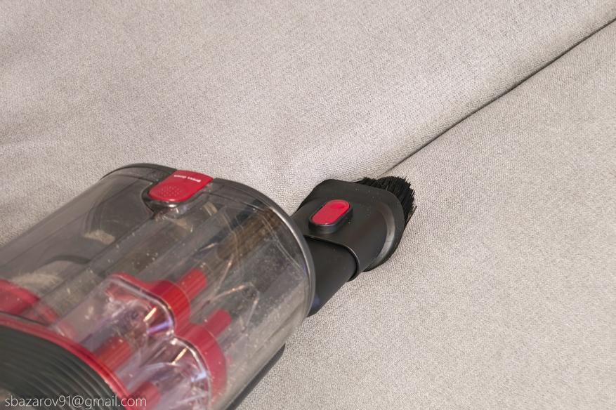 Рассмотрим отдельные насадки и первой на очереди — насадка для чистки мягкой мебели. Принцип работы очень прост, она представляет собой уменьшенную версию напольной щетки. Основная её задача — бережная, но эффективная уборка мягкой мебели, матрасов, кресел, салона автомобиля и других деликатных поверхностей. Сама щетка состоит из мягкого ворса, она не царапает и не повреждает ткань. А специальная форма щетины на валике позволяет проникать в складки, швы и стыки мебели, где скапливается пыль, крошки и шерсть животных.