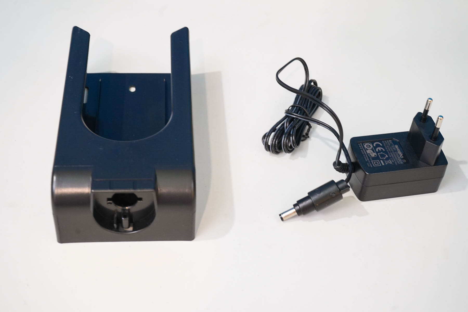 Также стоит отметить настенное крепление с органайзером, позволяющее не только закрепить пылесос на стене, но и хранить насадки рядом с пылесосом. Вот тут обращаю внимание, что зарядное устройство из комплекта можно подключить к этому настенному креплению — при установке пылесоса для хранения будет происходить подзарядка батареи, что весьма и весьма удобно. А вот так устанавливаются насадки в органайзер — крепления расположены вверх и вниз, что дает возможность закрепить сразу две насадки одновременно. Само сетевое зарядное устройство имеет параметры выхода 35 вольт и 500 мА на выходе, что позволяет полностью заряжать пылесос за 4-5 часов.