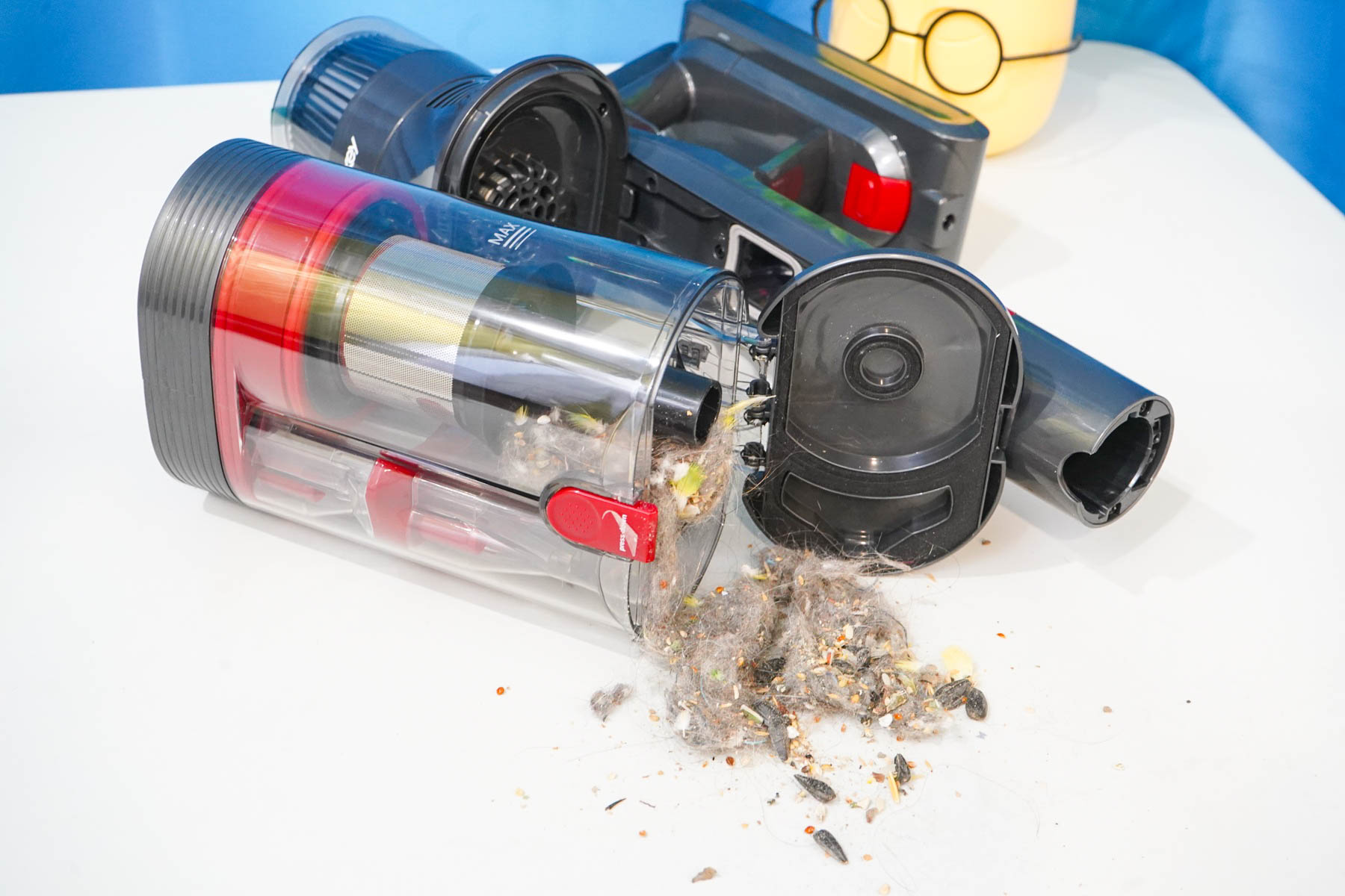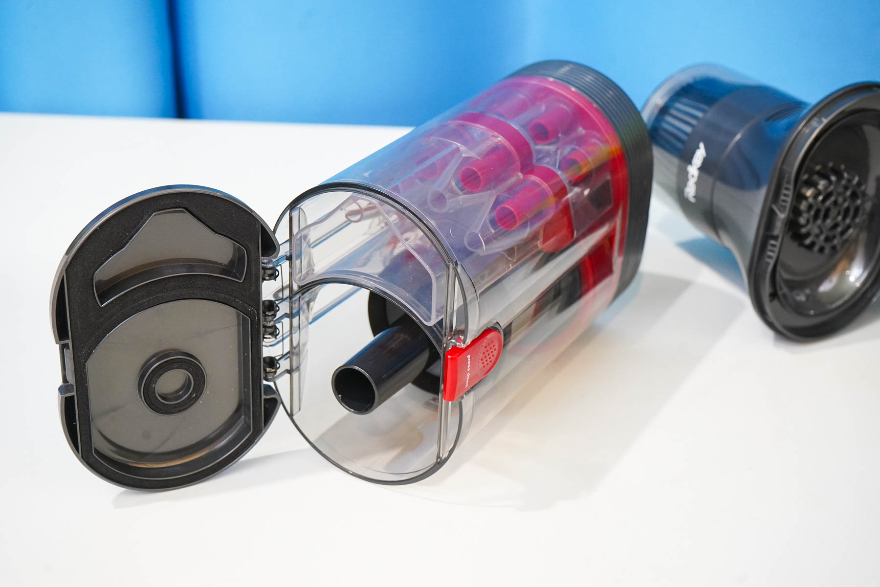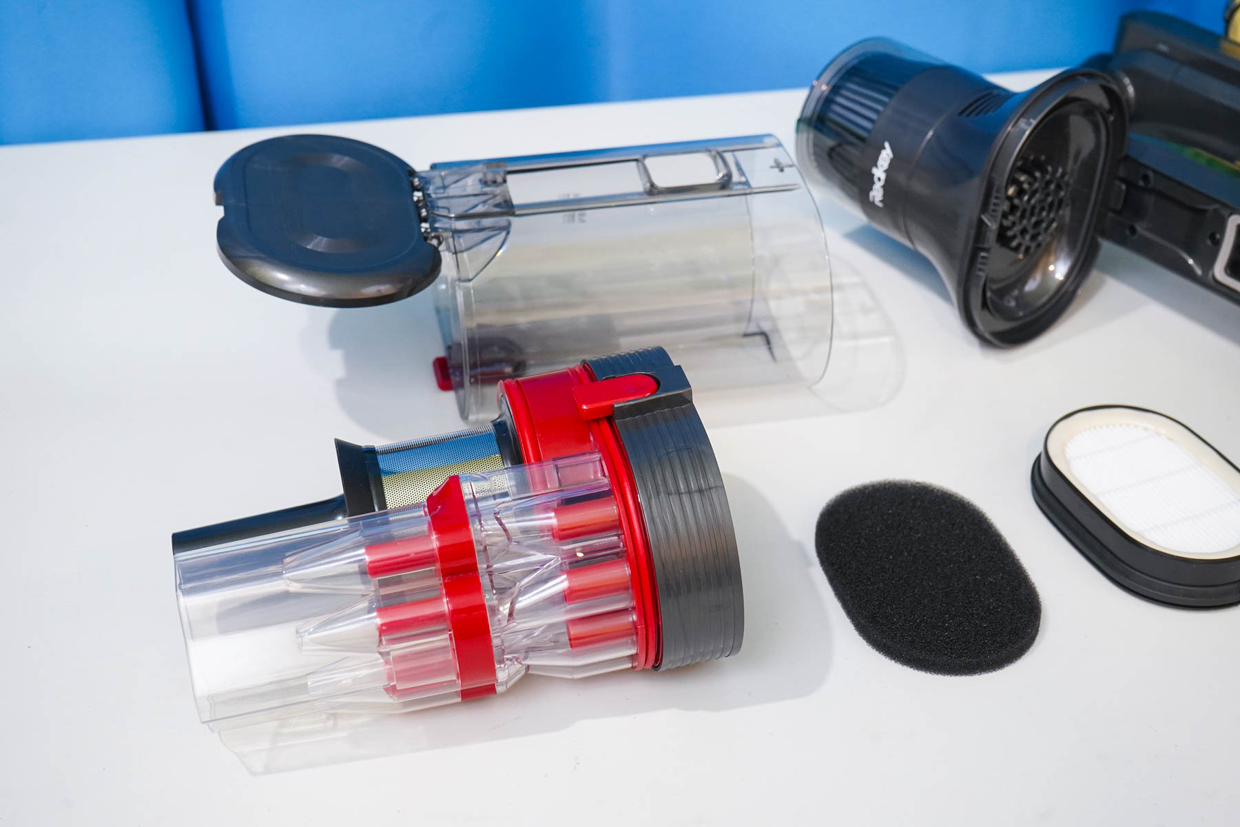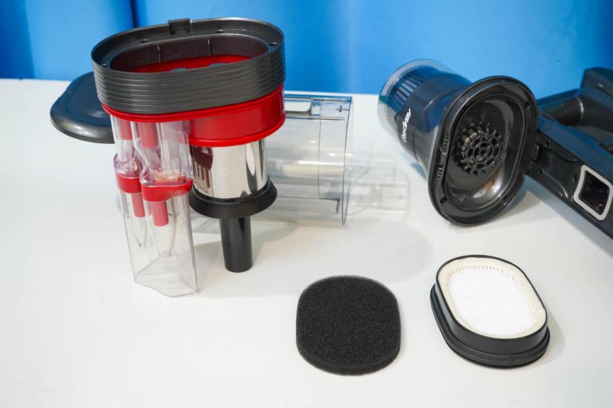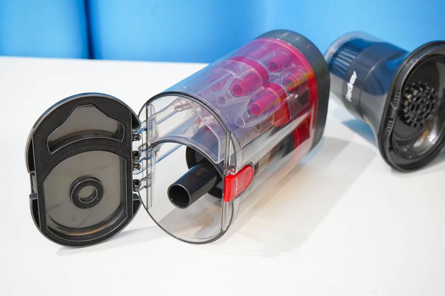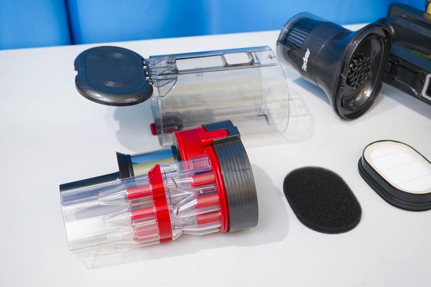 Пара слов про систему фильтрации. Оригинальность конструкции Redkey F11 заключается в сдвоенном циклоне — имеются две камеры для сепарации частиц мусора, позволяющие отделить крупный мусор и мелкую пыль на разных этапах. Используются сразу четыре конуса-минициклона в дополнительной камере, обеспечивающих завихрения при работе. На выходе из камеры установлен двойной фильтр (губчатый+HEPA13).