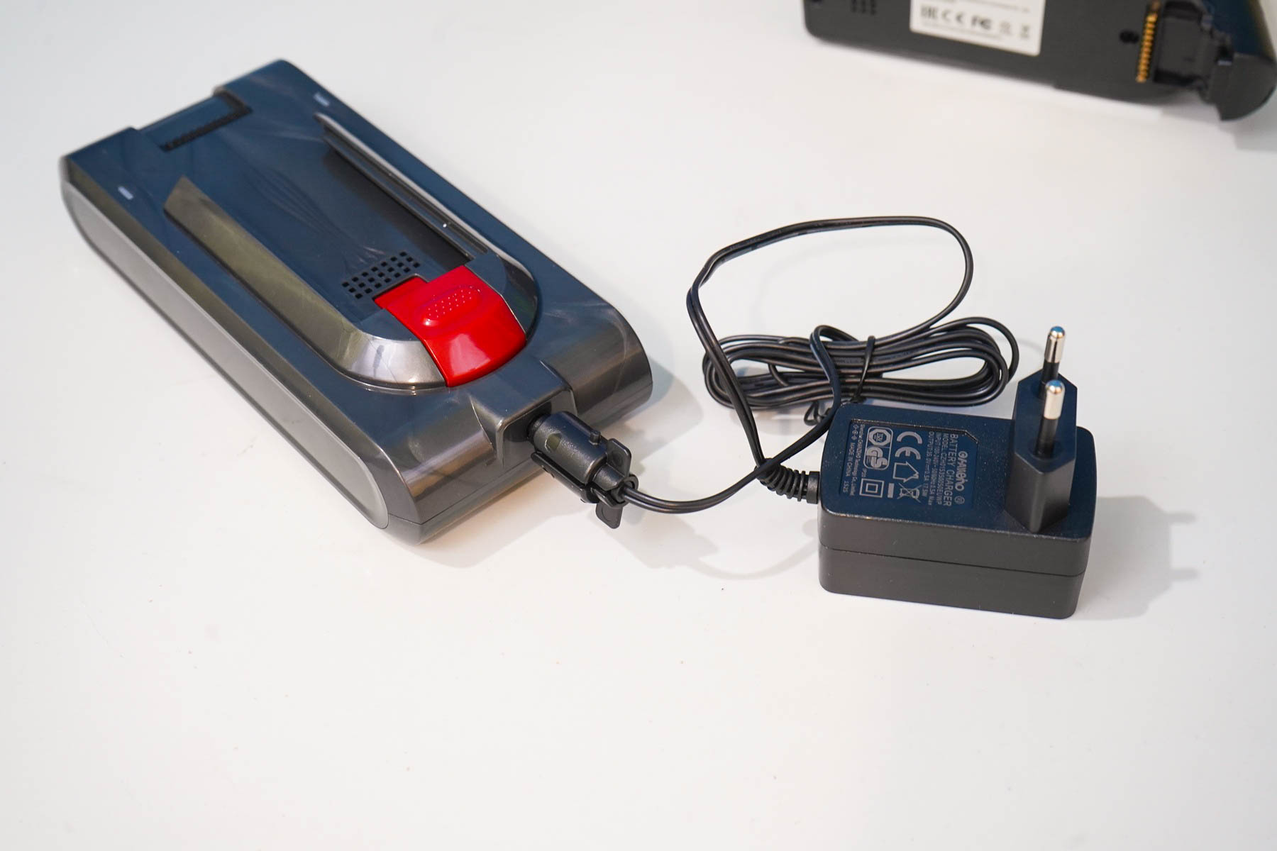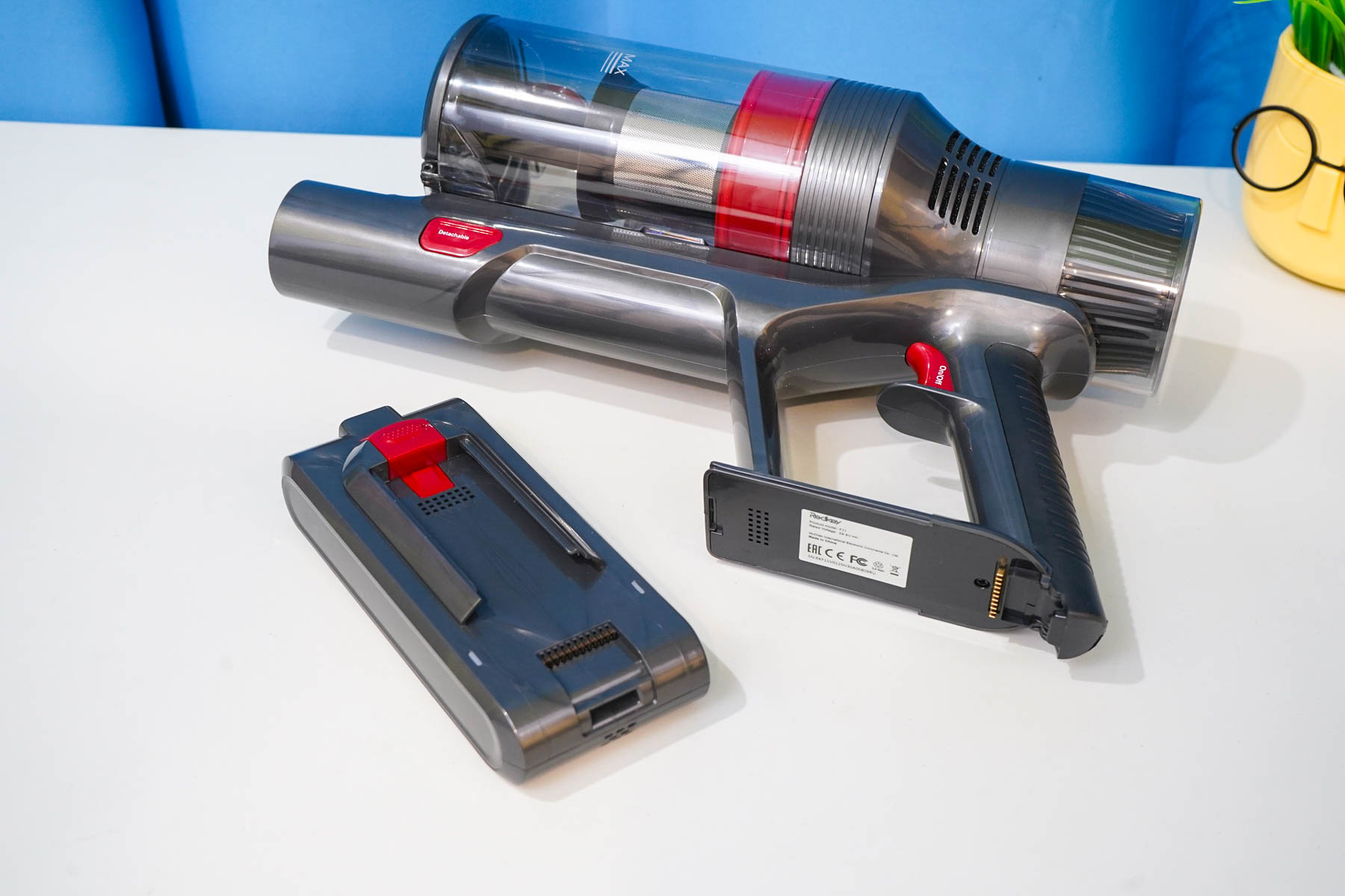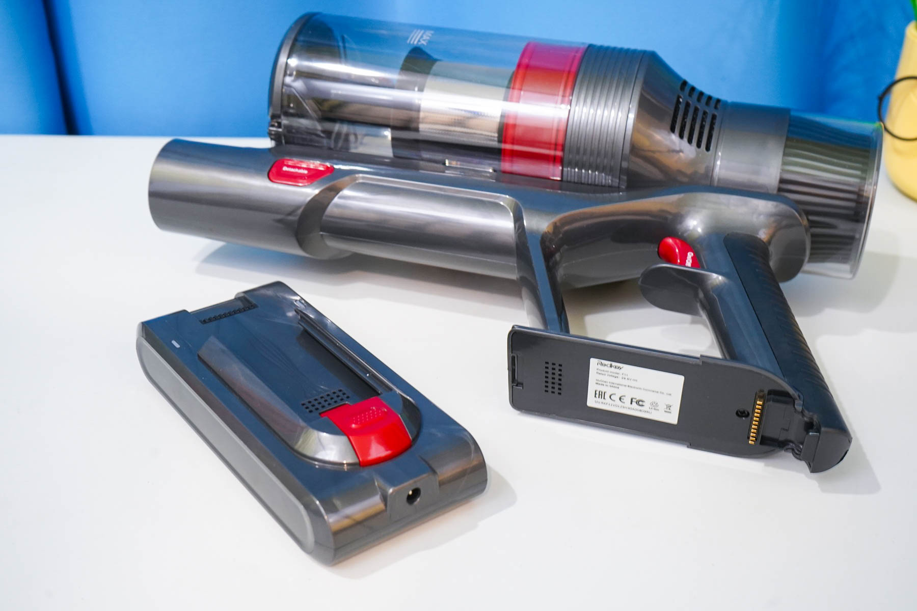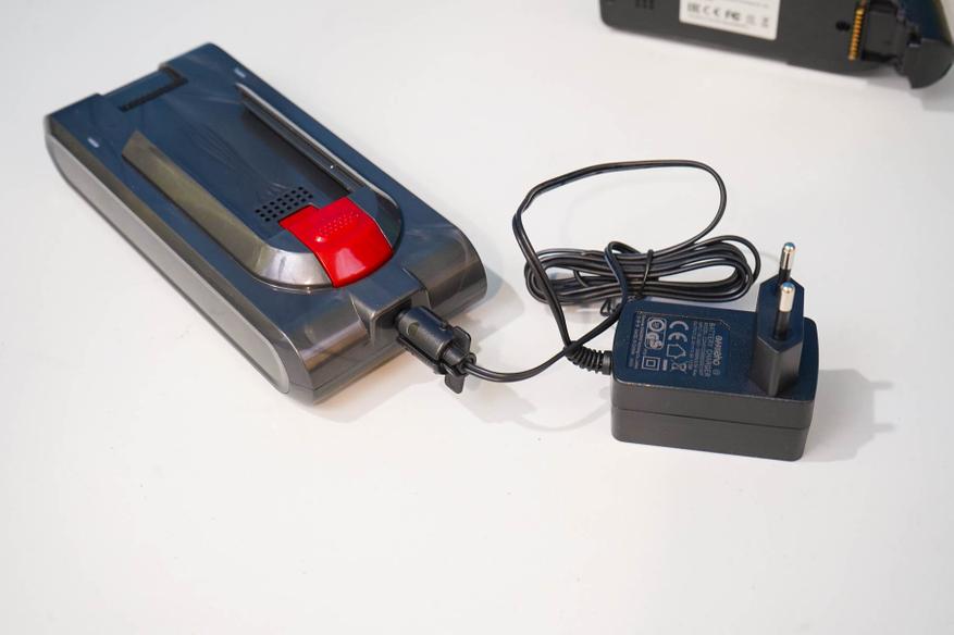 Аккумуляторная сборка для Redkey F11 выполнена в виде отдельного съемного модуля. Это дает возможность как отдельно заряжать батарею от СЗУ, так и использовать дополнительный аккумулятор, например, с целью длительной уборки. Параметры аккумуляторной батареи: 29.6 Вольт (7S сборка), 2500 мАч, до 73 минут работы с одной зарядки (подразумевается экономичный режим).