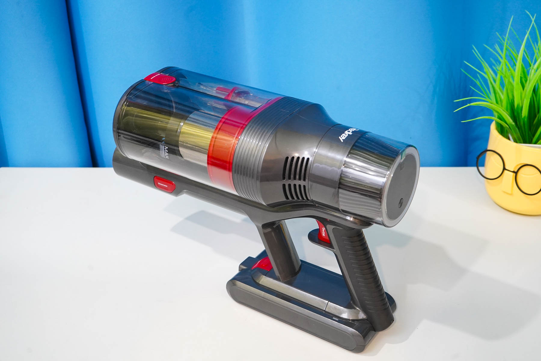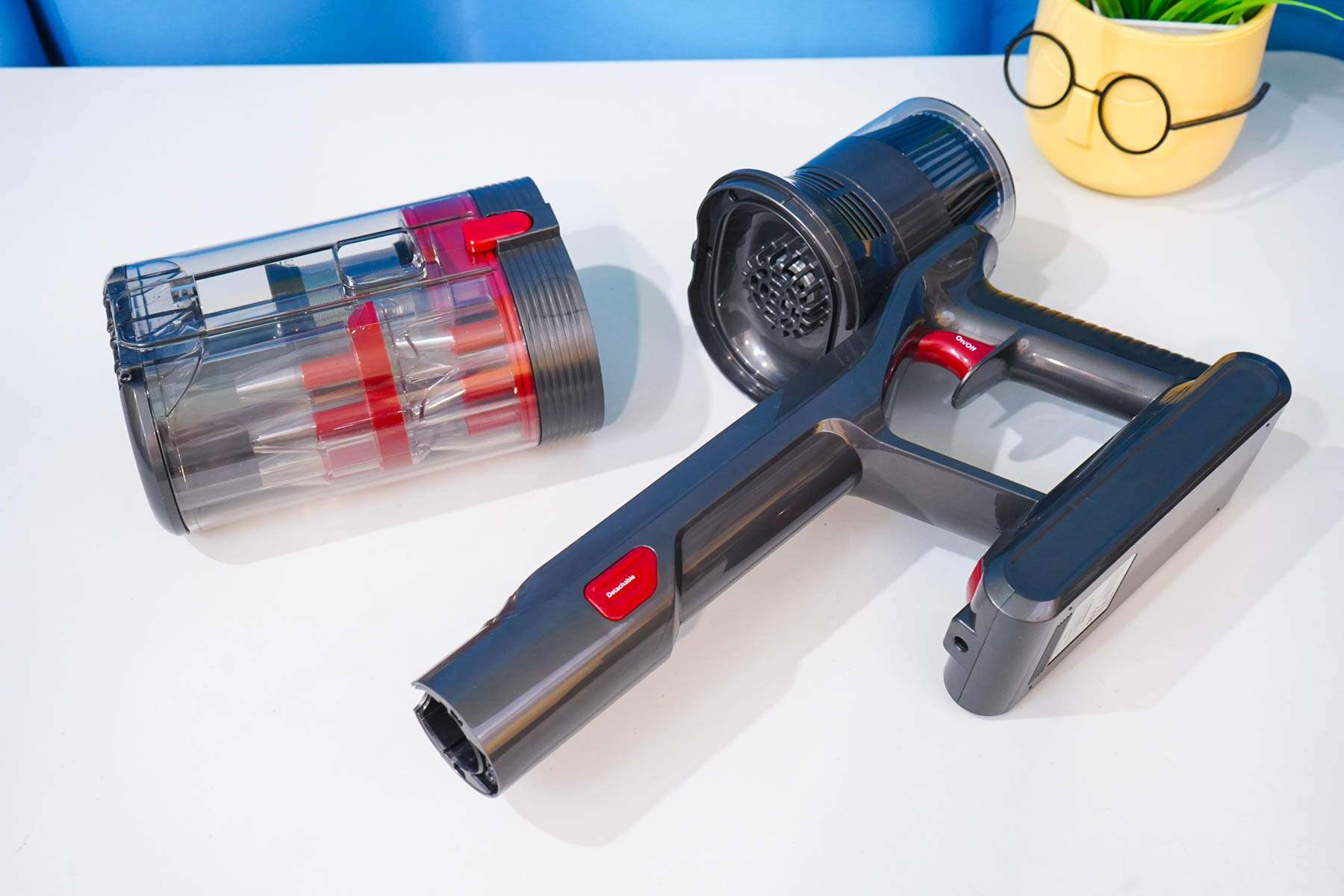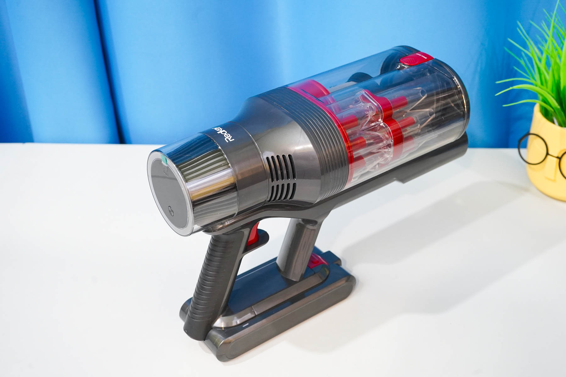 Корпус пылесоса Redkey F11 выделяет его среди массы однообразных моделей. В первую очередь — это необычный сдвоенный пылесборник. Пылесос довольно продвинутый — помимо высоко оборотистого двигателя у F11 предусмотрен оптический (инфракрасный) сенсор запыленности, то есть пылесос может поднимать обороты и повышать мощность при необходимости.