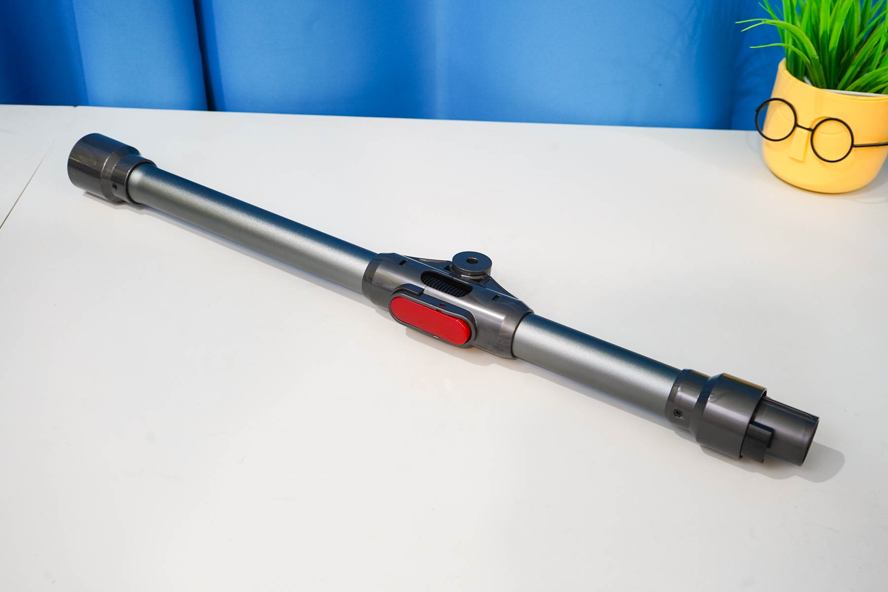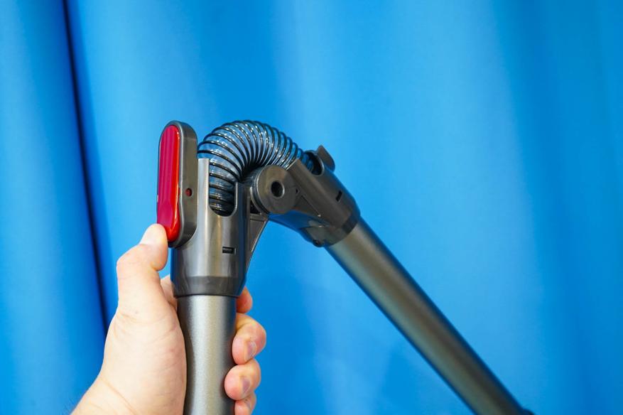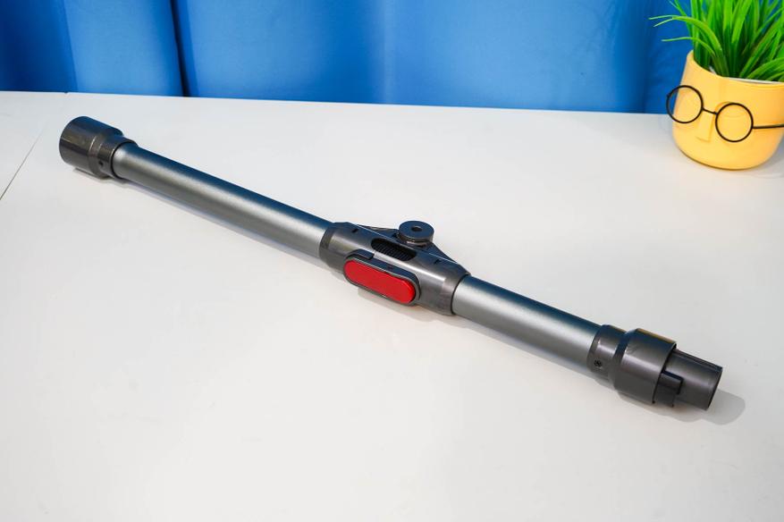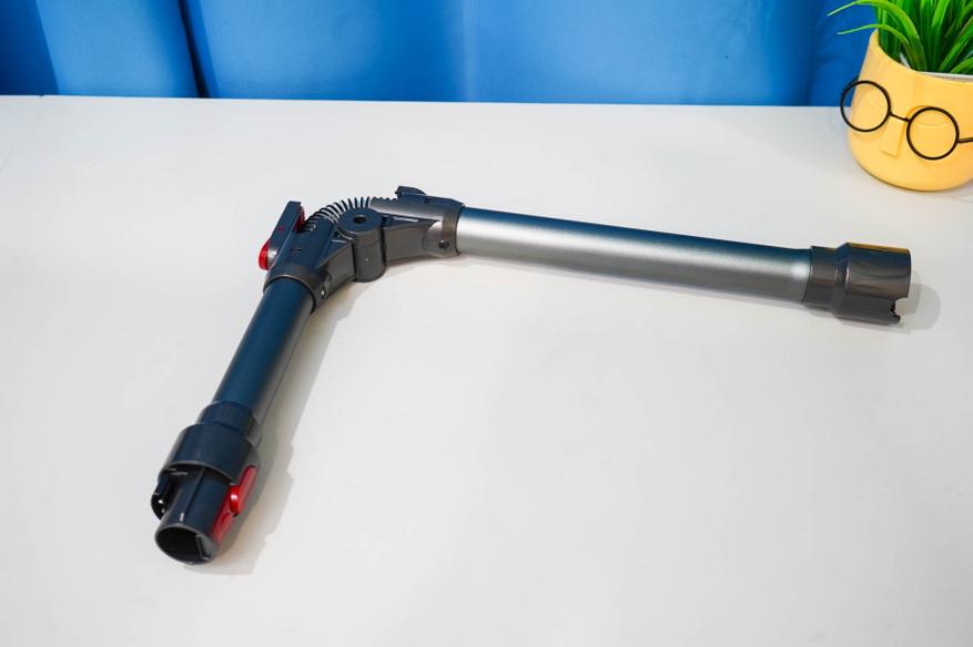 Итак, пара слов про штангу. В коробке с пылесосом была штанга интересной конструкции. Она отличается сгибаемым сочленением в центре трубки. Такое конструктивное решение позволяет выполнить уборку, например, под диваном на низких ножках.