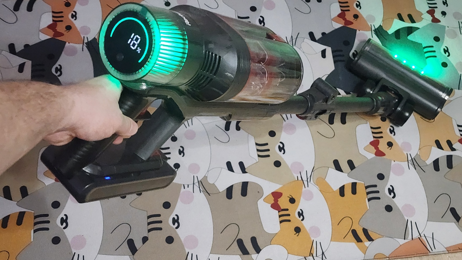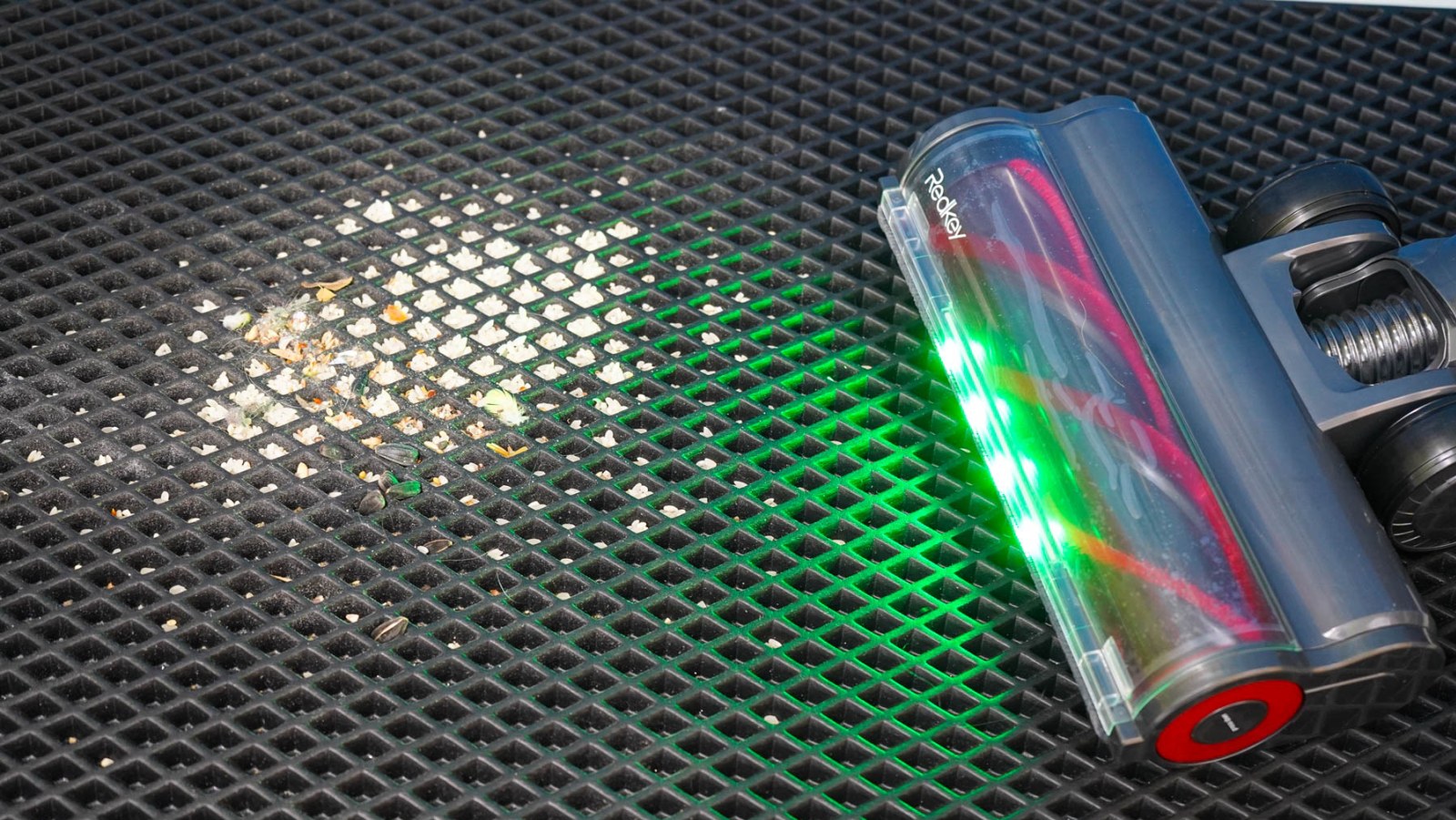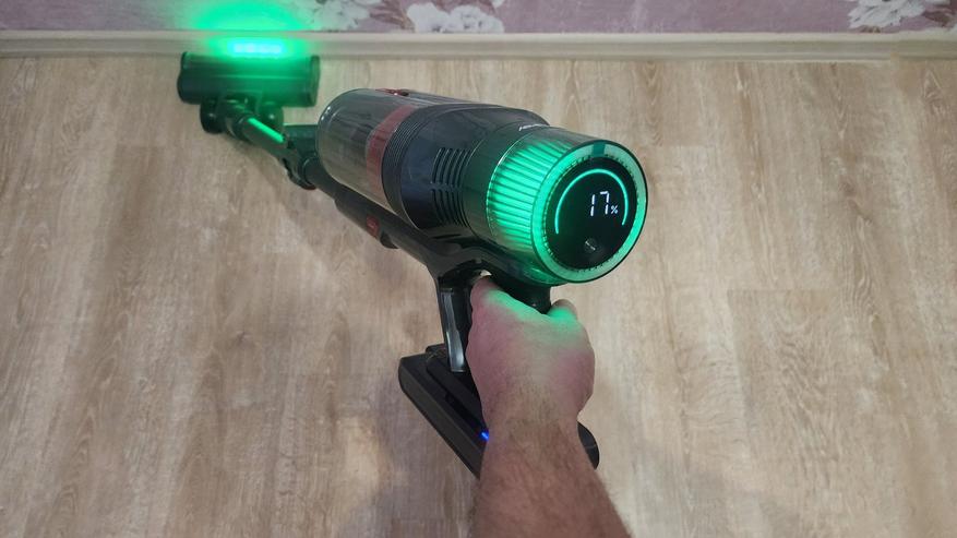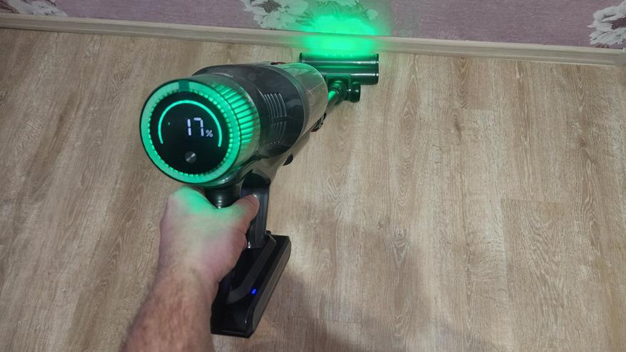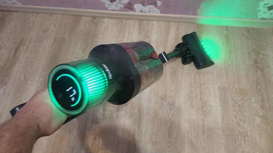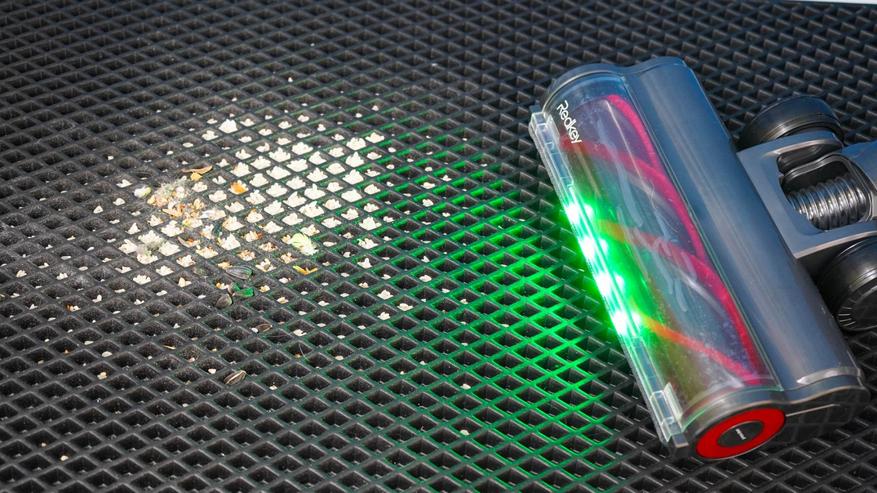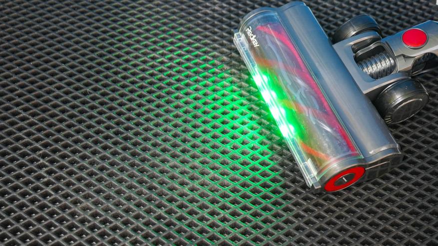 А учитывая светодиодную подсветку, которая расположена в основании насадки, то такая убора под диваном на ножках/под тумбочкой/под столом или под кроватью, позволяет быстро выяснить наличие пыли/мусора и увидеть пропущенные места. Направленный пучок света зеленого спектра заставляет частицы пыли/мусора отбрасывать тень на пол, от чего они становятся более заметными. И такие участки стоит пропылесосить заново, особенно если пропустили при основной уборке.