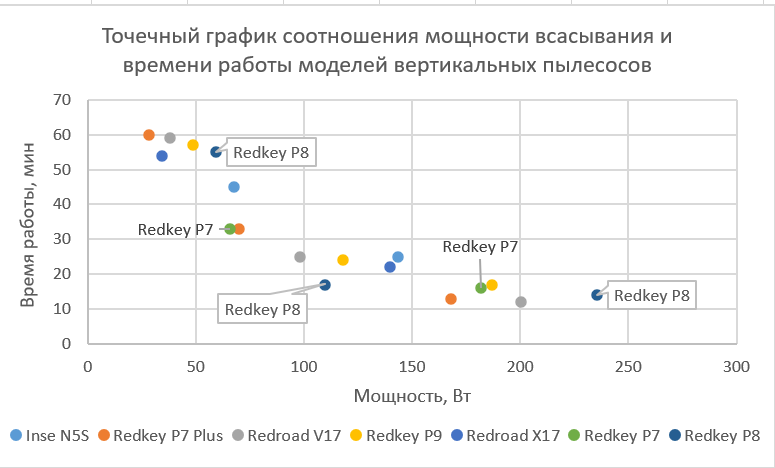 Данный график показывает, где на плоскости находится модель вертикального пылесоса в зависимости от мощности всасывания и времени работы в каждом режиме. Точечный график призван наглядно сравнить модели по: мощности всасывания, времени работы и, косвенно, емкости аккумуляторов (меньшее время работы при сравнимой мощности означает меньшую ёмкость аккумулятора).