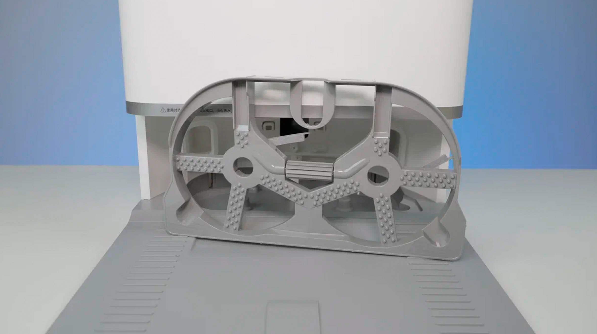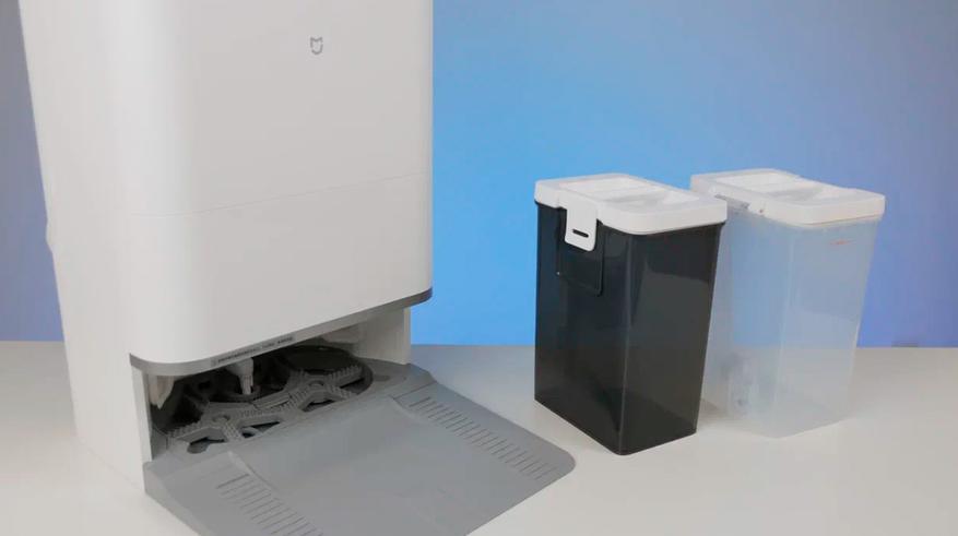 Док-станция со стандартными габаритами 457 х 340 х 588 мм. Компоновка тоже привычная: вода из резервуаров вверху поступает в поддон, где робот промывает салфетки в горячей воде, а затем насосы откачивают отработанную жидкость обратно. Дозатора моющего средства нет, зато есть скребки для самоочистки поддона.
