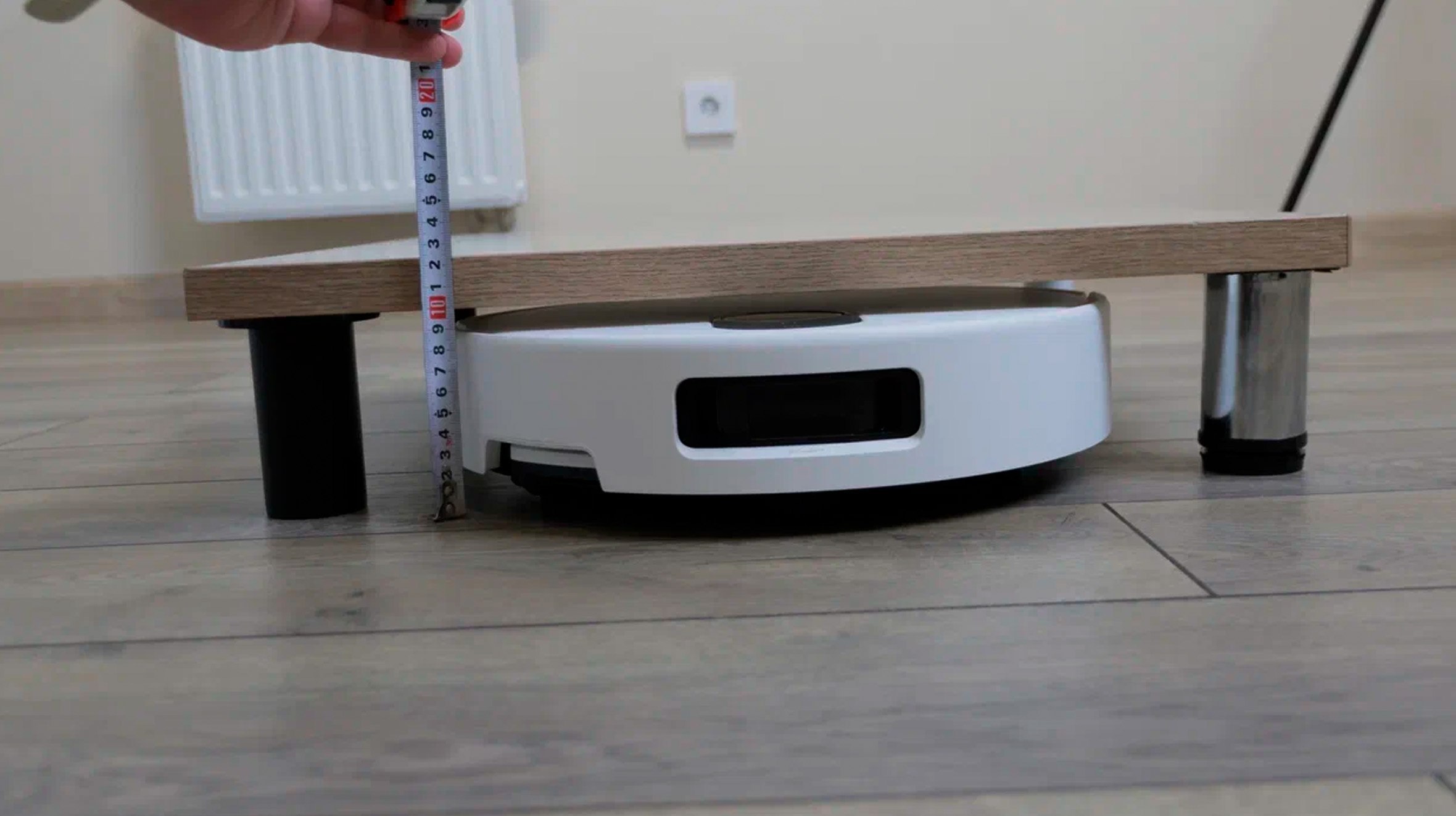 В просвет под мебелью в 90 мм и даже в 95 мм заезжать отказался. Заехал только в 100 мм, причем предварительно сложил лидар.