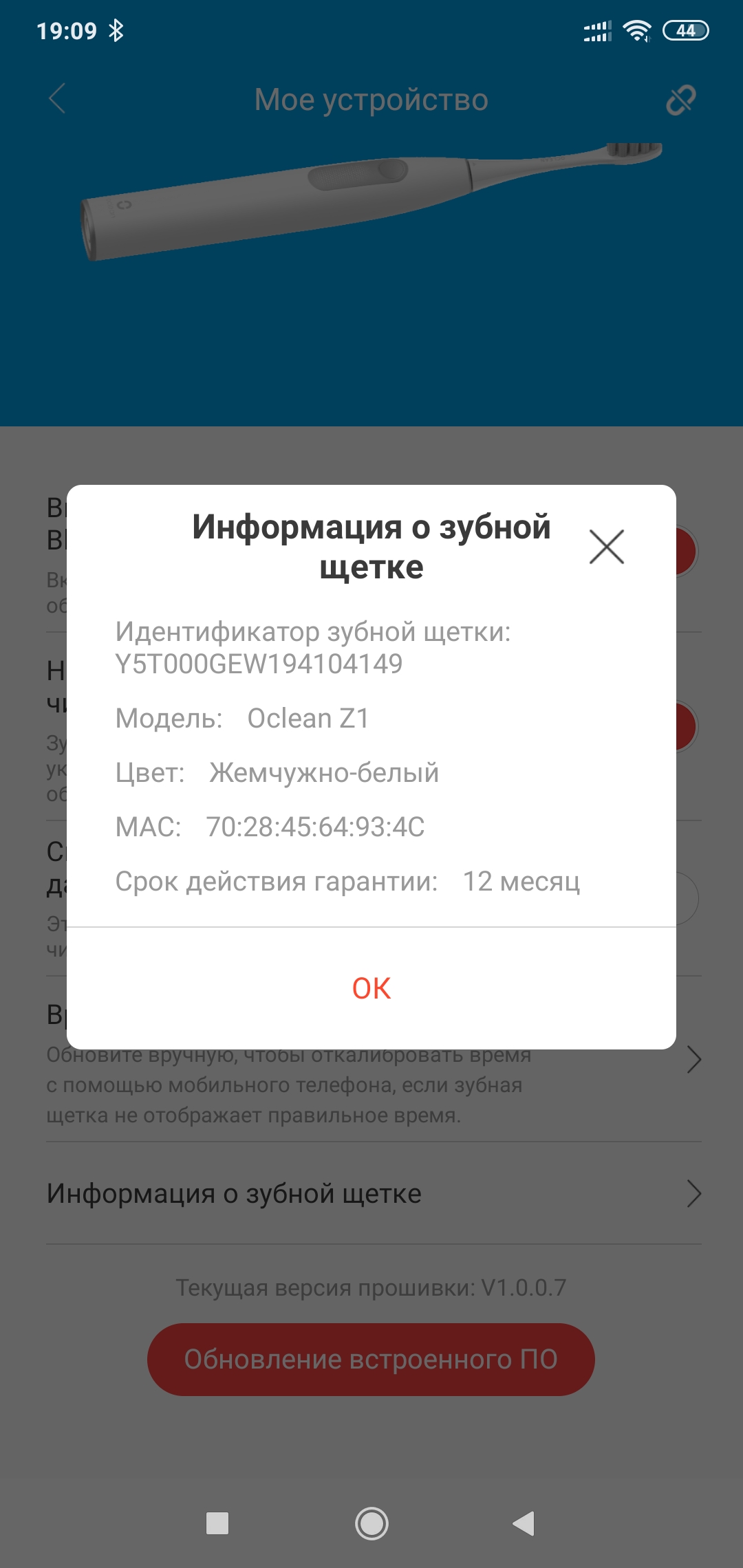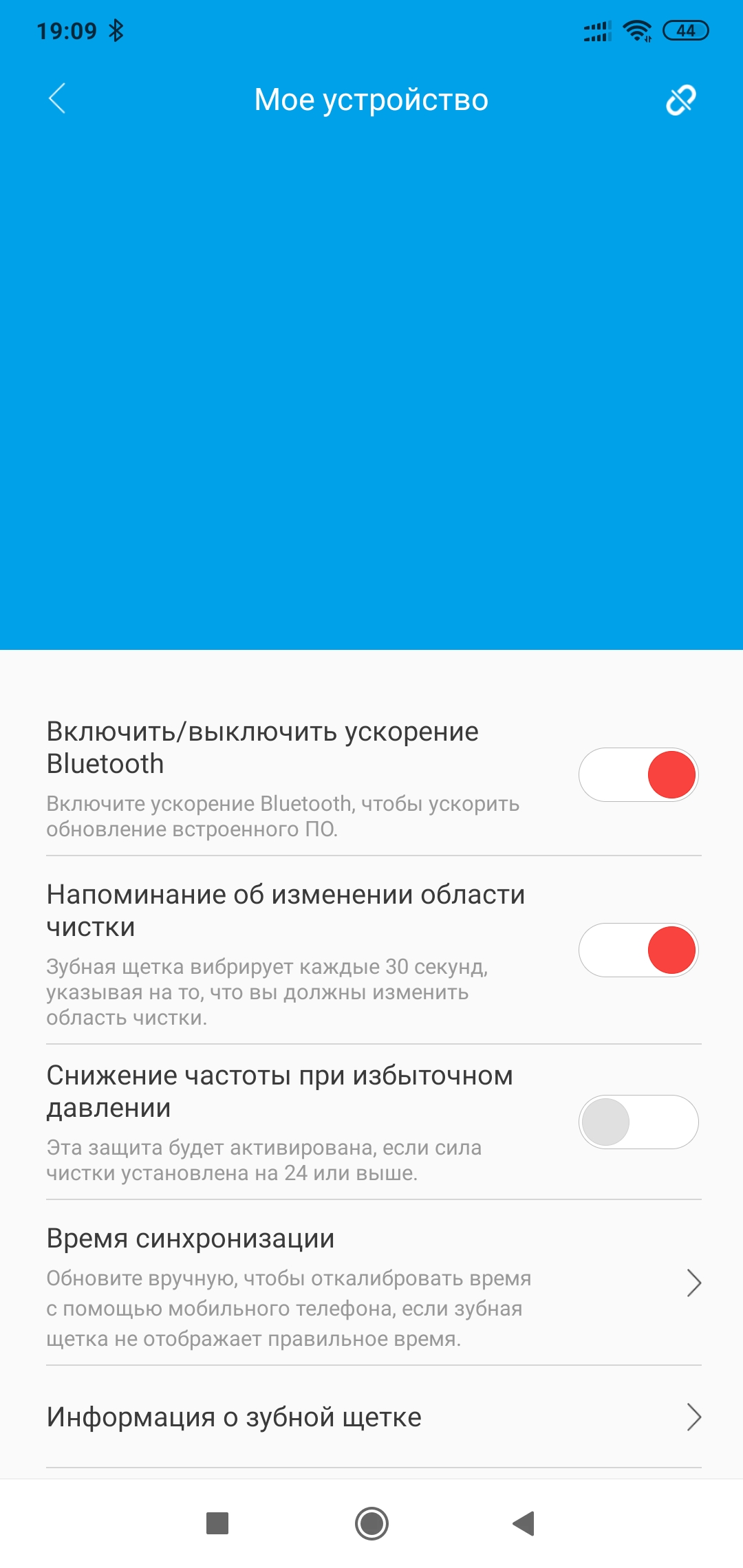 В меню устройства можно настроить дополнительные опции — ускорение Bluetooth, это лучше делать для обновления прошивки, кратковременное изменение частоты вибрации каждые 30 секунд, для смены зоны чистки. Можно включить режим уменьшение частоты вибрации при сильном давлении на зубы. Тут же имеется информация о зубной щетке.