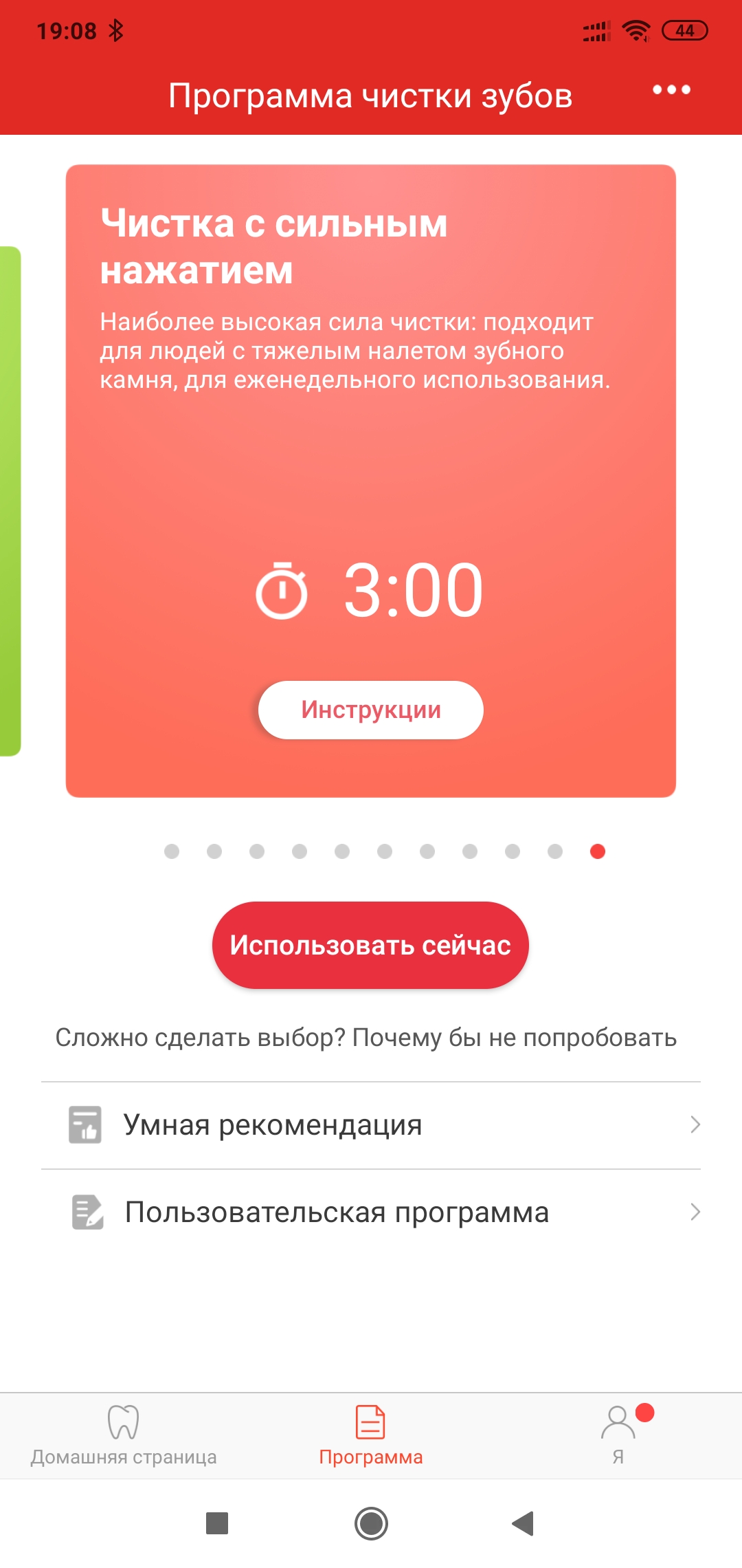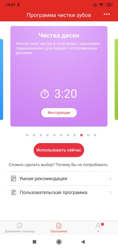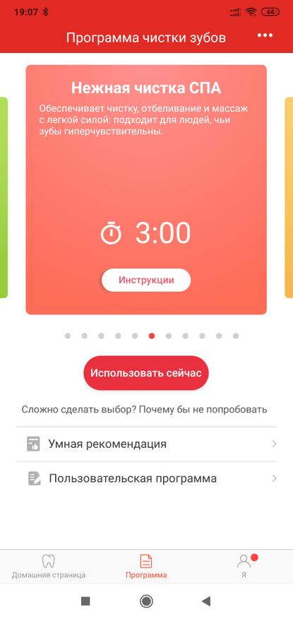 Всего в приложении можно выбрать 11 программ для чистки зубов на любой вкус — от деликатной для чувствительных зубов и стандартной ежедневной, до режима чистки брекетов и очень сильного отбеливания. Каждый сможет найти то что ему подойдет лучше всего