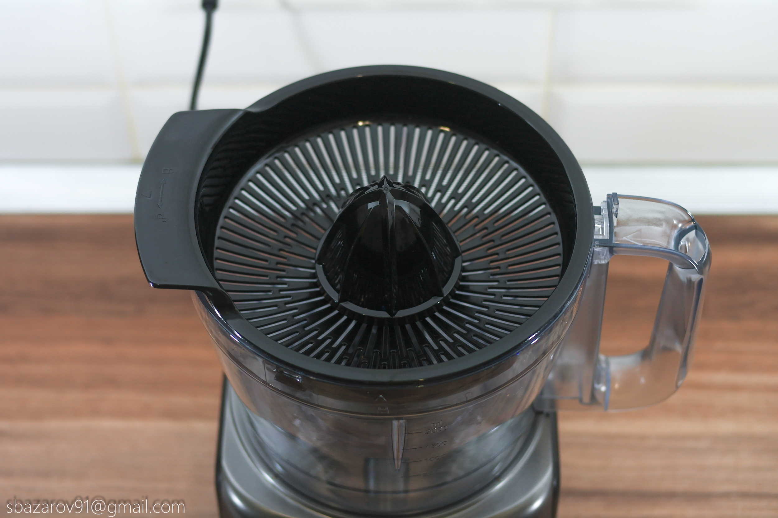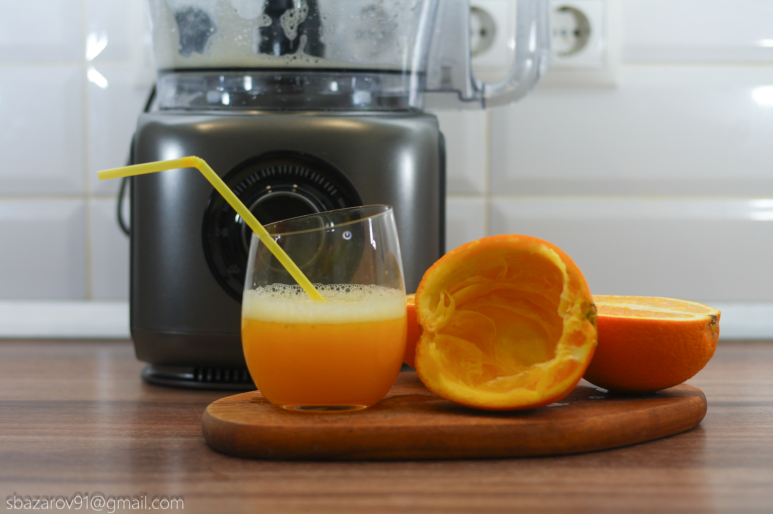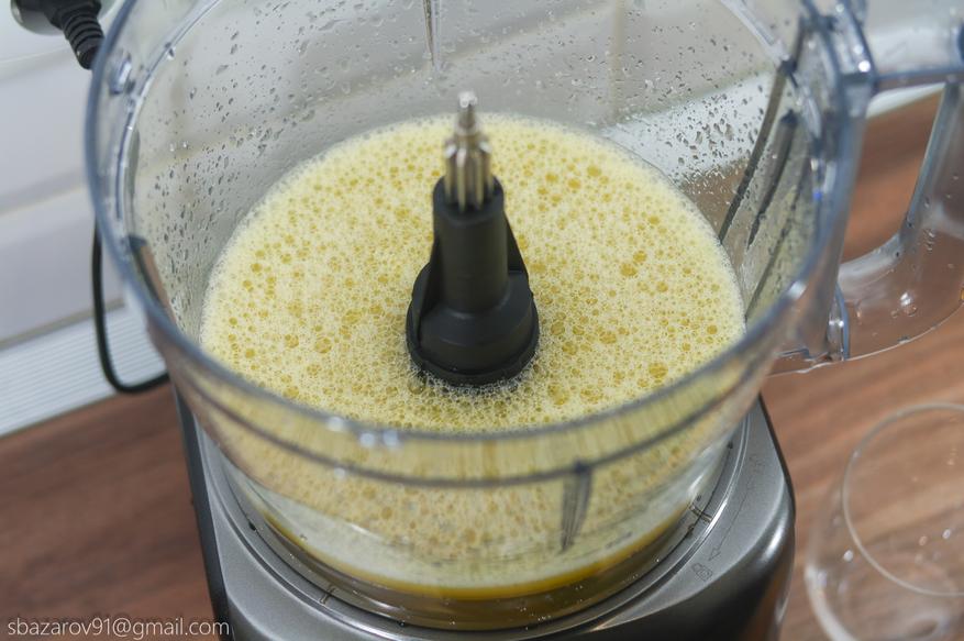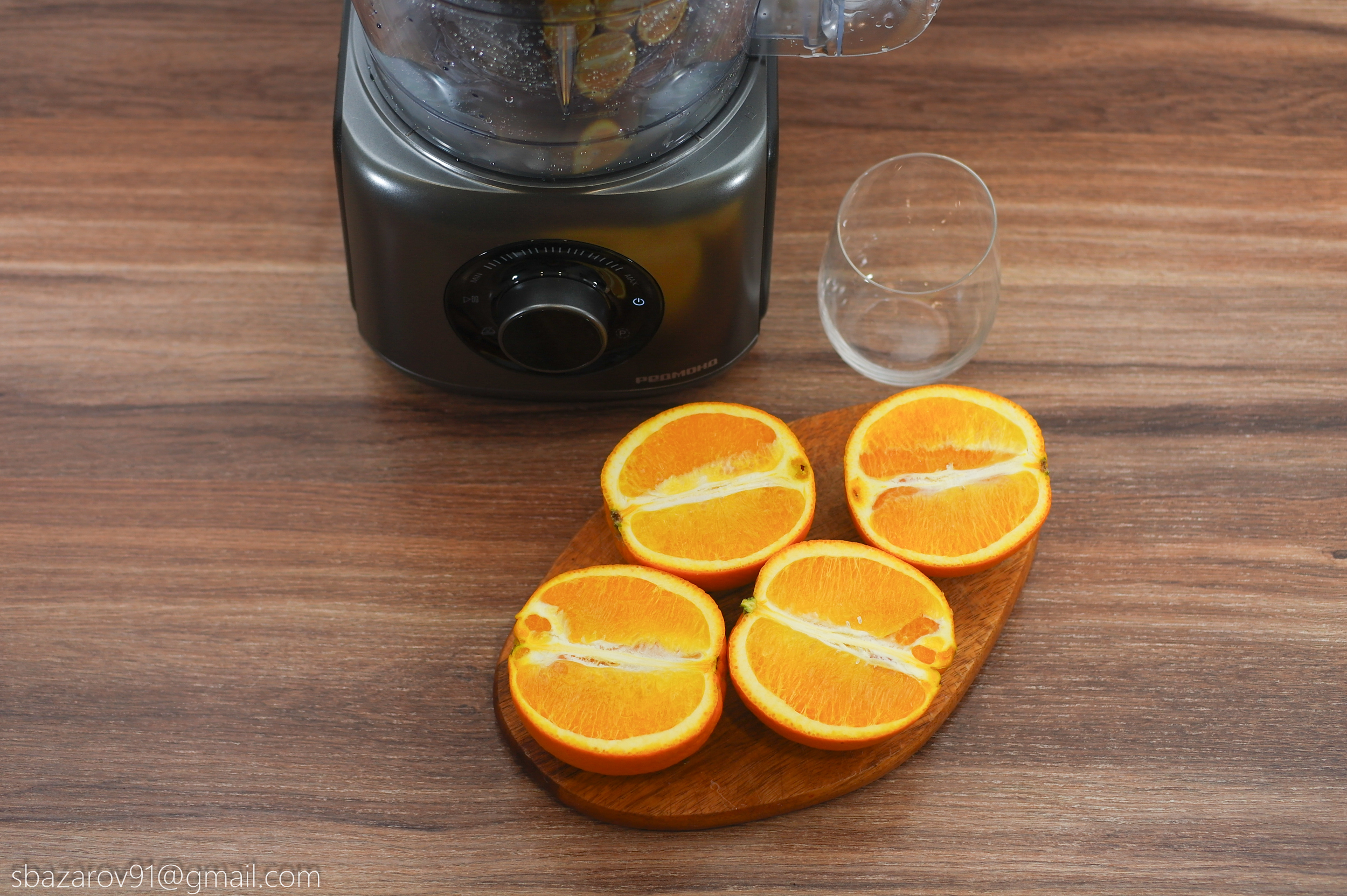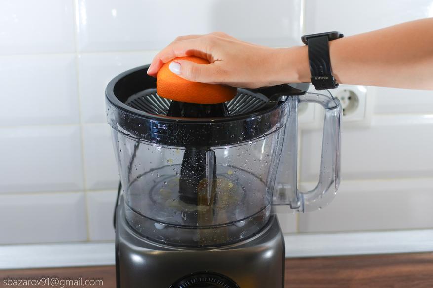 Третья насадка выступает в роли соковыжималки и позволяет получить свежие домашние соки из любых видов цитрусовых. Для теста возьмем апельсины и разрежем их пополам. Так как опыта с соковыжималками у нас не было, то вначале было не совсем понятно на каких оборотах можно получить сок. Осмысление пришло практически сразу, а обилие сока из цельного апельсина приятно удивило. Из-за конструкции насадки в виде ситечка, мякоть в соке практически отсутствует. Свежевыжатый сок на порядок вкуснее того, что продают в магазине.