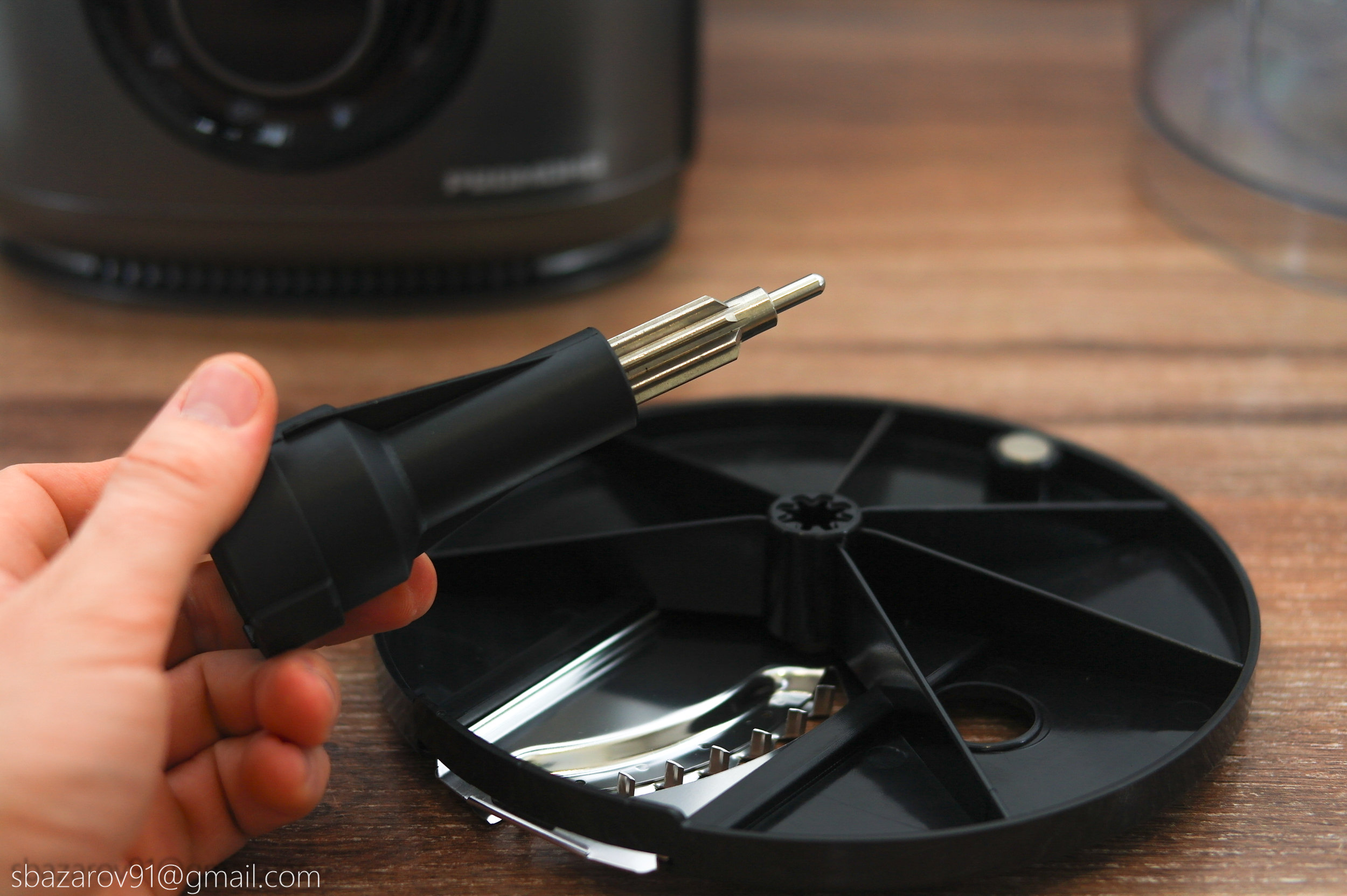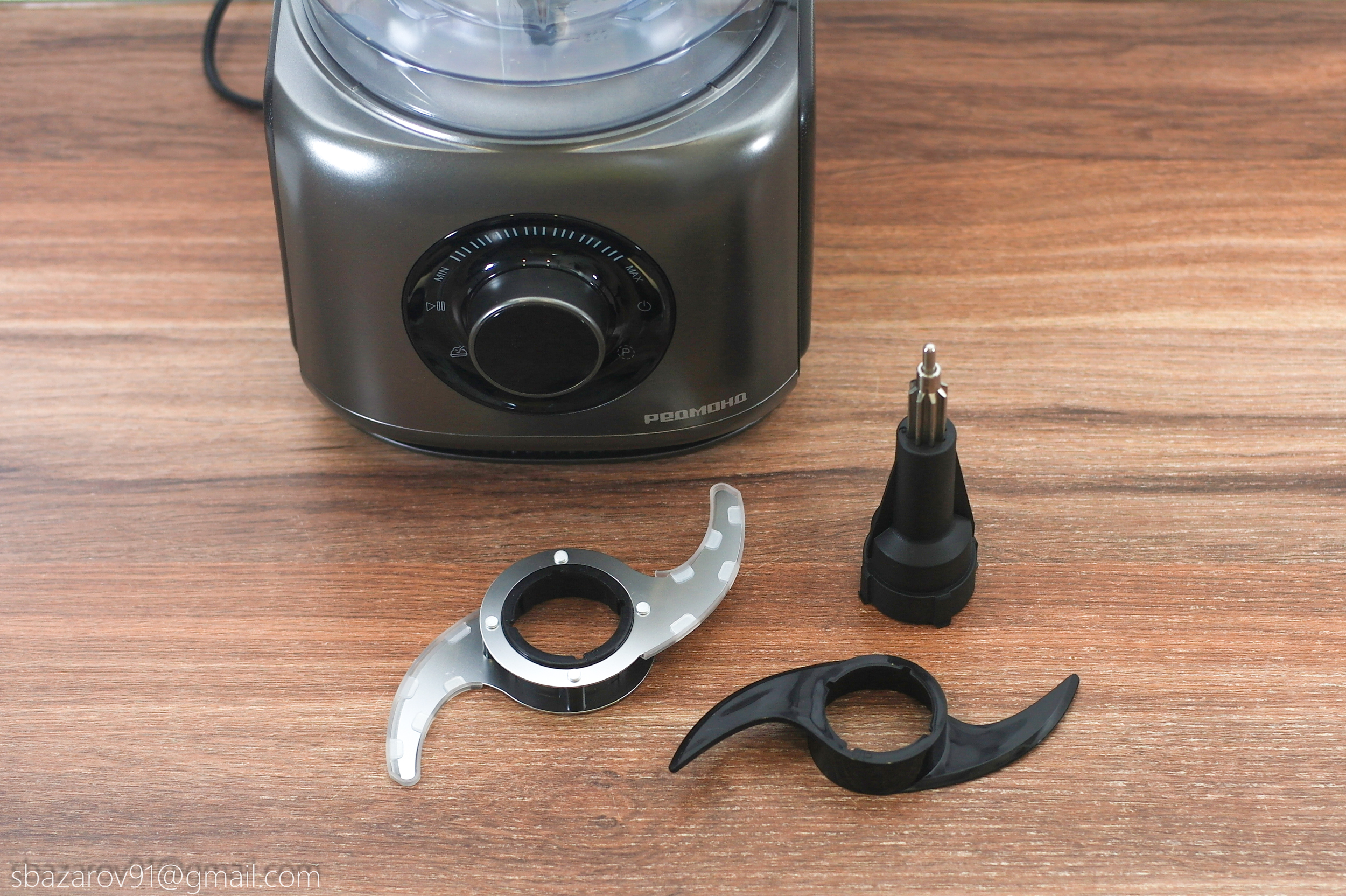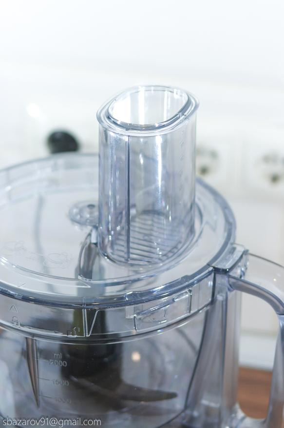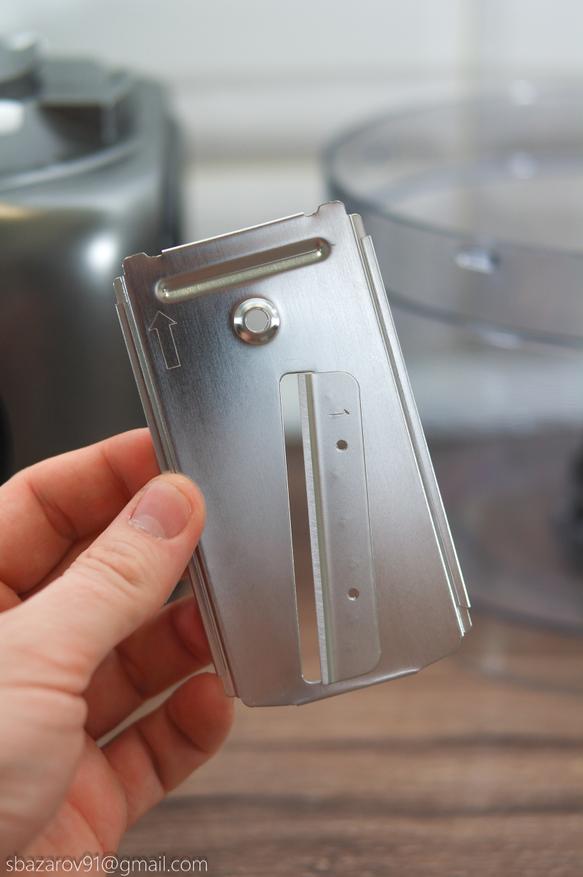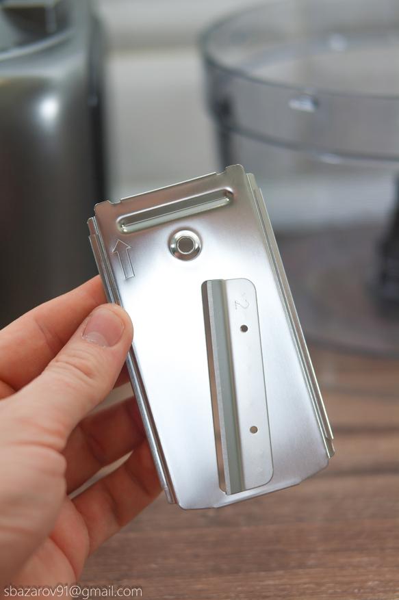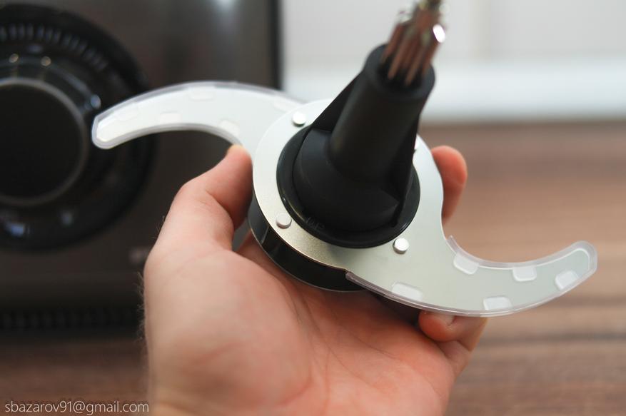 В этой чаше используются два вида ножей: пластиковый для теста и металлический для измельчения мяса, сыра и овощей. Оба ножа устанавливаются на съемную втулку и фиксируются внизу.