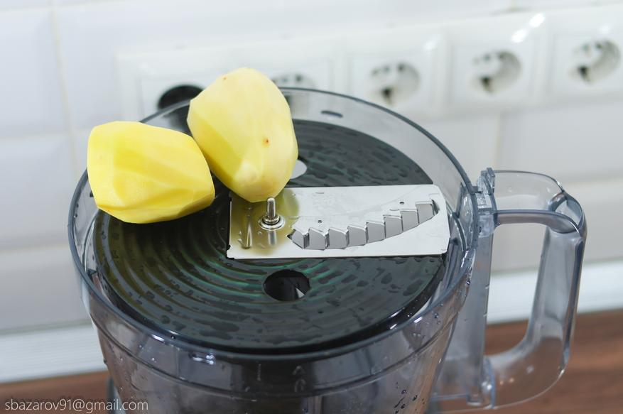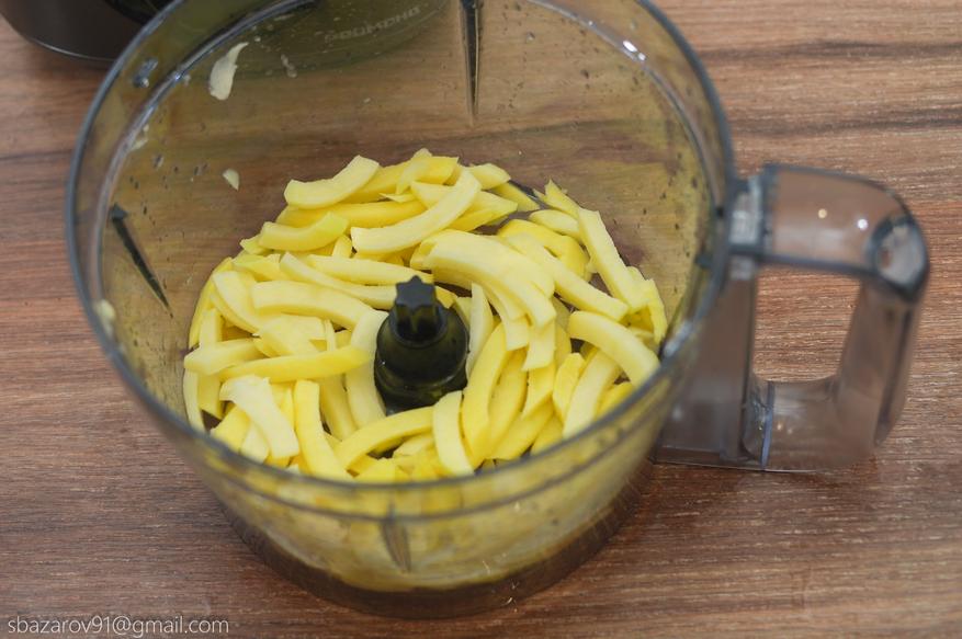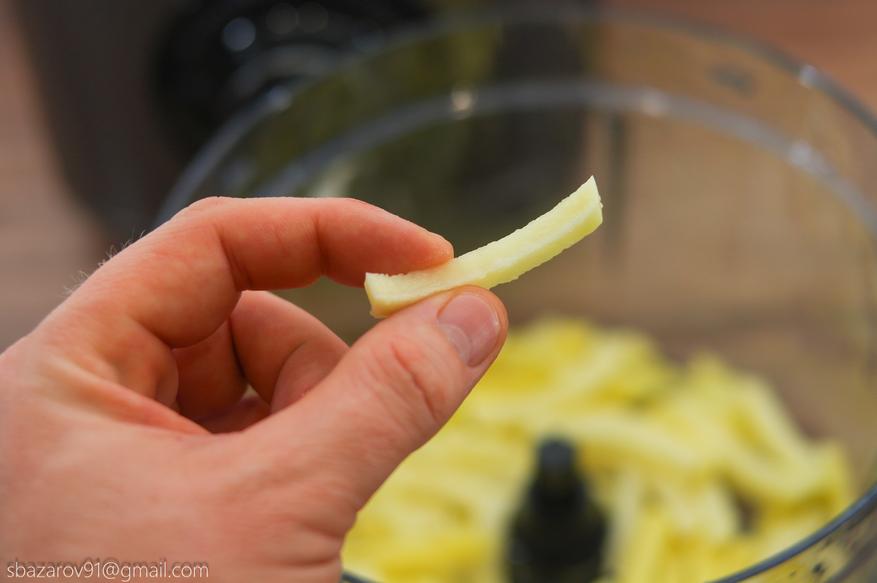 Меняем шинковку на насадку для нарезки картофеля фри. Конечный продукт идеально подойдет для жарки во фритюре или на сковороде. Для достижения лучшего результата можно взять большие картофелины и получить полноразмерную картошку фри. Время, потраченное на 2 картошки, не превысило 3 секунд. Теперь для того, чтобы накормить большую семью достаточно одной минут нарезки.