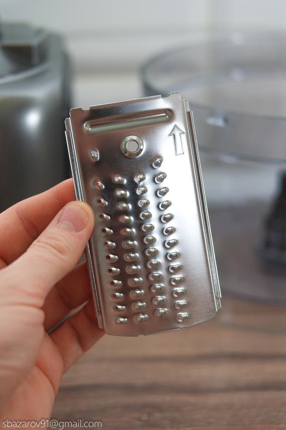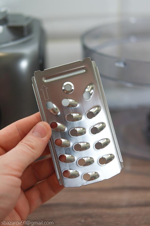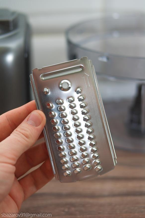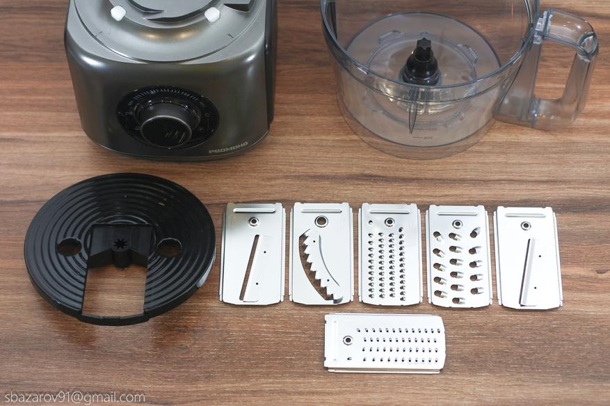Вместо ножей можно установить диск для терки/шинковки, в комплекте предлагается шесть типов: крупная терка, средняя терка, мелкая терка, крупная шинковка, мелкая шинковка и шинковка для картофеля фри.