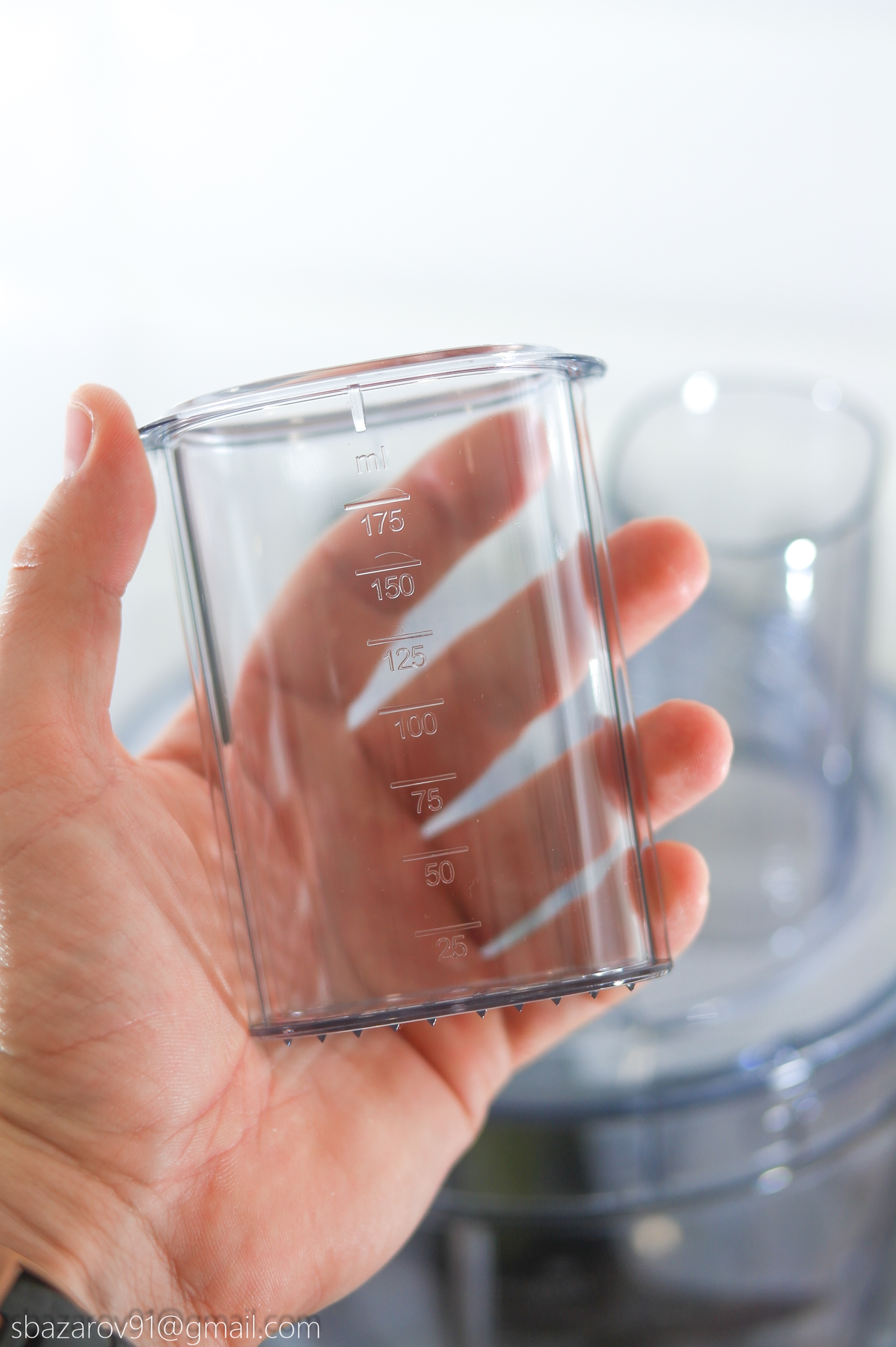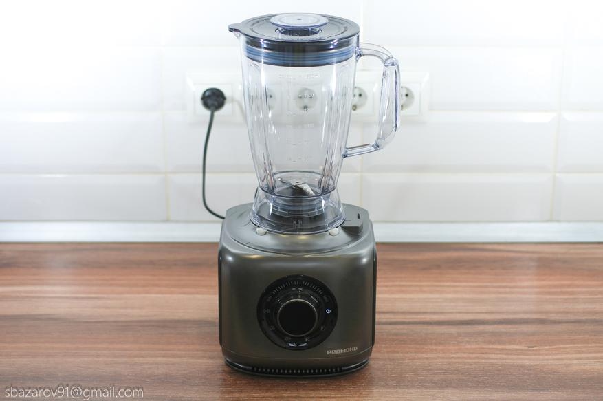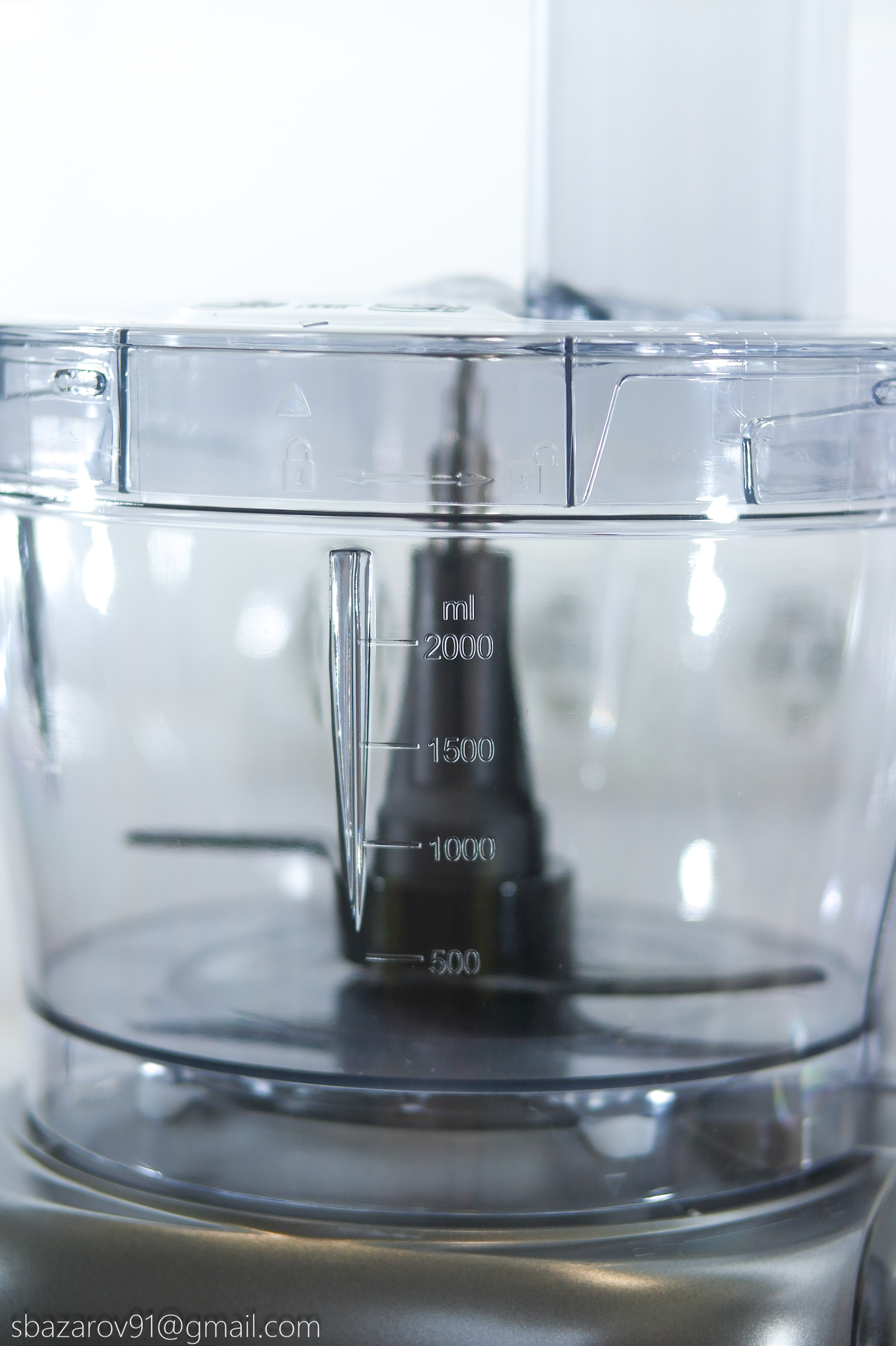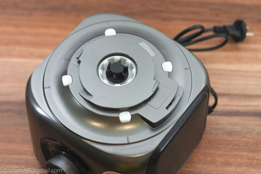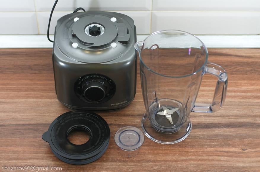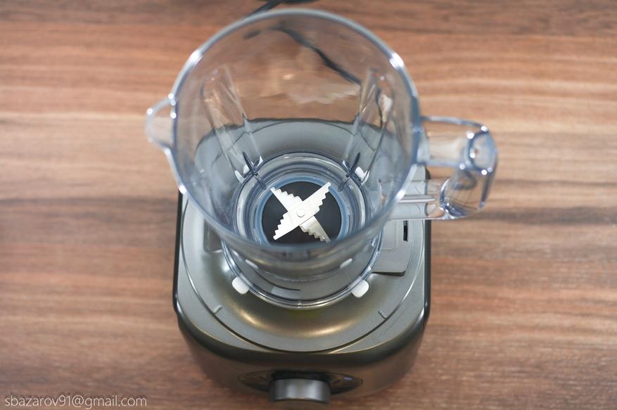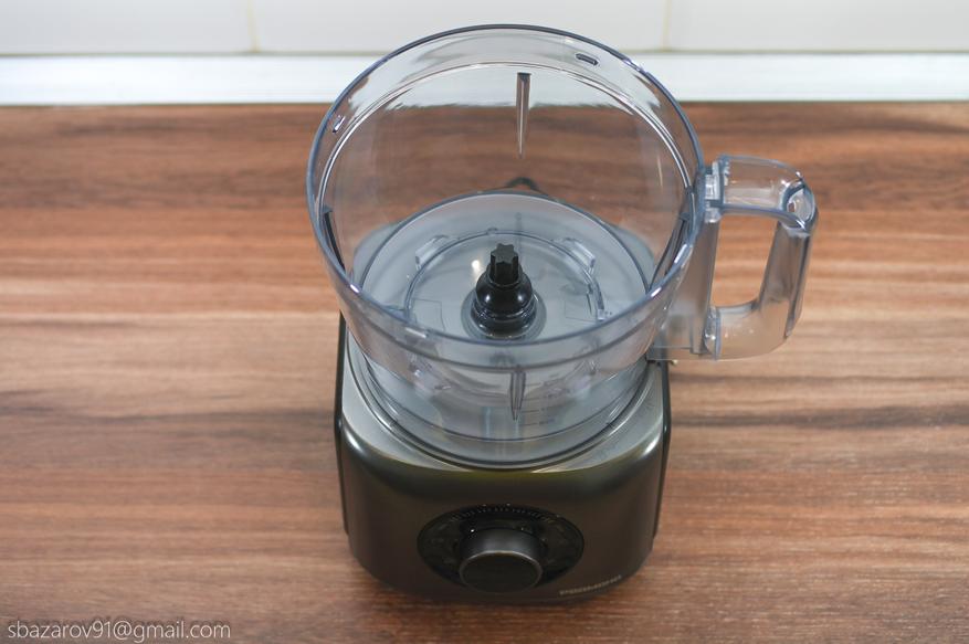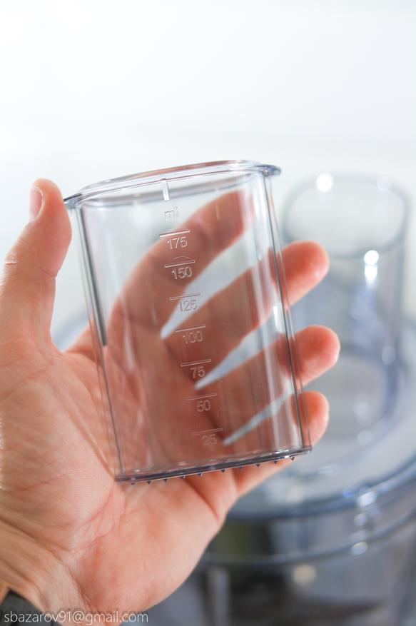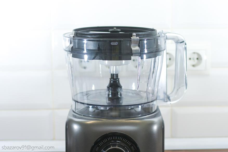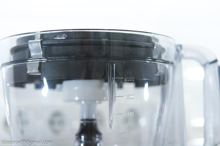 На основании устанавливается прозрачная чаша объемом 3500 мл (полезный объем — 2000 мл), которая выполняет множество функций в сочетании с различными насадками. В центре чаши расположен соединительный вал, а сама чаша устанавливается на основание, совмещая специальные пазы.