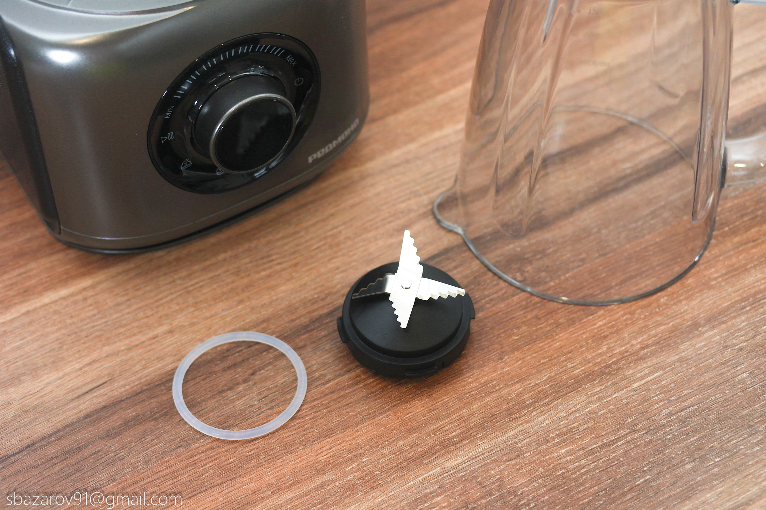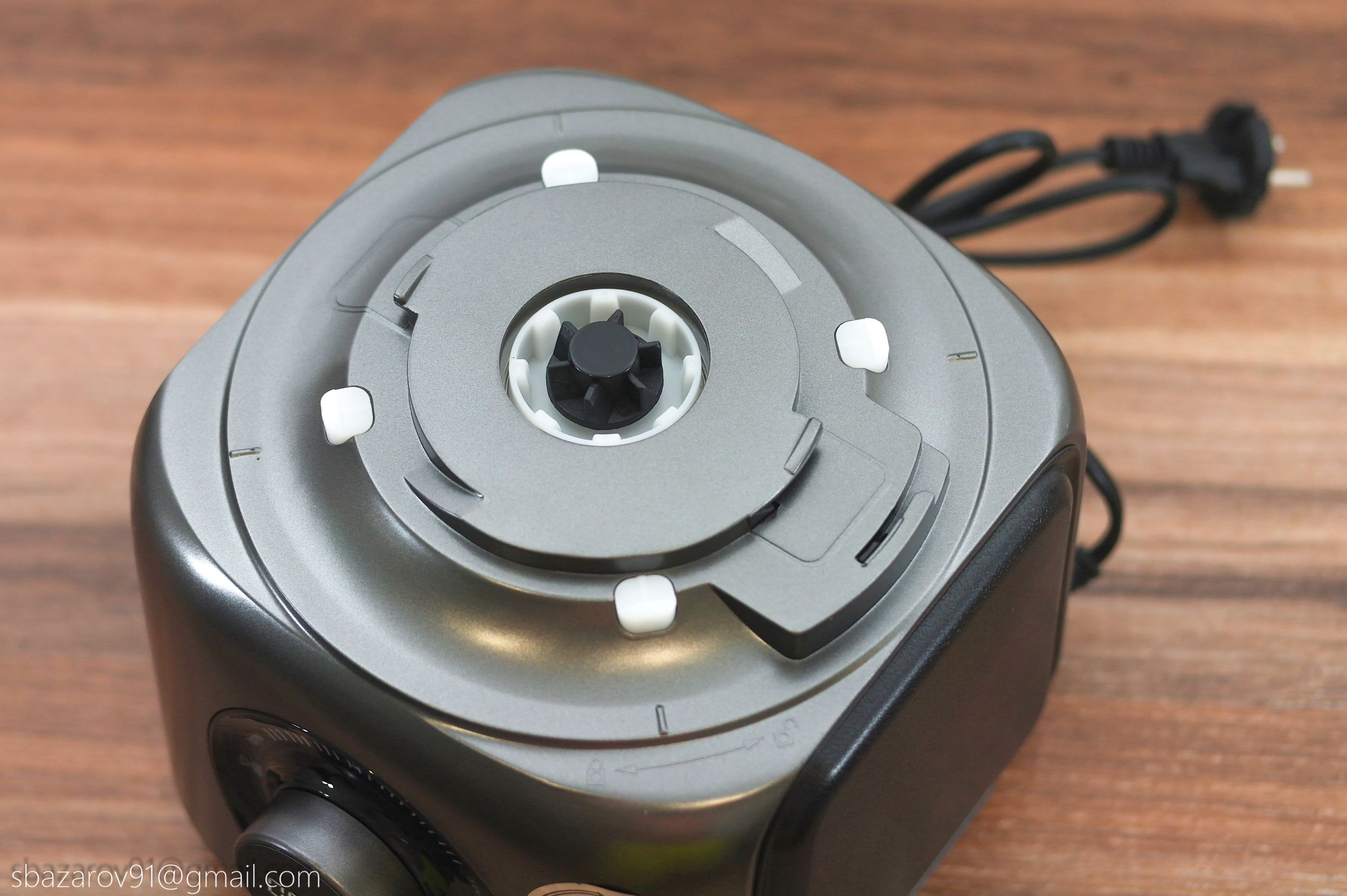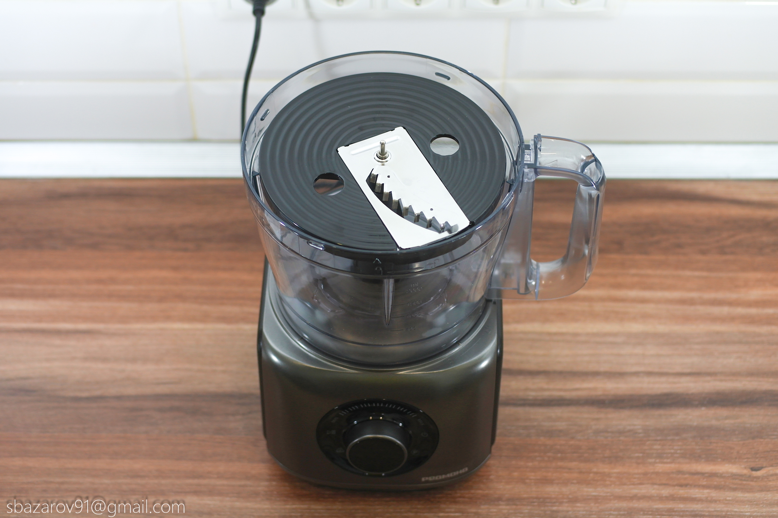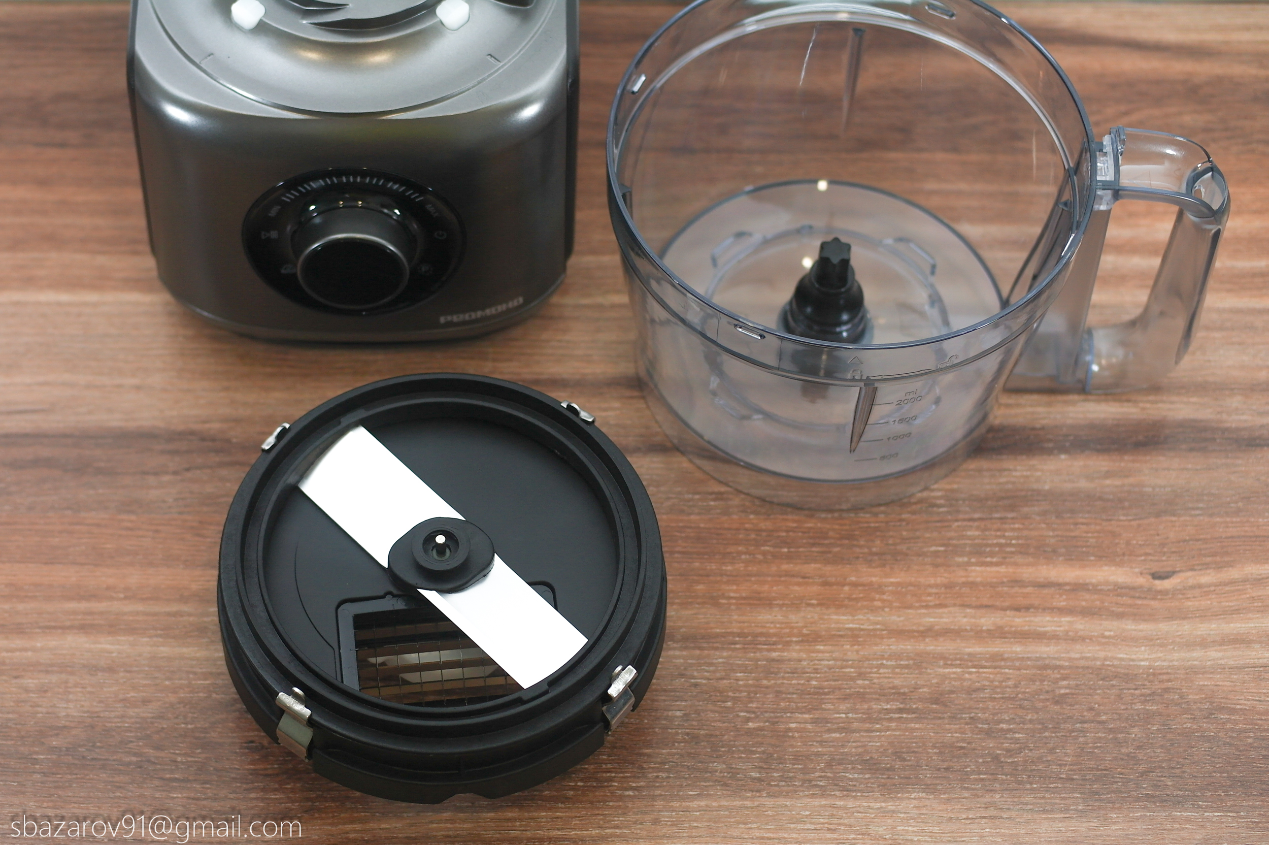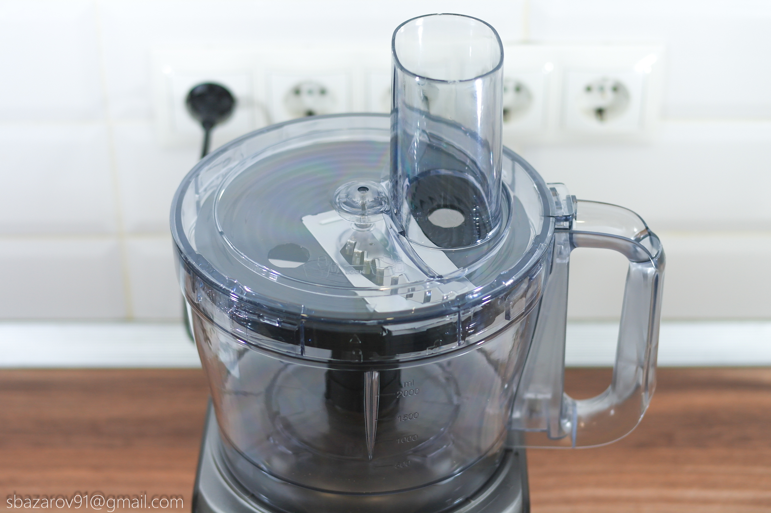 На основании устанавливается прозрачная чаша объемом 3500 мл (полезный объем — 2000 мл), которая выполняет множество функций в сочетании с различными насадками. В центре чаши расположен соединительный вал, а сама чаша устанавливается на основание, совмещая специальные пазы.