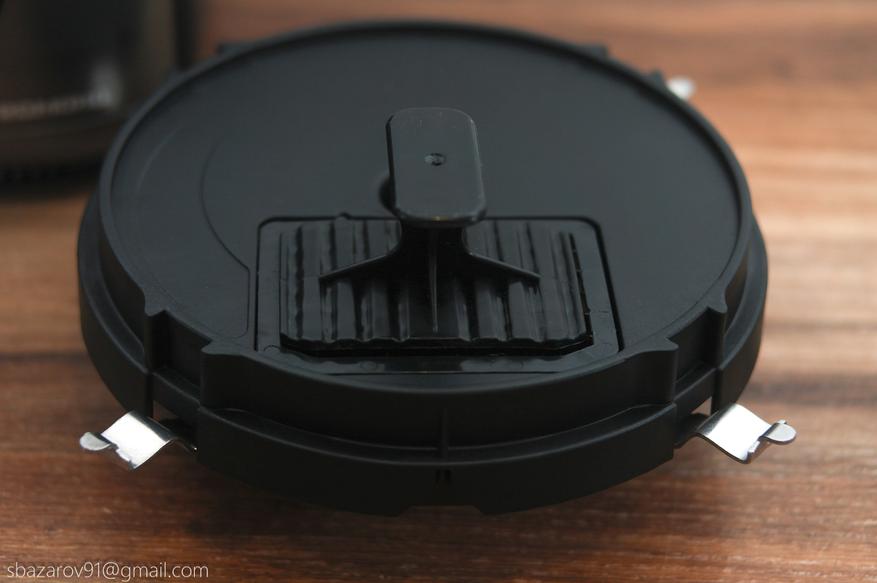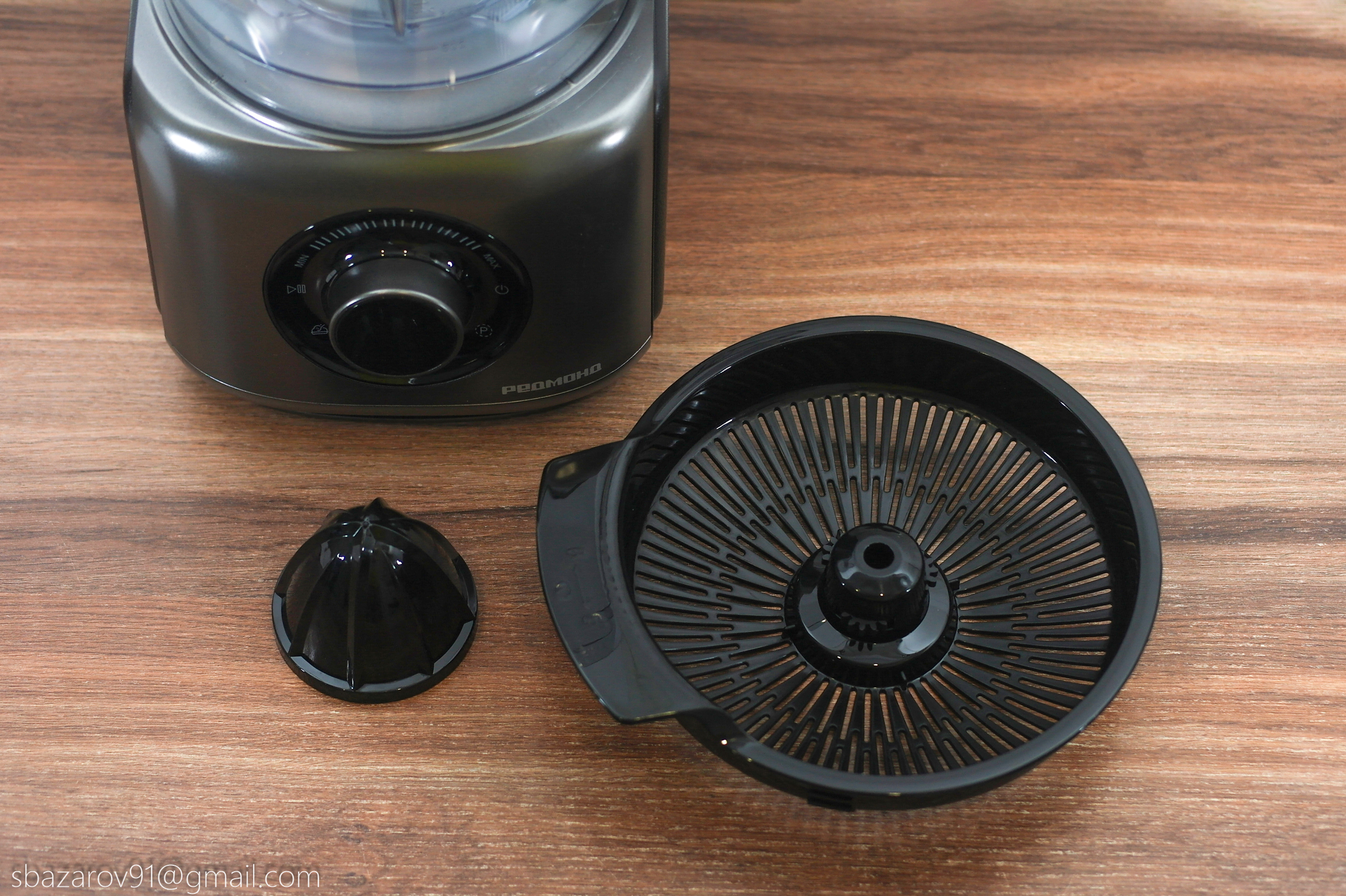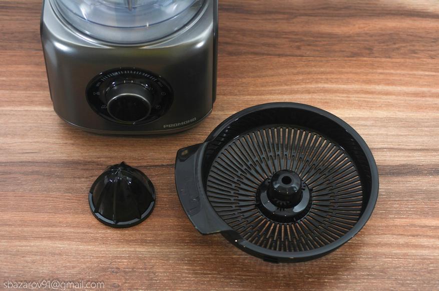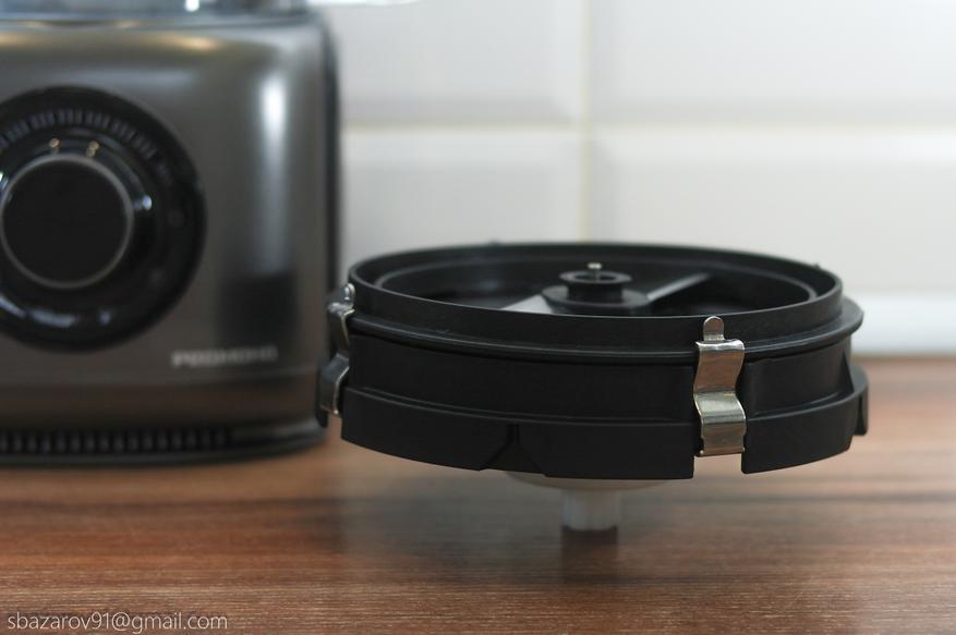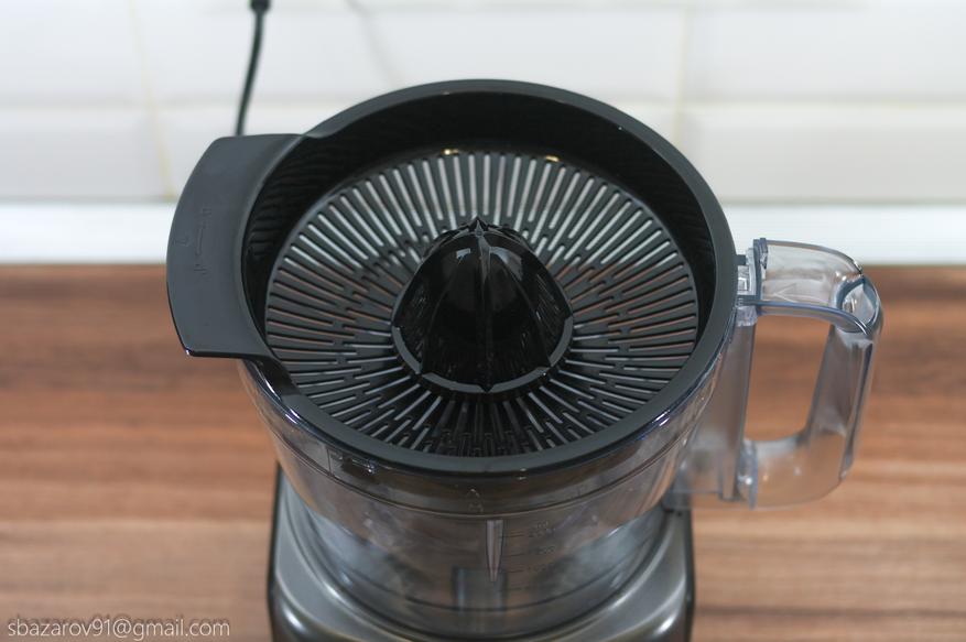 Финальной насадкой, используемой с чашей, является поддон решетки соковыжималки для цитрусовых. Он устанавливается сверху чаши на съемную втулку и фиксируется в определённом положении. В центральную часть насадки одевается вращающаяся головка соковыжималки, на которую мы и будет использовать совместно с чашей.