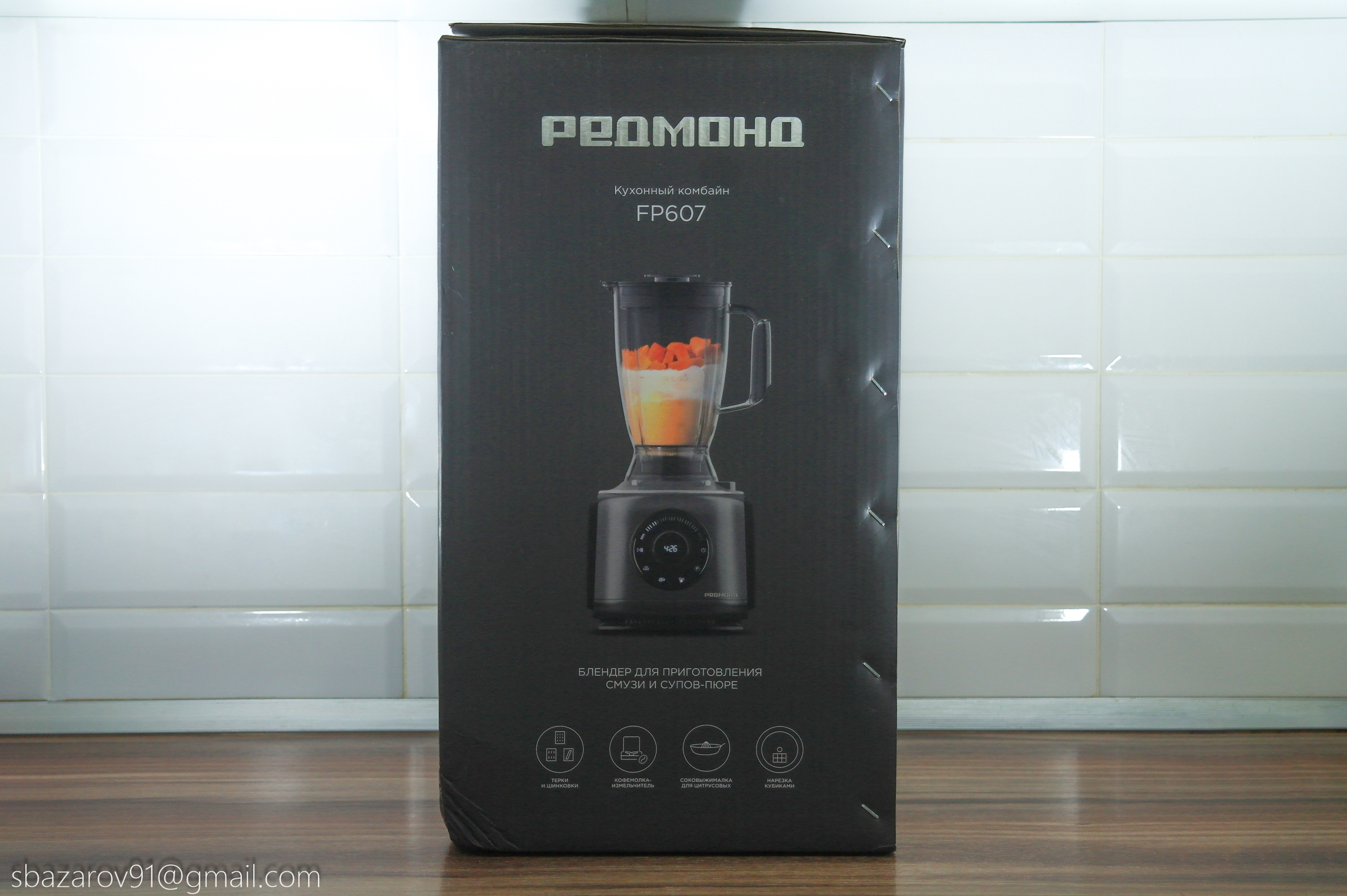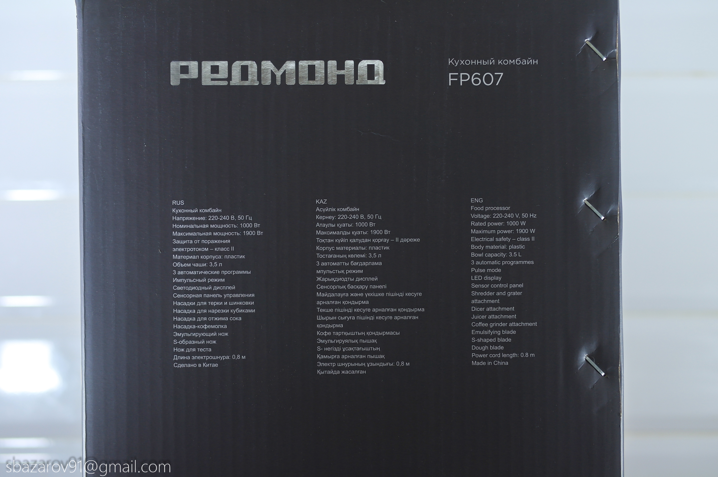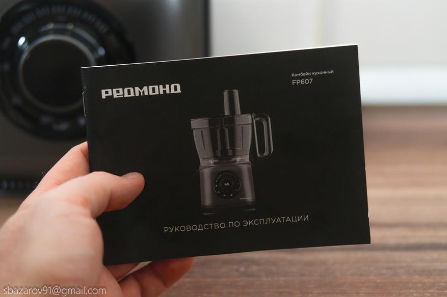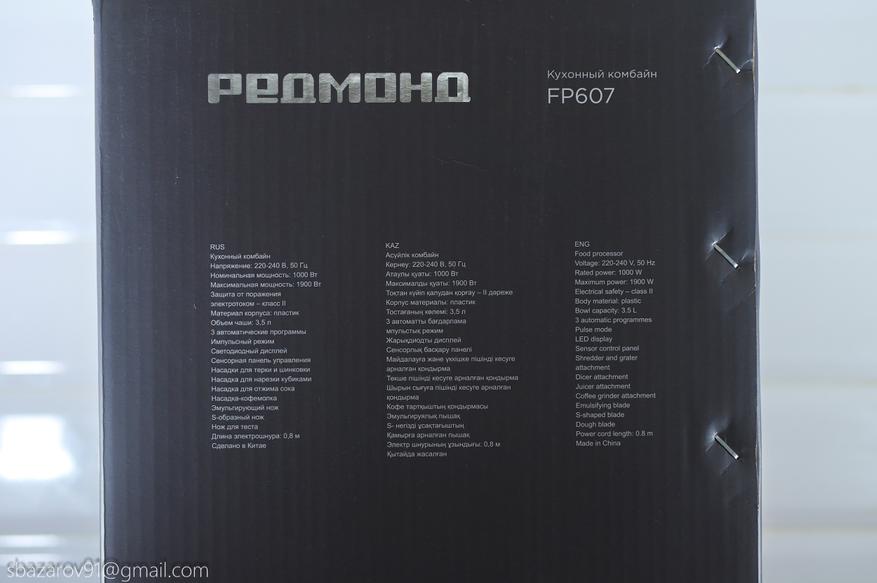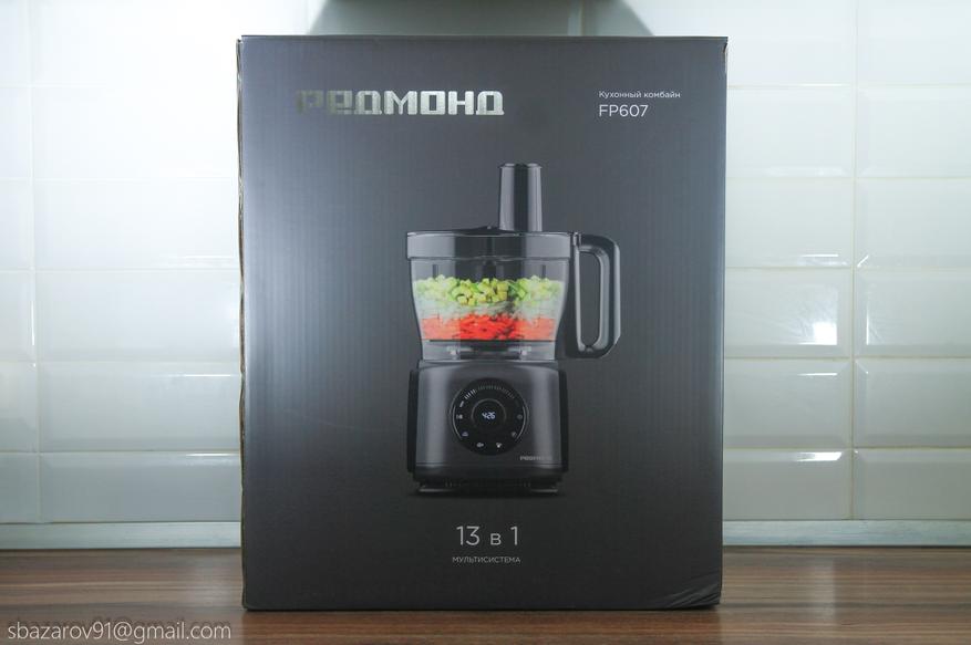 При приобретении кухонного комбайна REDMOND FP607 я столкнулся с большими размерами упаковки, занимающей почти всё пространство на кухне, от столешницы до нижнего края навесных шкафов. Упаковка выполнена в привычном черном оформлении с изображением комбайна в действии. Однако есть и изменения — название бренда теперь написано на русском языке.
