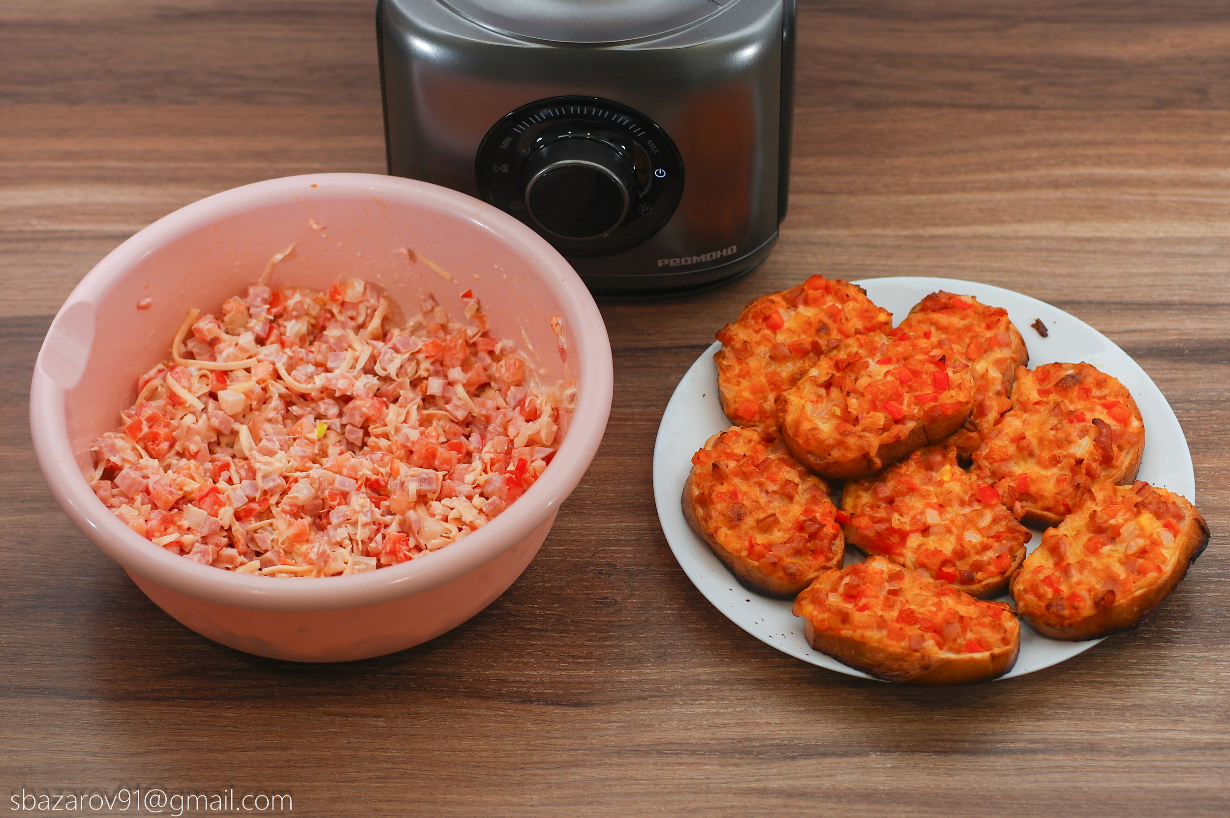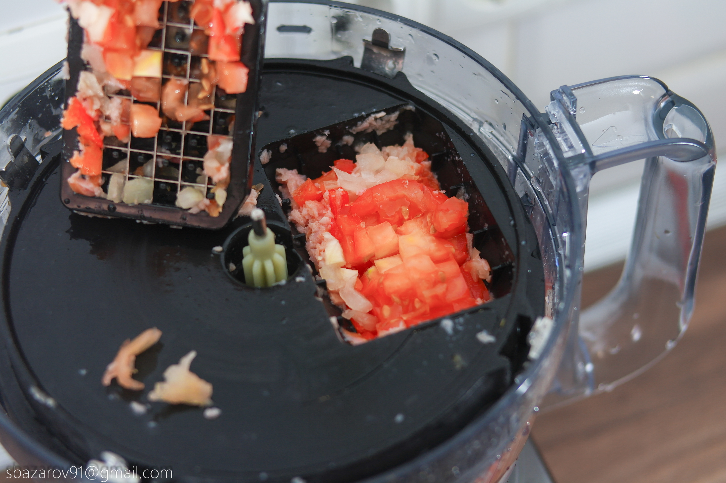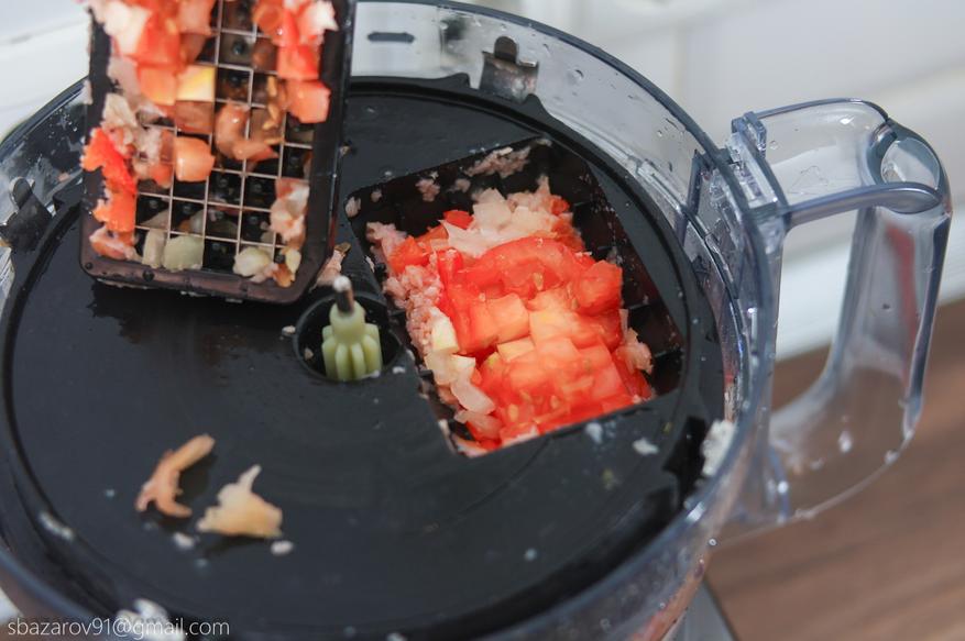 Пока насадка была установлена решили быстро приготовить горячие бутерброды. Заодно попробуем измельчить томаты, так как они заведомо мягкие по консистенции и могут доставить трудностей. На деле же оказалось все гораздо лучше: от томатов осталась только кожура, а внутренняя часть приняла форму кубиков.