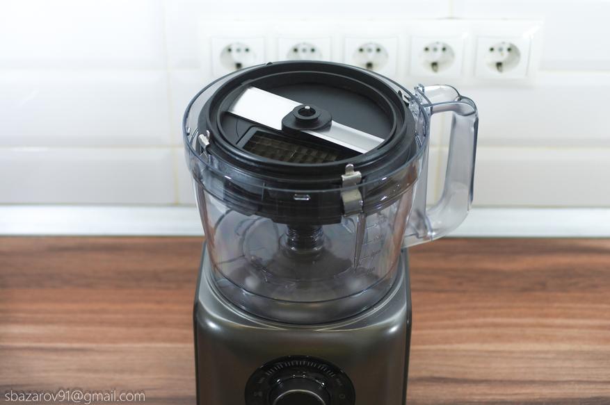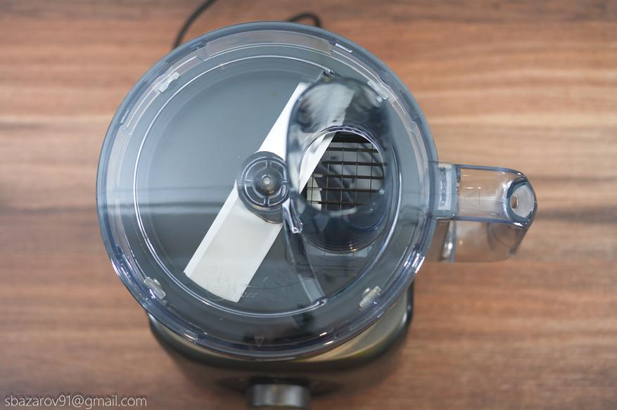 Для начала работы необходимо установить верхнюю крышку с отверстием для подачи продуктов. В комплекте также имеется толкатель с мерной шкалой на 200 мл.