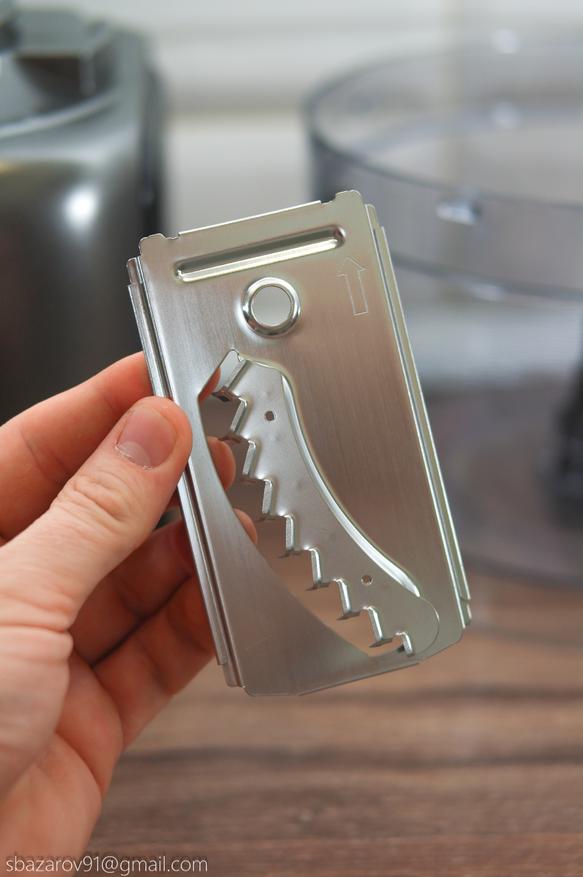 Данная насадка устанавливается на собственную втулку, приподнимая её над резервуаром. Однако, при работе насадки продукты могут скапливаться под ней, что будет затруднять её работу. Поэтому периодически стоит трясти чашу для равномерного распределения нарезанного продукта. Благодаря своей конструкции, продукты, поданные через отверстие, затягиваются автоматически, т. е не нужно их «подгонять» толкателем.