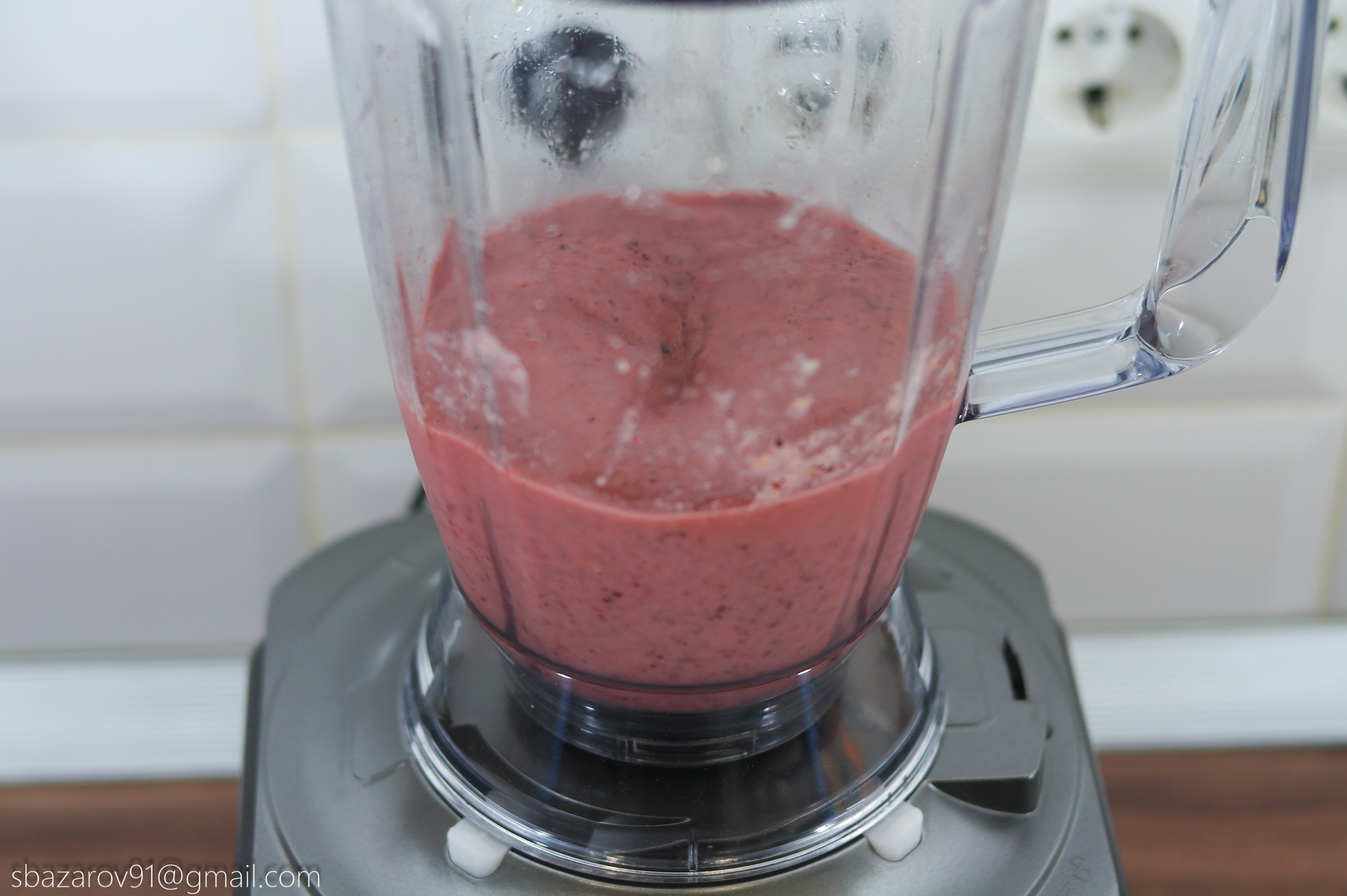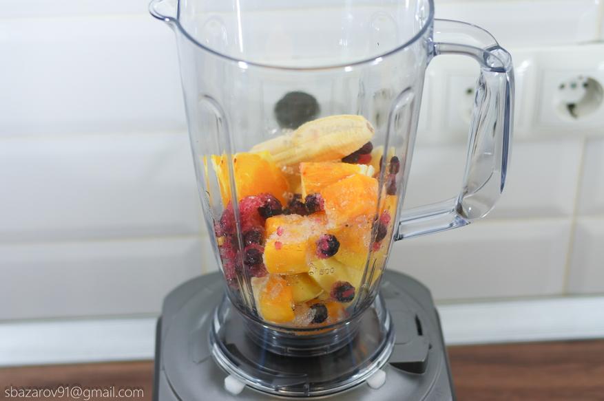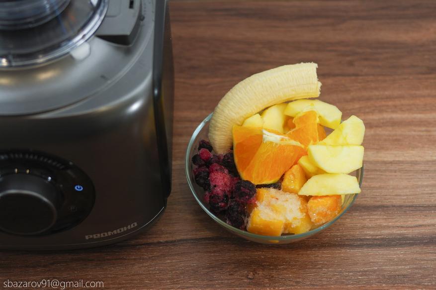 Четвертая насадка представляет собой блендер, дающий равномерное смешивание ингредиентов для получения детского питания, освежающих коктейлей, смузи и супов-пюре. Достаём мороженные фрукты, нарезаем дольками апельсины и разбавляем все это бананами. Из-за твердых мороженных фруктов, блендеру было тяжело перемолоть субстанцию даже на максимальных оборотах. Поэтому периодически приходилось перемешивать «кашу» лопаткой. Зато в итоге получился вкусный и питательный смузи с цитрусовыми нотками.