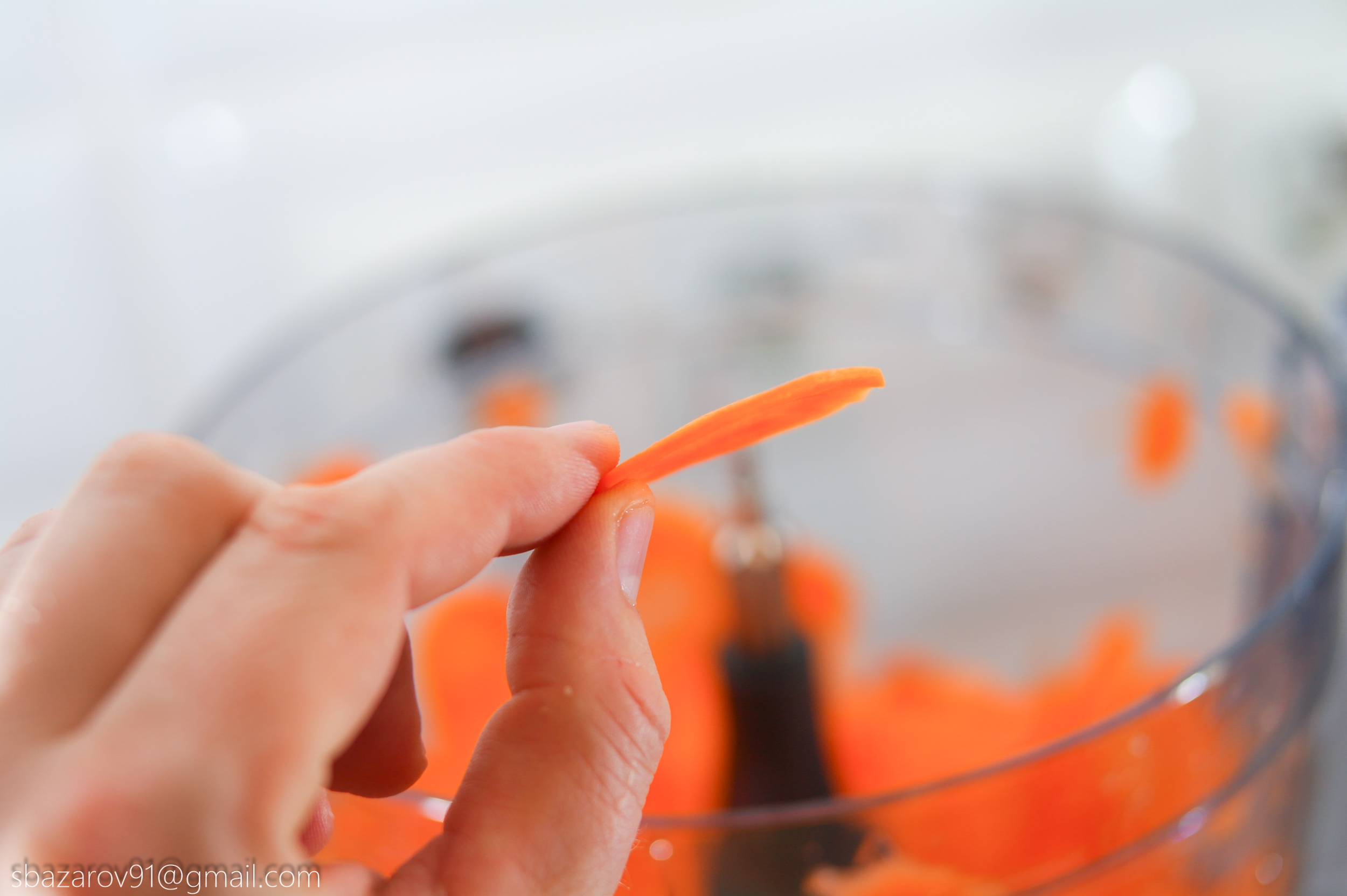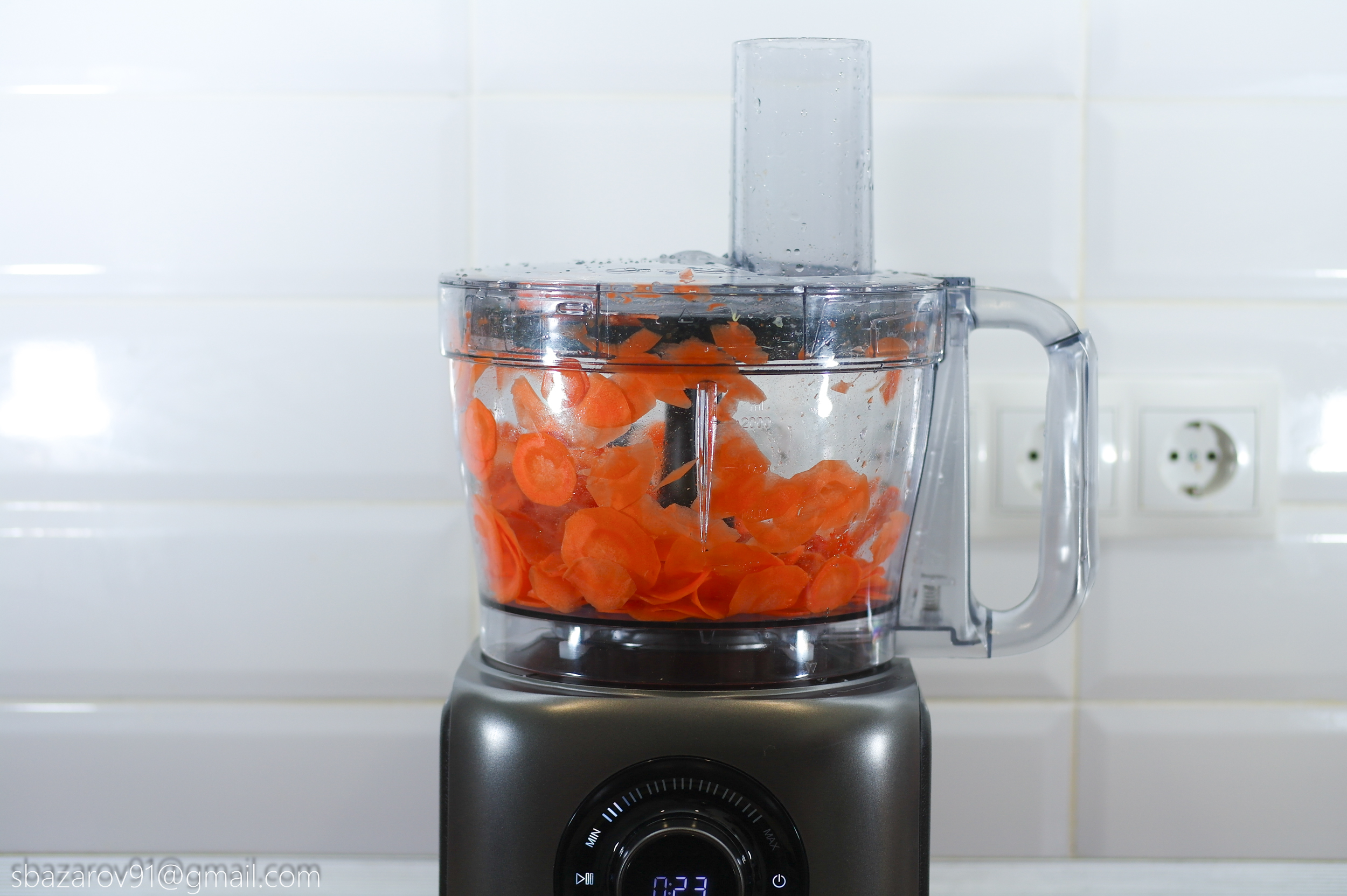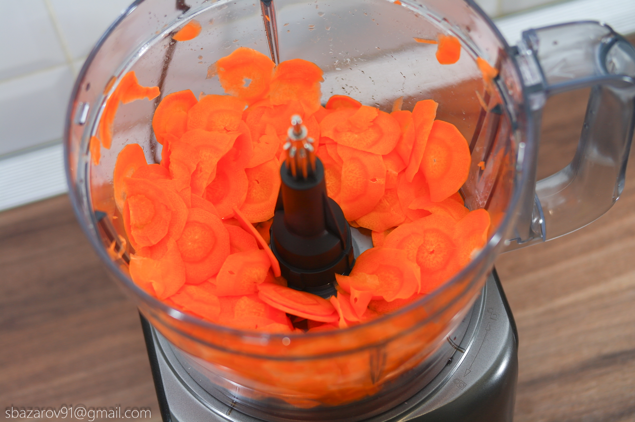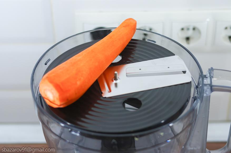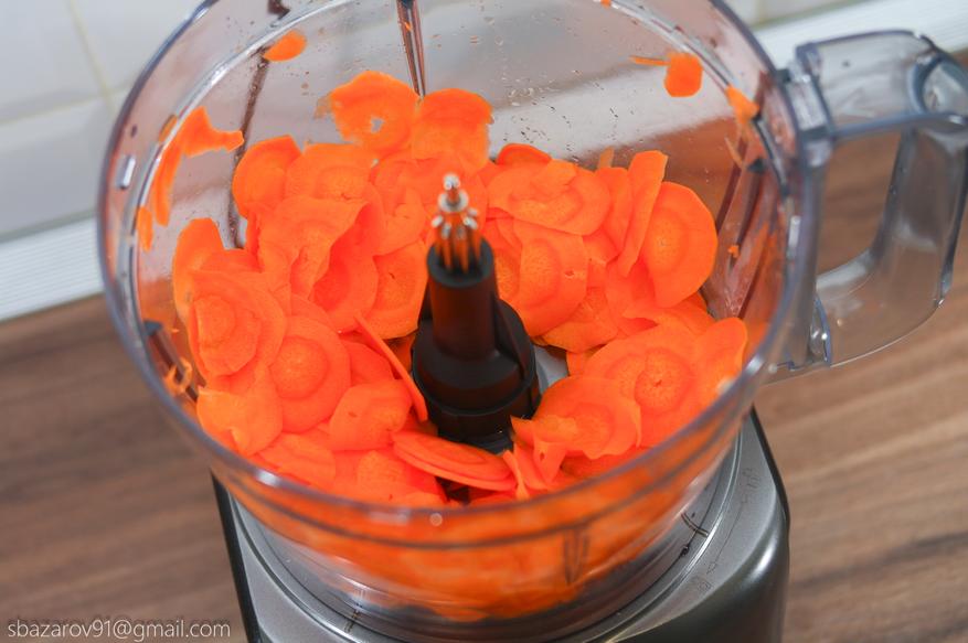 Второй на очереди выступает диск для крепления терки/шинковки. Большое количество насадок позволяют приготовить огромное количество блюд. Нам же интересен принцип и скорость работы. Для этого нарежем морковь мелкими кольцами с помощью мелкой шинковки. Как и в случае с насадкой для нарезки кубиков, за счет центробежной силы и острого ножа, морковь самостоятельно проталкивается внутрь камеры без нашего участия. Время на нарезку моркови кольцами заняло не более 10 секунд, Итоговый продукт можно засушить в духовке/аэрогриле и употреблять в качестве перекуса при просмотре любимого фильма.