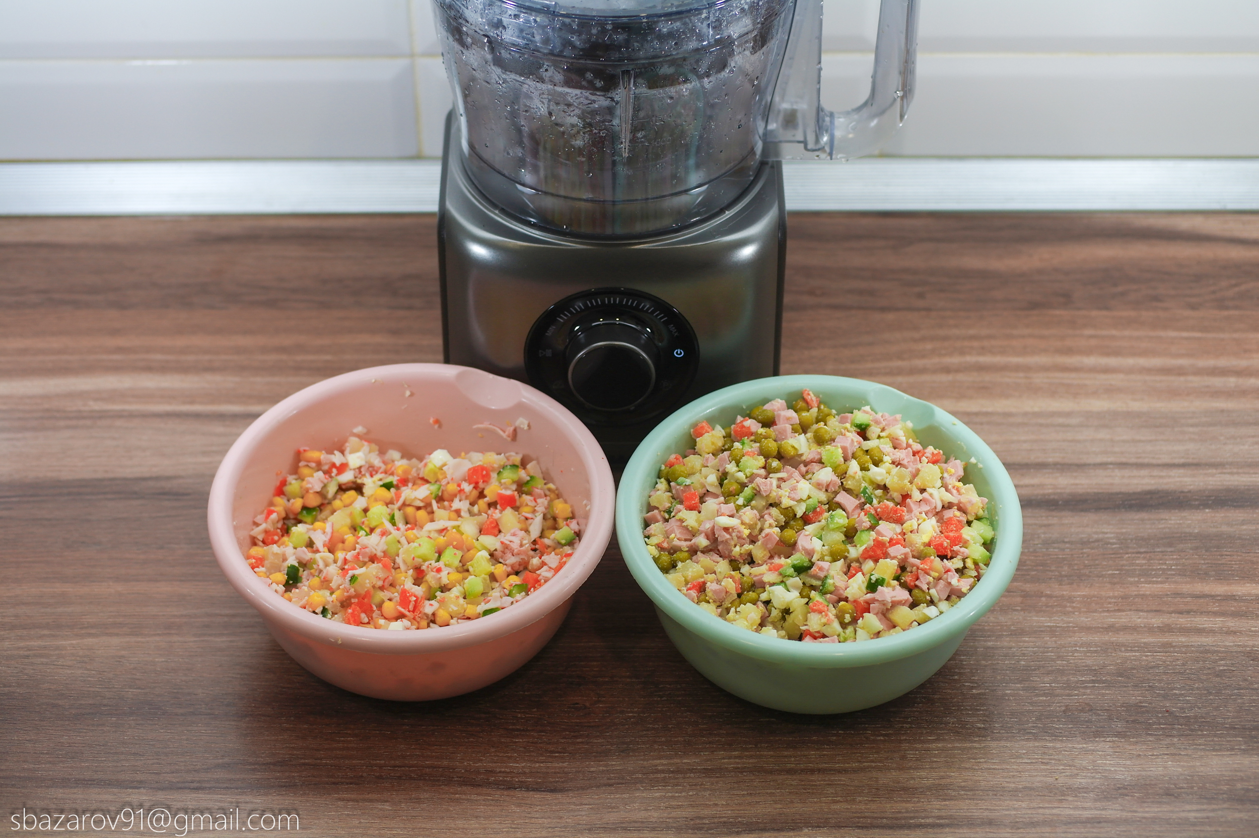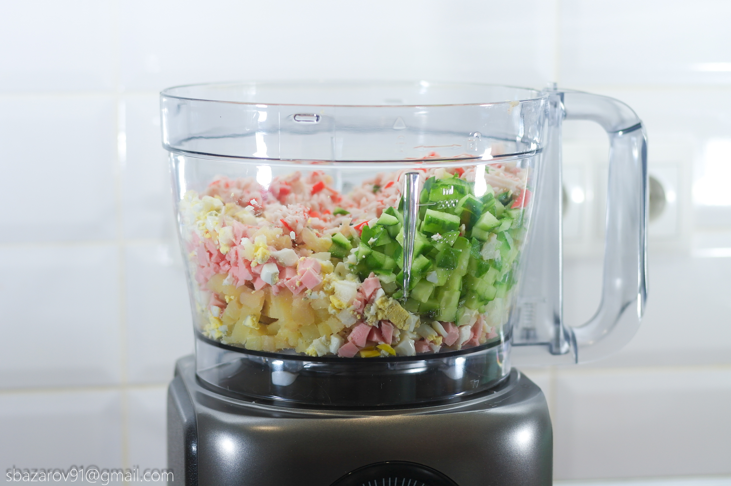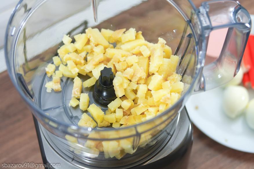 Перейдем к тестированию. Для начала испытаем насадку для нарезки кубиков и приготовил парочку салатов: оливье и крабовый. Для этого соберем необходимую конструкцию и возьмем соответствующие ингредиенты. Для нарезки кубиками достаточно погружать продукты в загрузочную трубку, после чего комбайн начнем самостоятельно их затягивать. Полученный материал идеально ровный, а время, потраченное на измельчение всех продуктов с фотографии, не занял больше 2-х минут. А теперь вспомните сколько времени и сил занимает подготовка таких салатов вручную? То-то же.