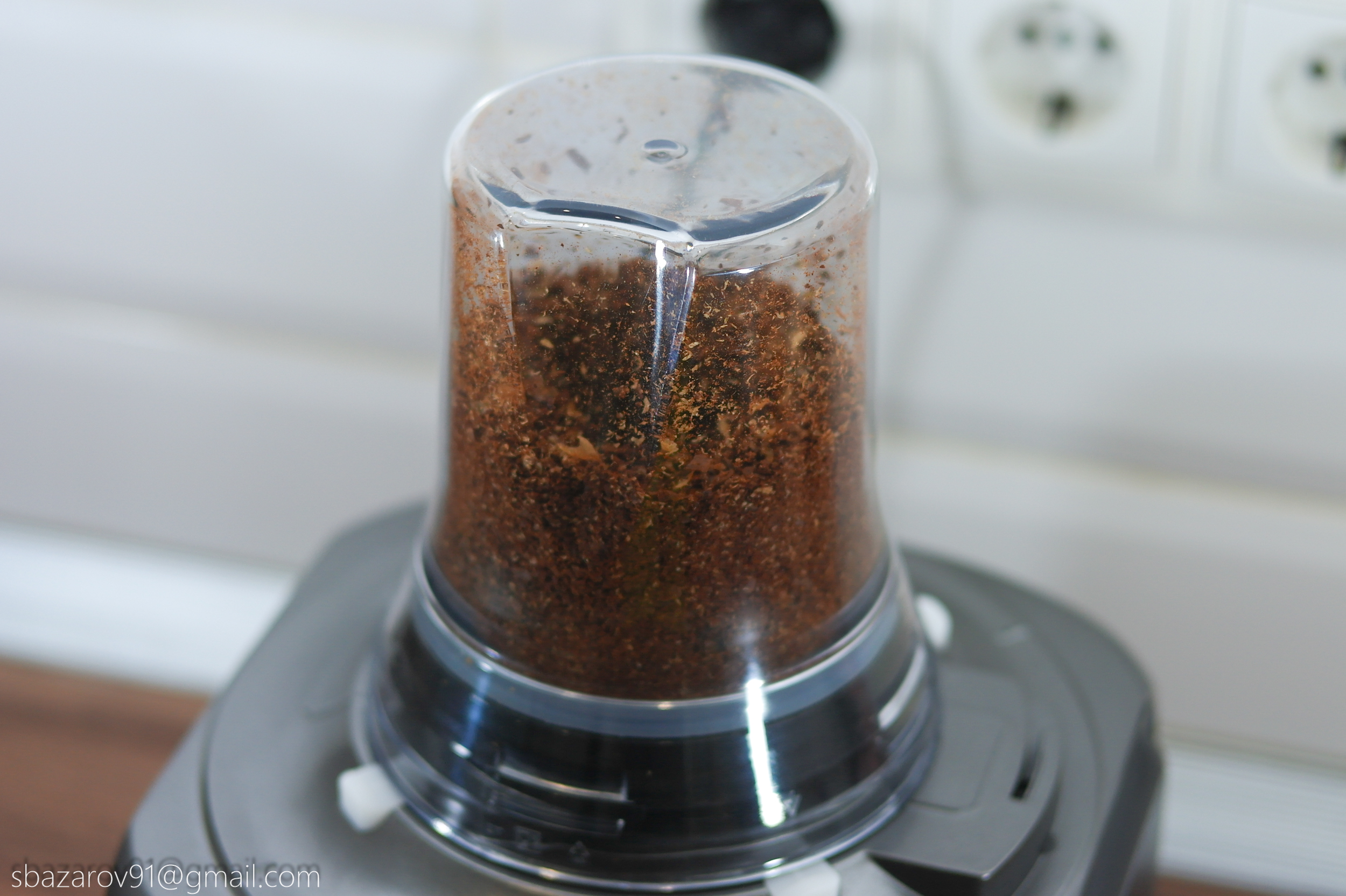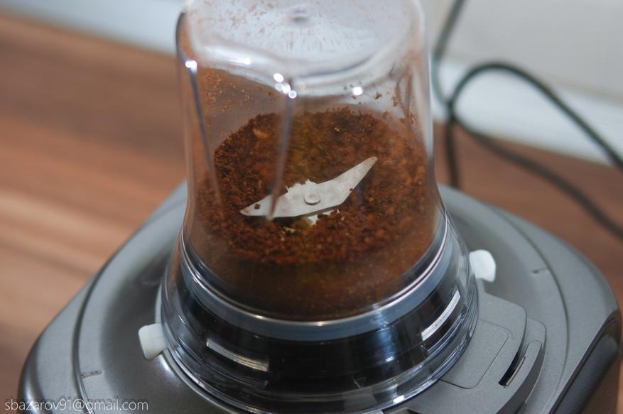 Пятым и заключительным тестом выступает насадка-кофемолка, позволяющая измельчать кофейные зерна до различного состояния. Засыпаем 50 грамм кофейных зерен, включаем импульсный режим и запускаем комбайн. Спустя 10 секунд масса уже была однородной, после чего достаточно засыпать её в кофемашину и приготовить горячий кофе.