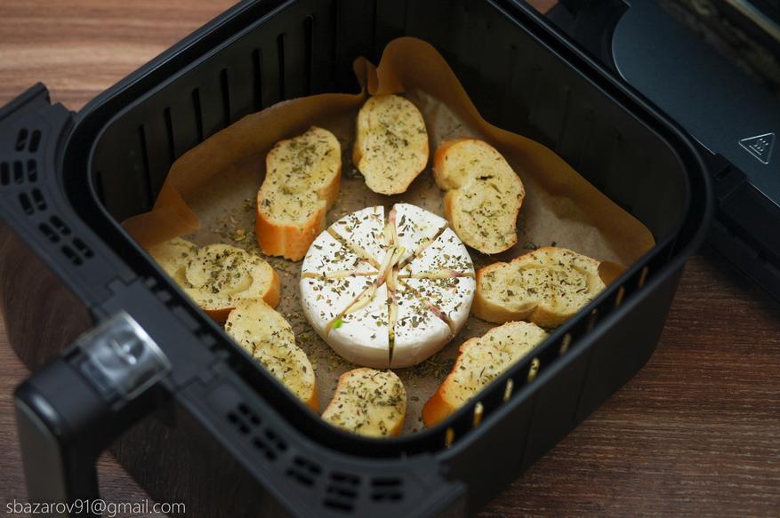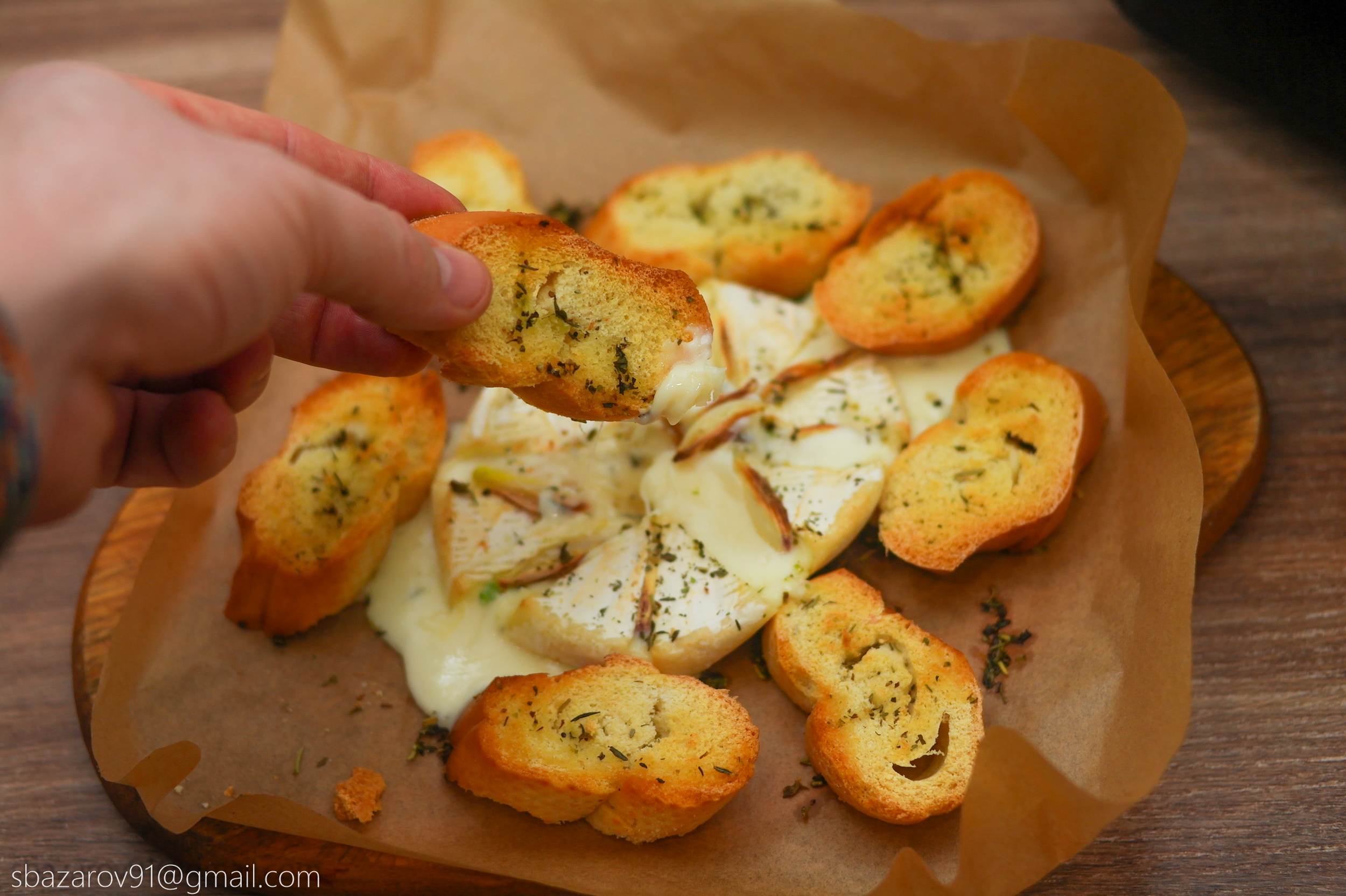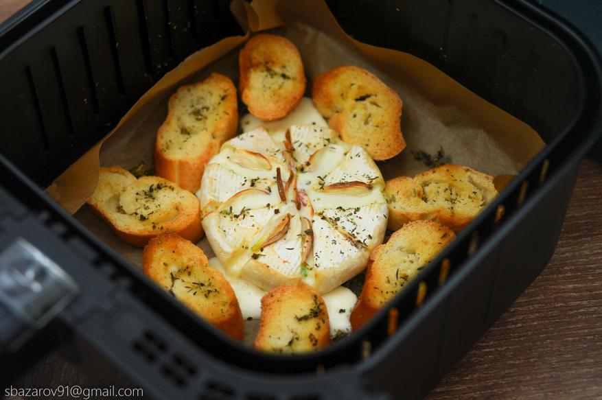 Еще одна быстрая закуска, которую можно приготовить в аэрогриле и это мягкий сыр с белой плесенью с чесноком и свежим багетом. Горячий, расплавленный сыр с благородной плесенью с хрустящим багетом, приправленный чесноком и прованскими травами — это любовь с первого укуса. Аэрогриль делает тосты идеально хрустящими снаружи и мягкими внутри, а сыр нежным и тягучим. Идеальная закуска за 10 минут. А еще можно добавить томаты черри и тогда блюдо получится еще более сытным.