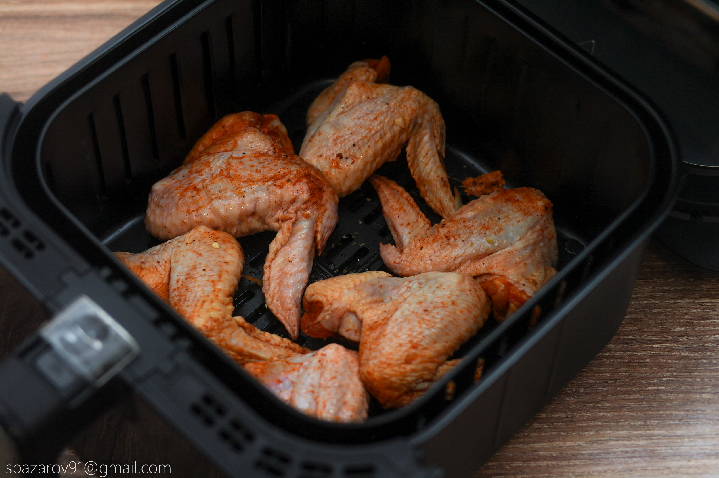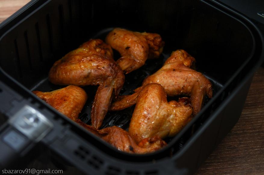 Мы уже убедились, что аэрогриль одинаково хорошо справляется как с сосисками, так и с нежными сырными палочками. Но настоящая проверка для горячего воздуха — это, конечно, куриные крылышки. Здесь важна золотистая корочка и прожарка до косточки, чтобы мясо легко от нее отделялось. Ставим готовый режим: 180 градусов и 20 минут. Через 10 минут крылышки приобретают аппетитный цвет, ну, а мы переворачиваем и даем им томиться до полной готовности.